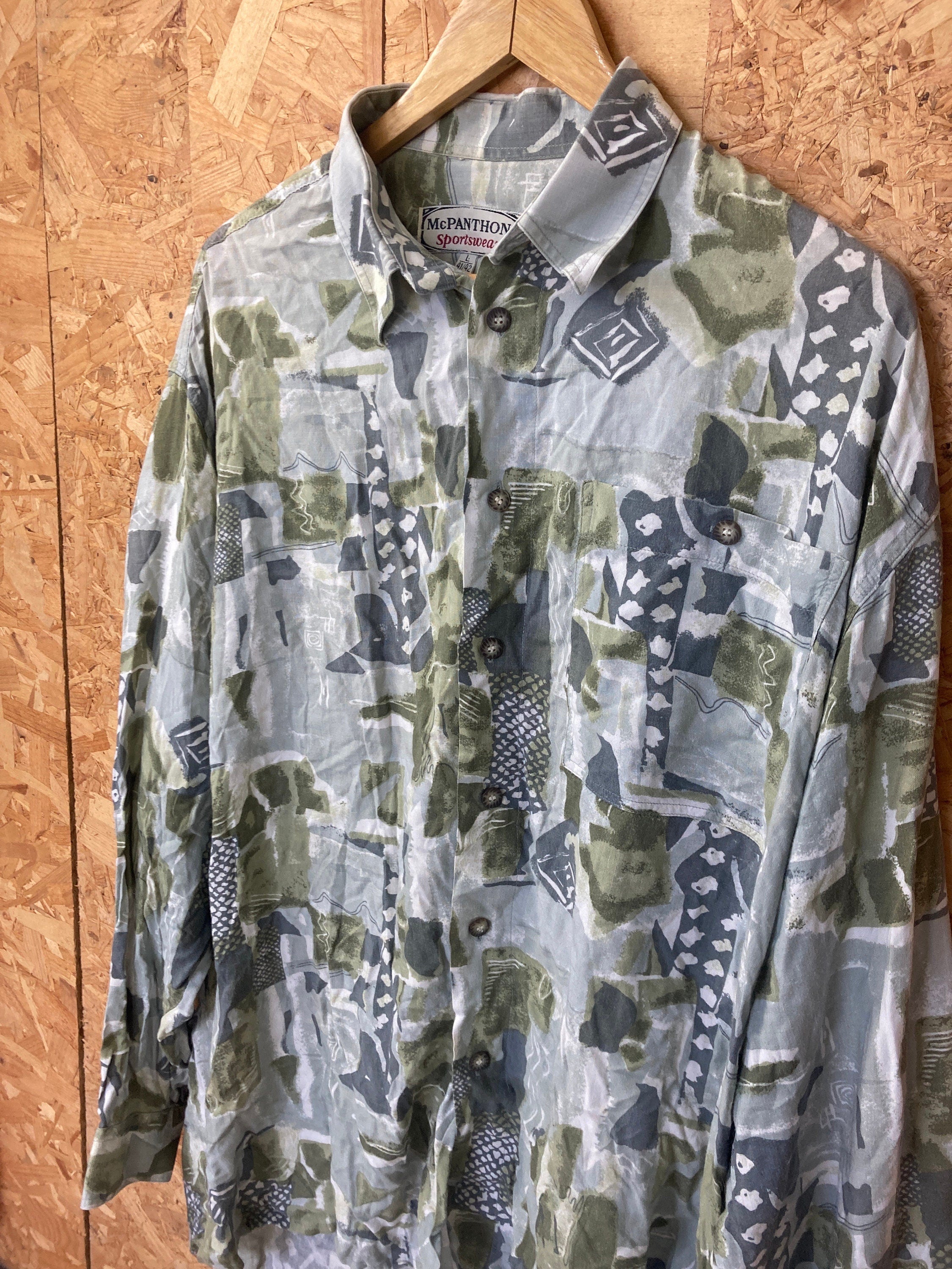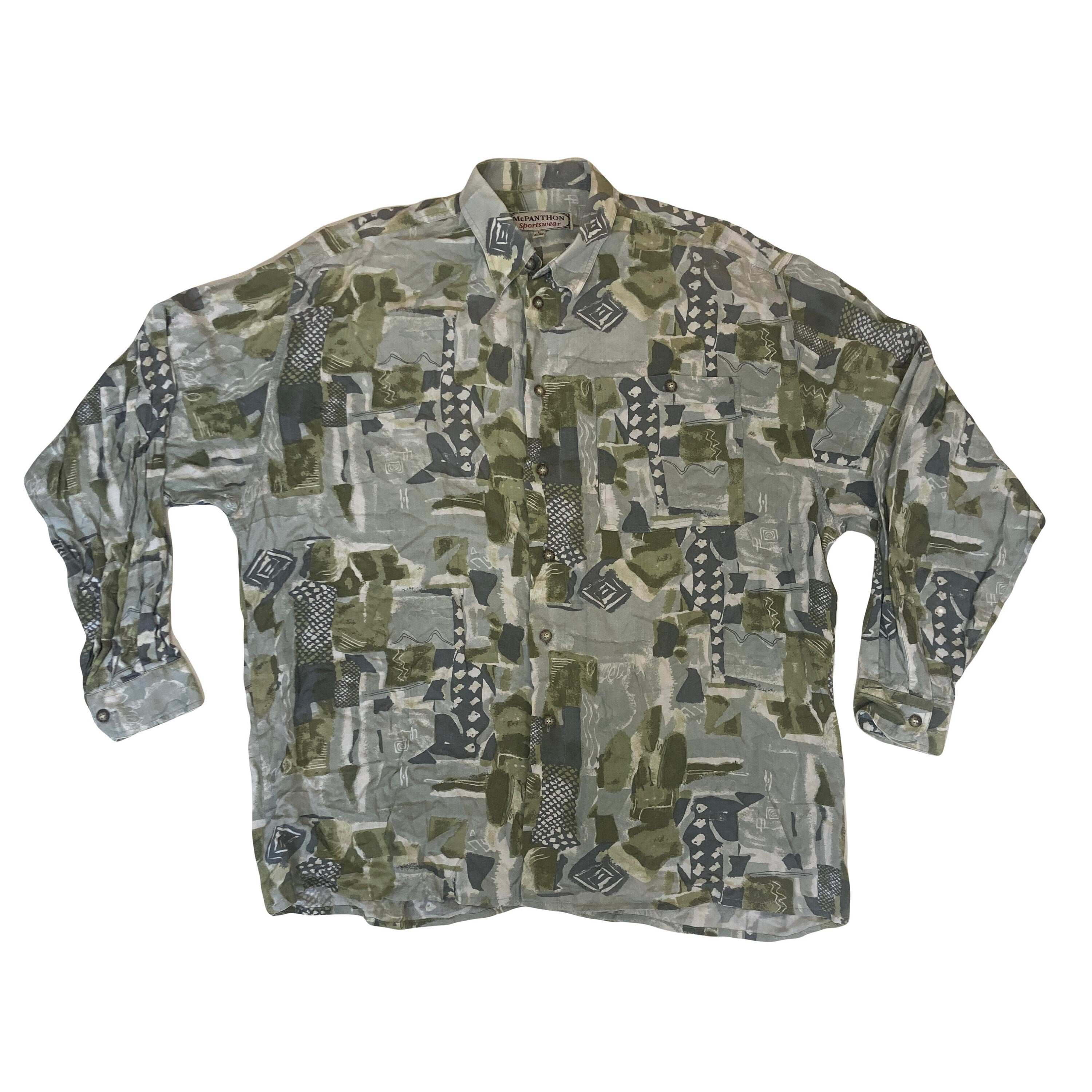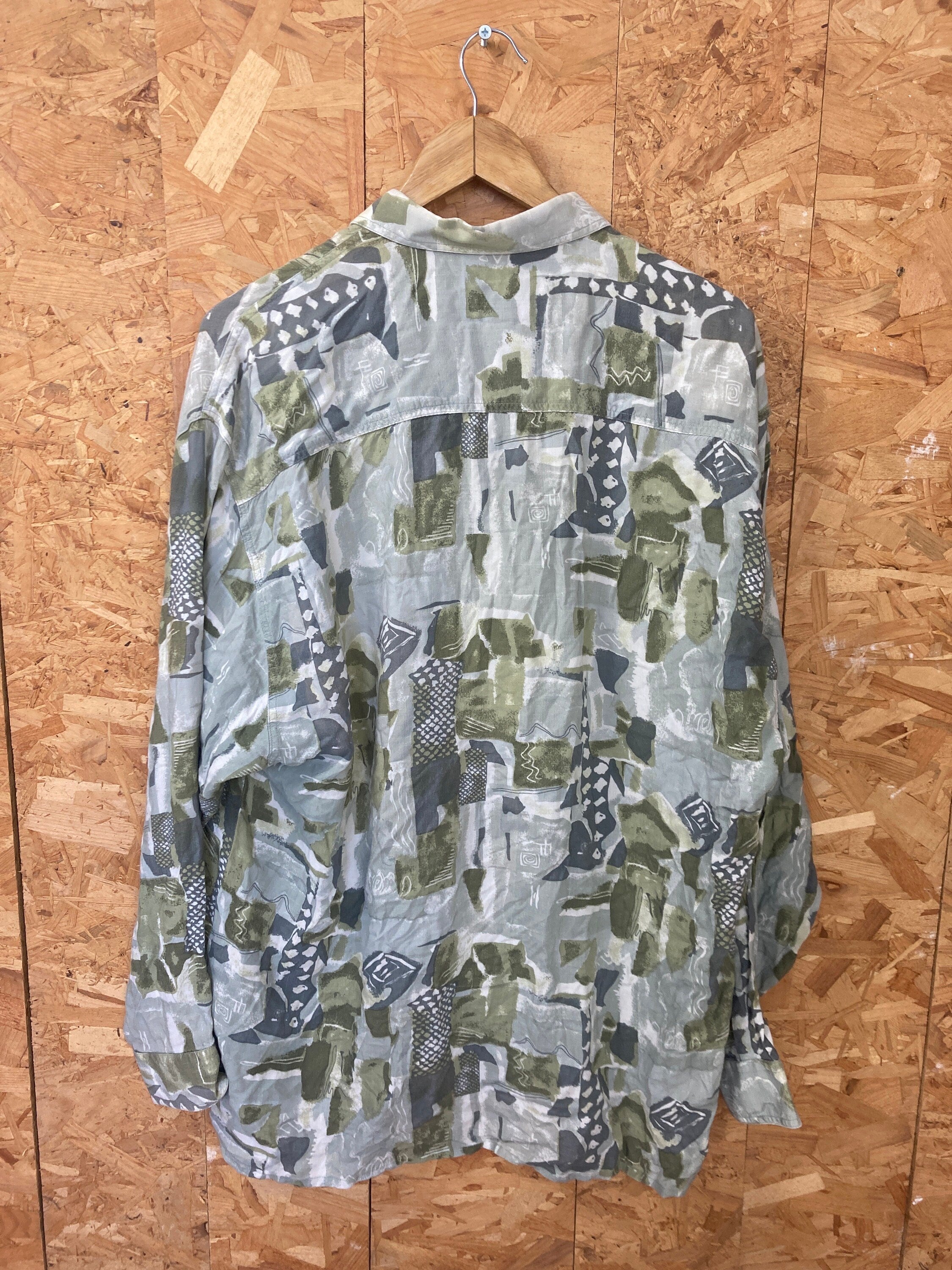 Vintage 90s ugly abstract scrapbook pattern grey grungy olive green festival long sleeve shirt size large