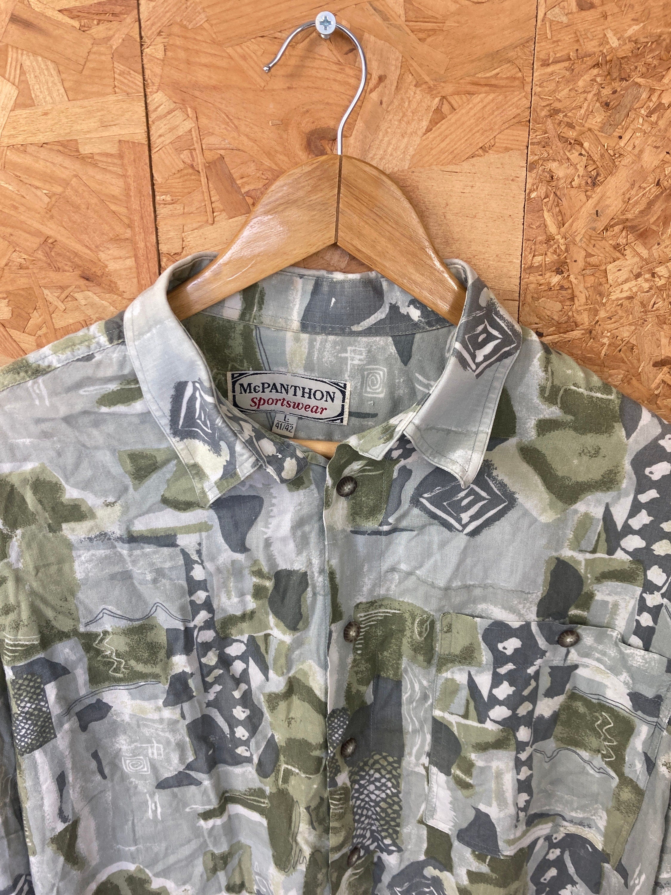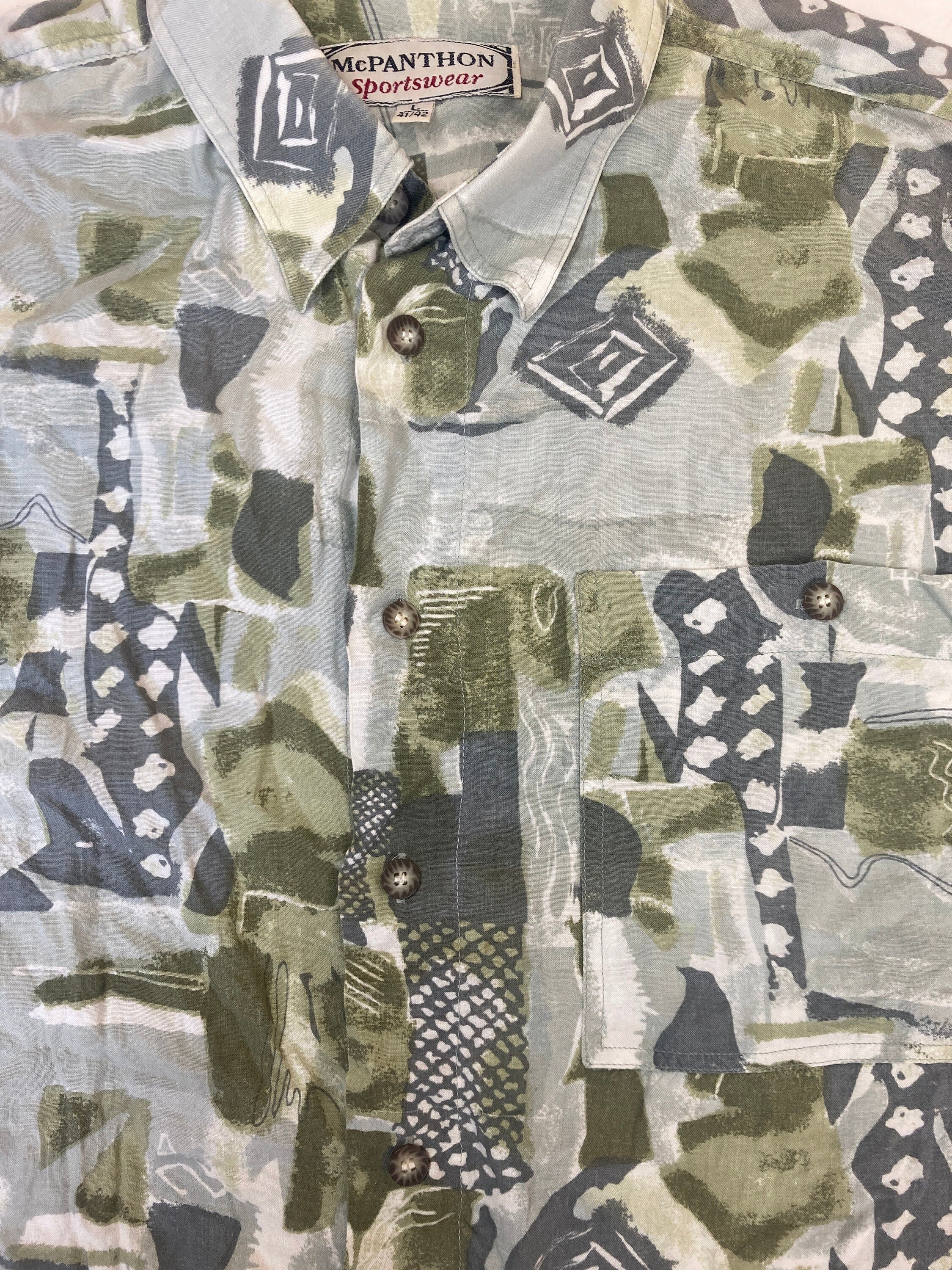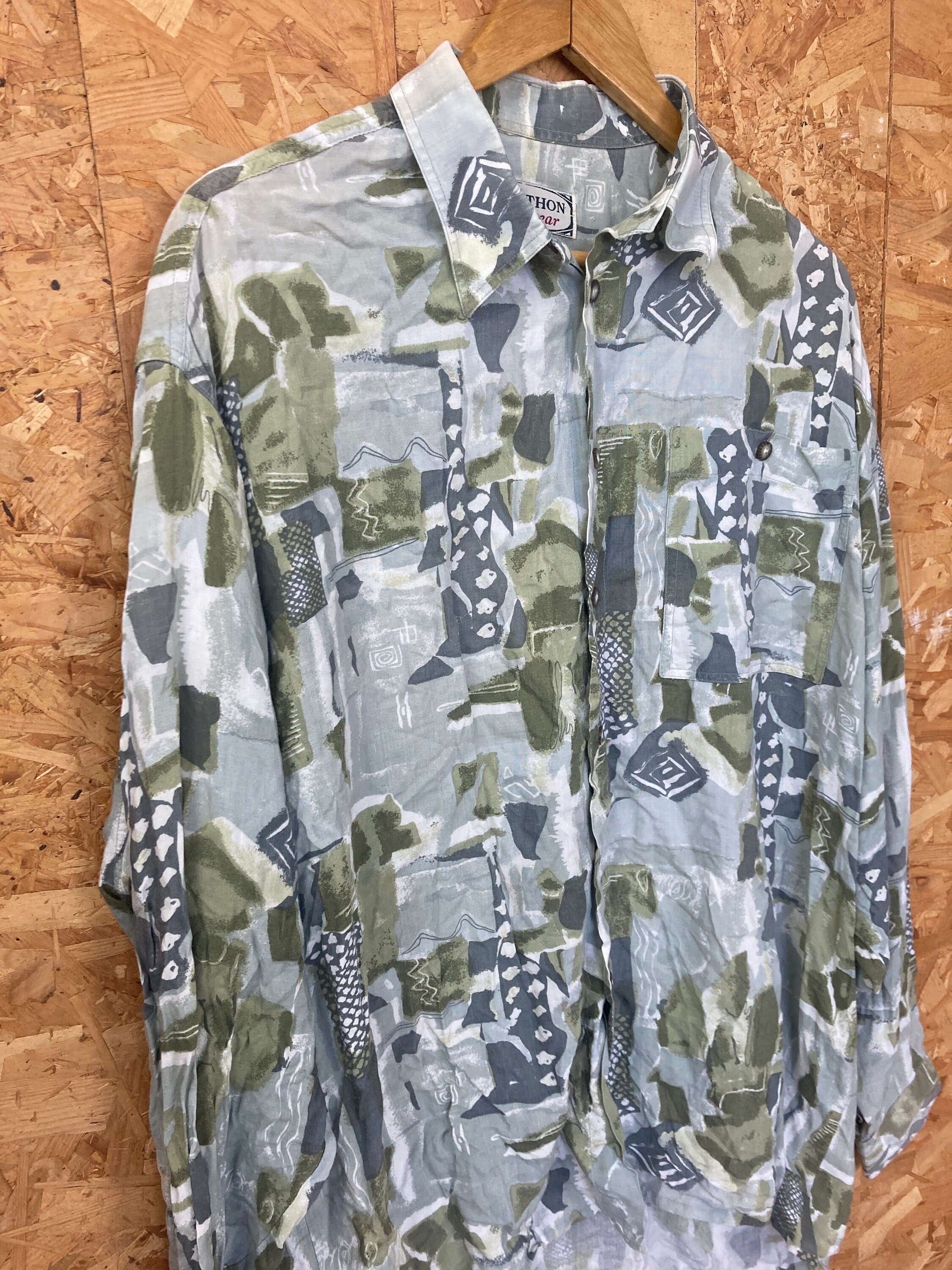 Vintage 90s ugly abstract scrapbook pattern grey grungy olive green festival long sleeve shirt size large