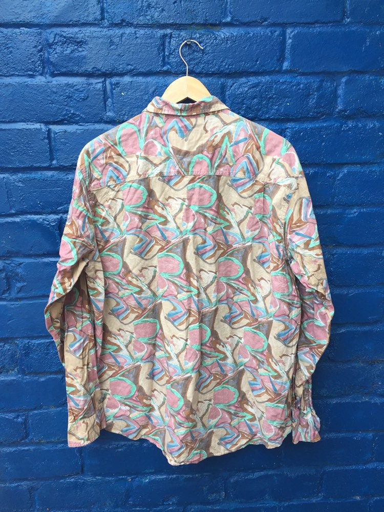 Vintage 90s ugly abstract water colour pastel shapes pink beige green blue party festival long sleeve cotton shirt size XL