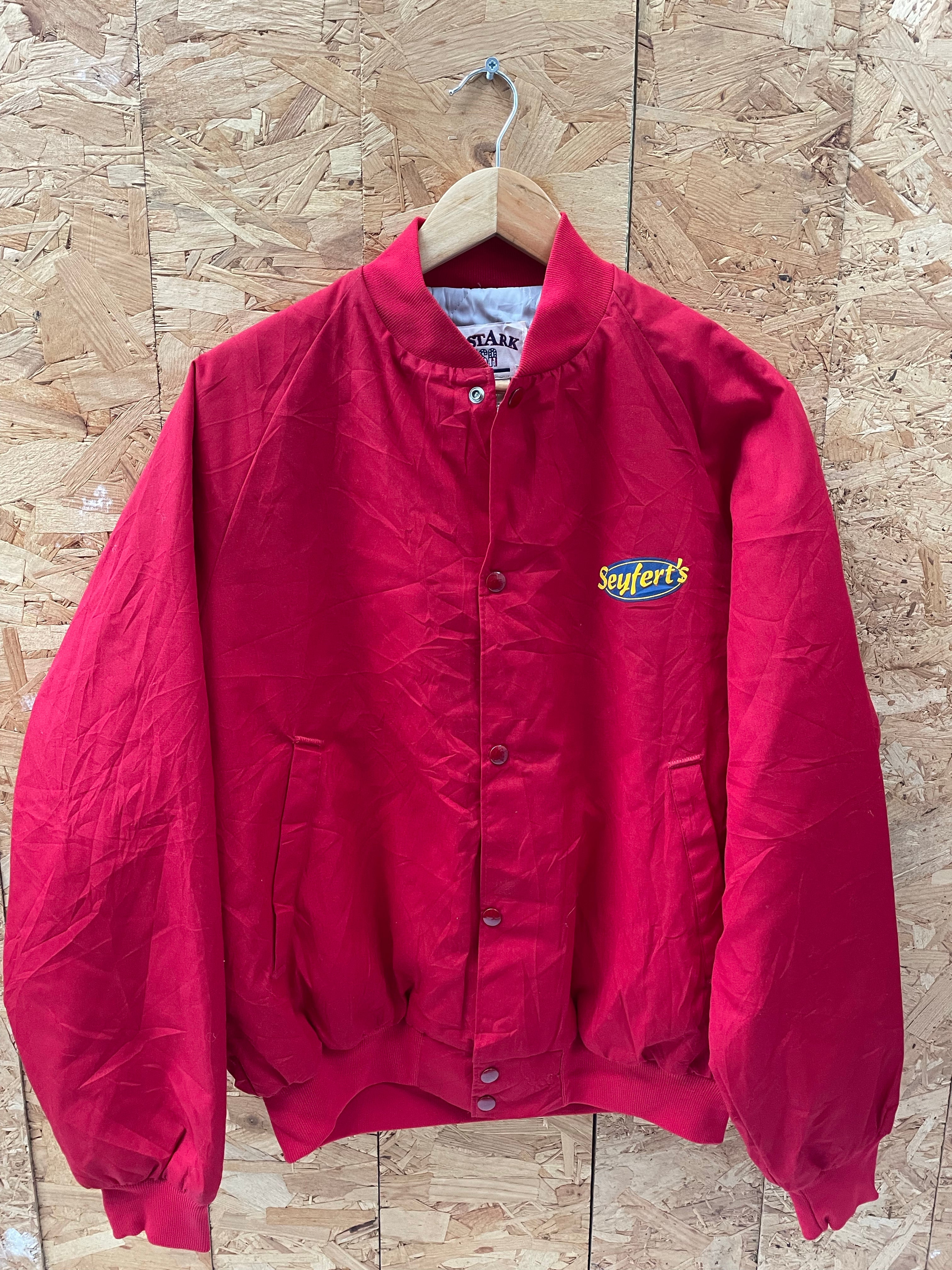 Vintage Westark Seyfert's red baseball jacket. Large size. Features a classic design with button closures and embroidered logo. Pre-owned, good condition. USA made Color: Red.