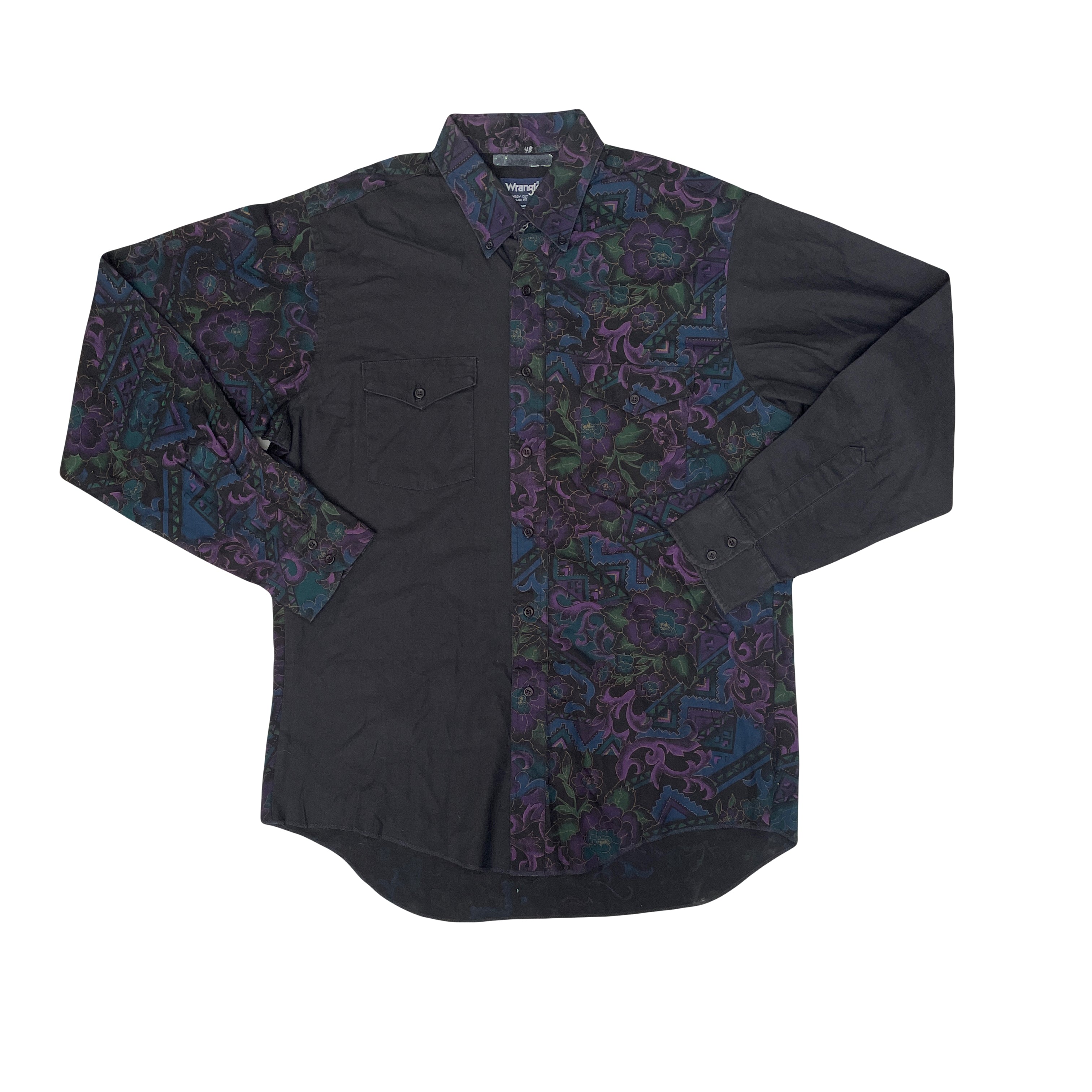 Vintage Wrangler long sleeve western shirt. X-Large Tall. Features a unique floral print on one side and solid black on the other. Excellent condition. Perfect for adding a touch of vintage style to your wardrobe. Color: Black, Purple, Green.