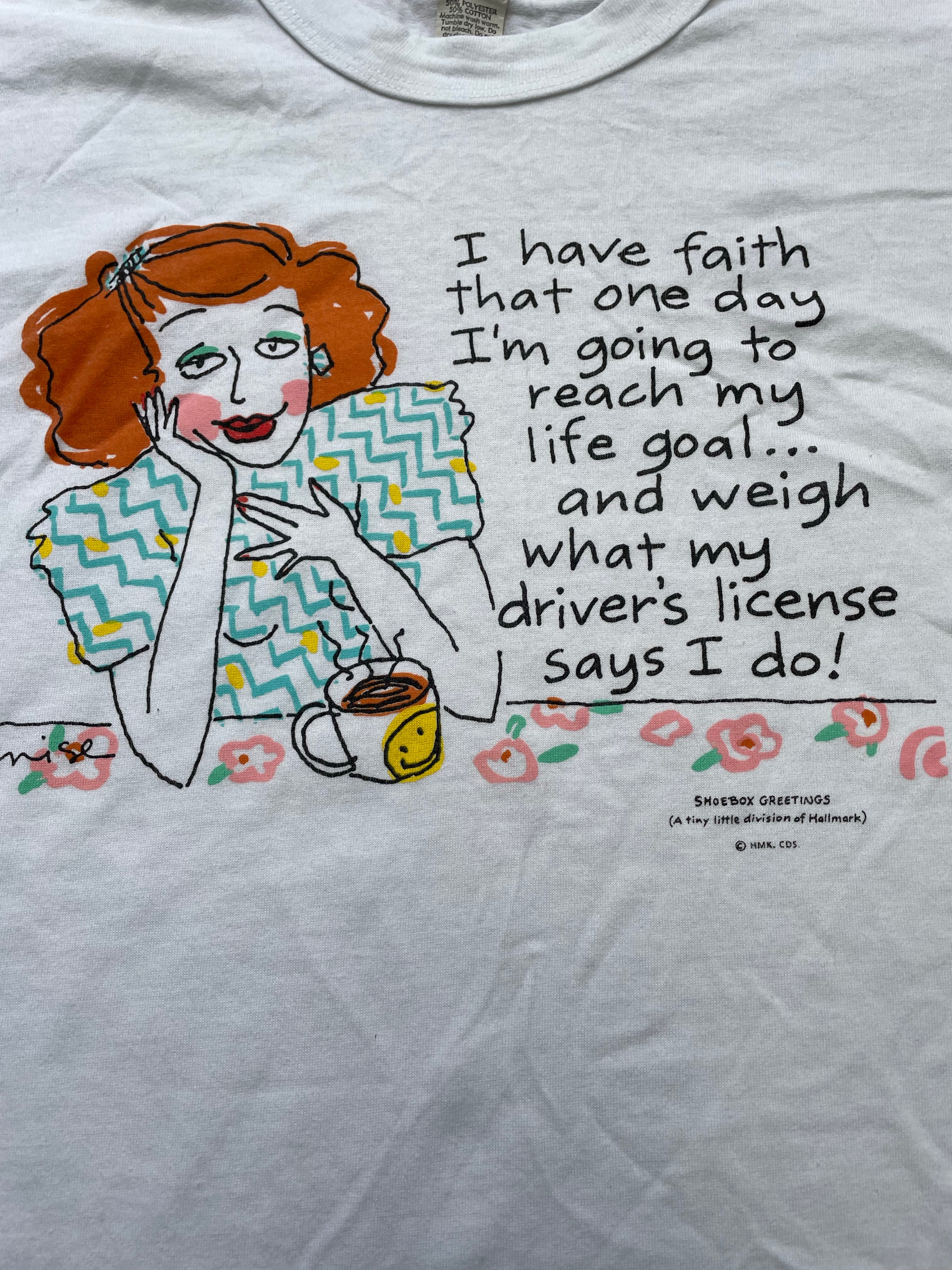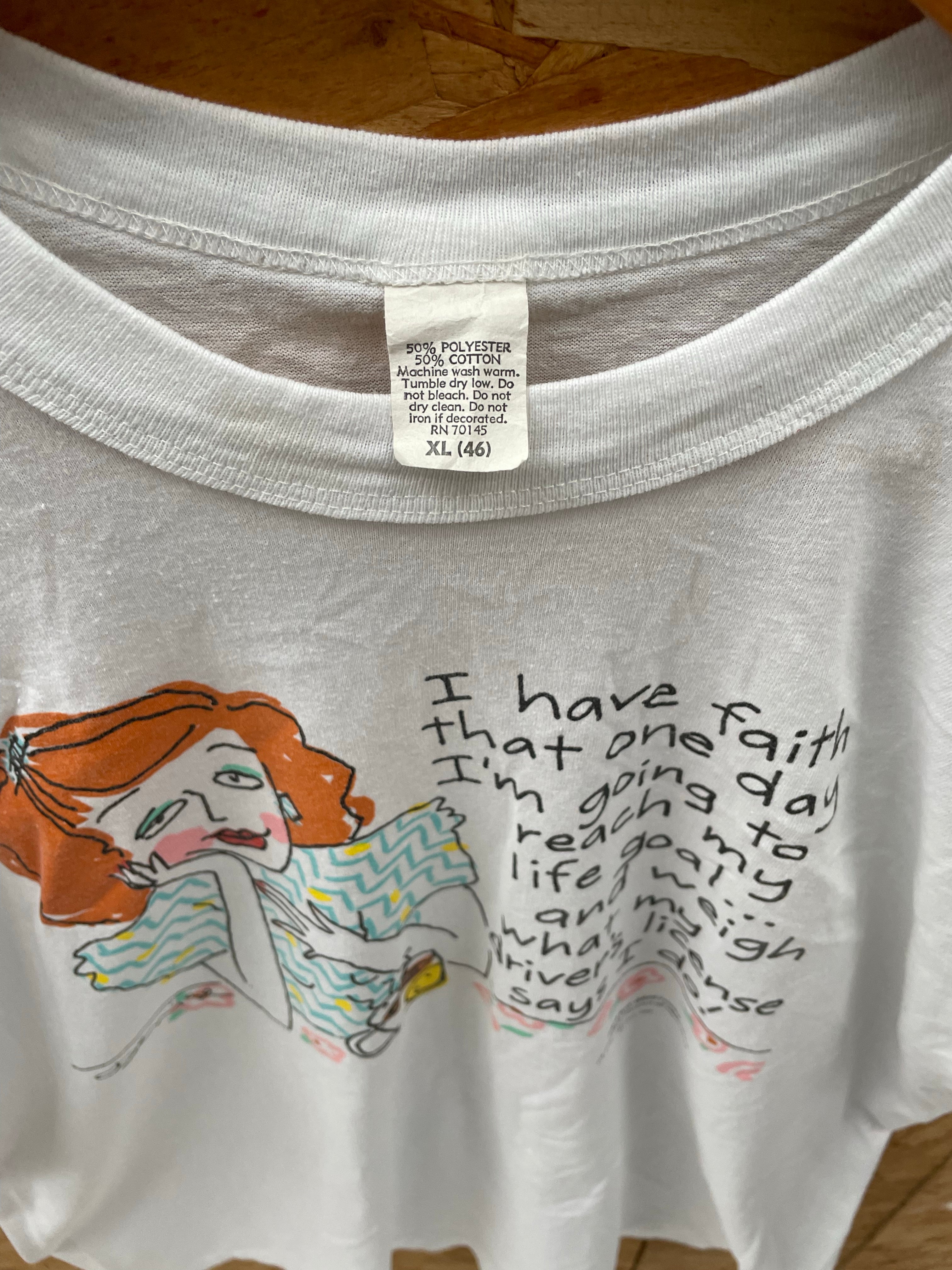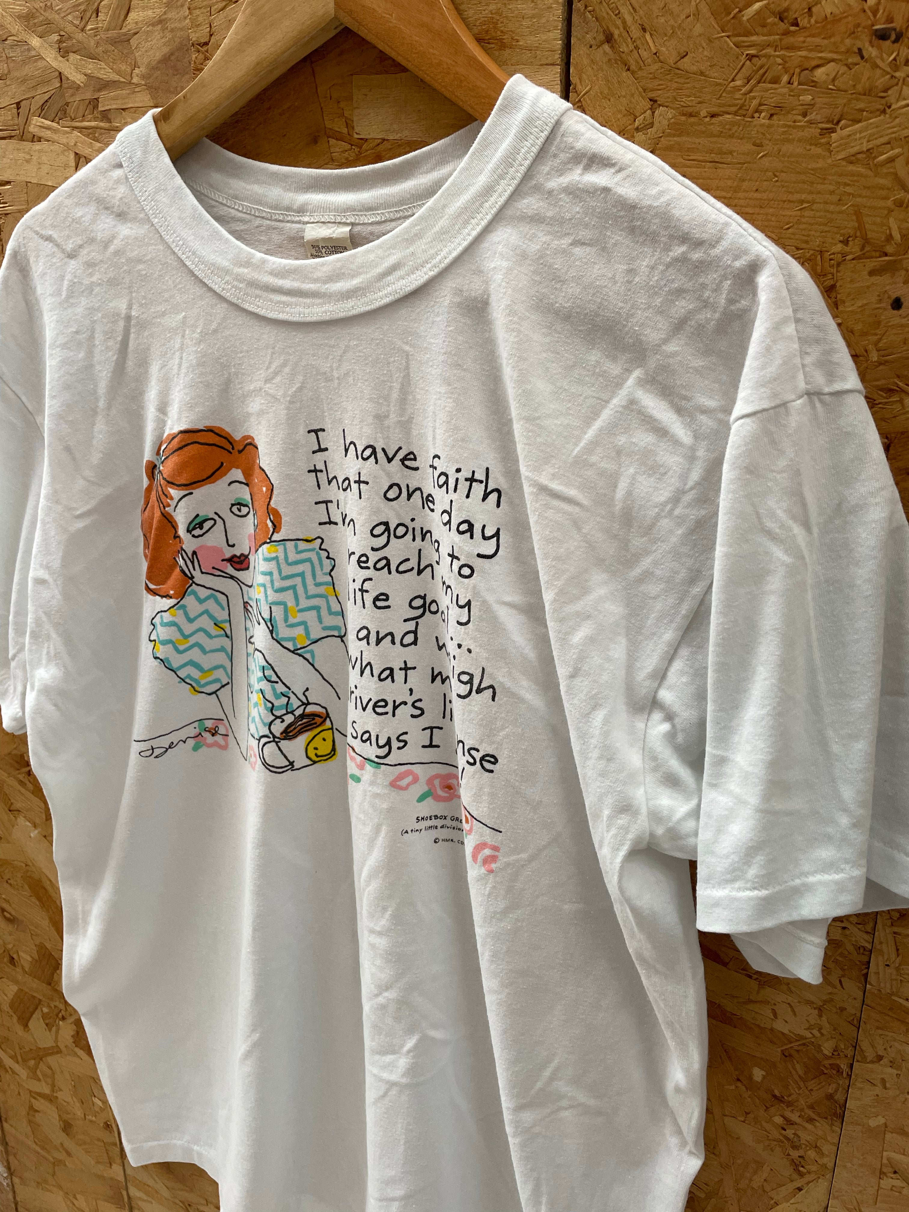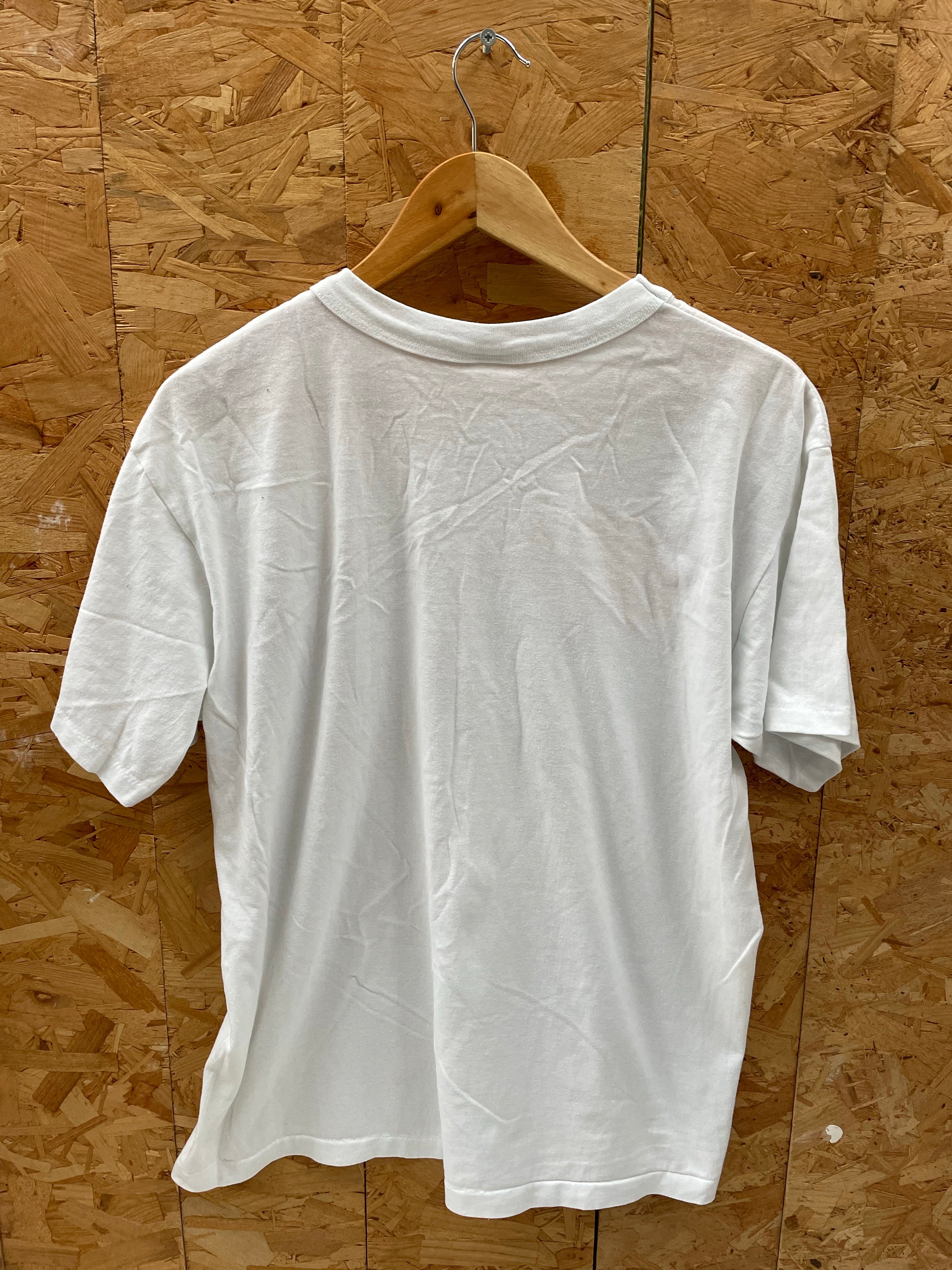 Vintage graphic t-shirt. Features a unique illustration and text print on a white cotton tee. Size XL. Great condition, shows minor wear. Color: White.