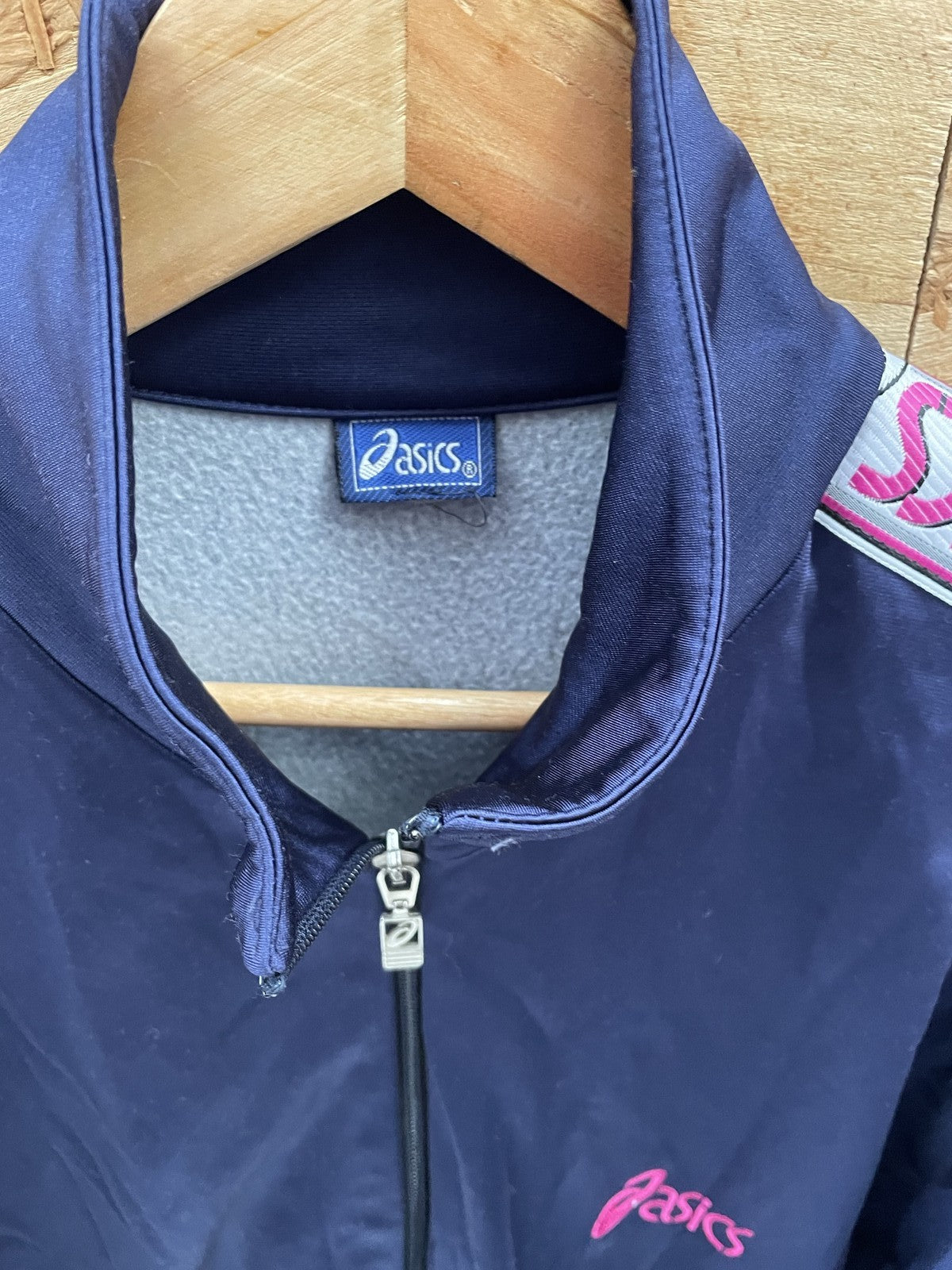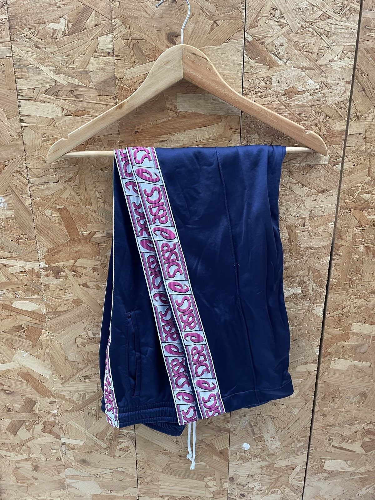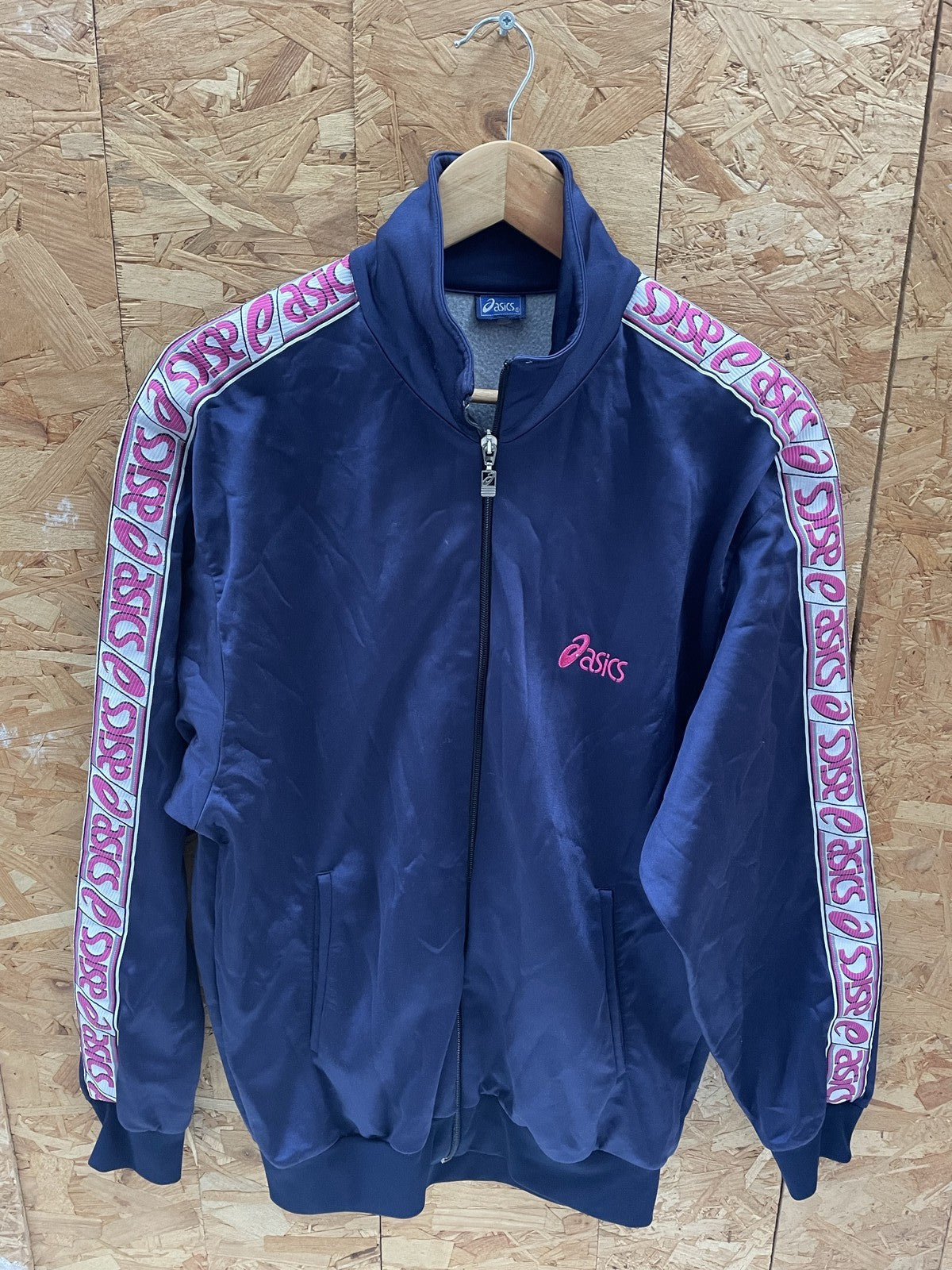 Vintage Asics tracksuit set featuring a navy blue track jacket and matching pants. Both pieces have the iconic Asics logo in pink and a repeating Asics logo tape detail on the sleeves and pant legs. This set appears to be from the 90s or early 2000s and is in good used condition with no visible major flaws. Perfect for athletic wear or casual styling.