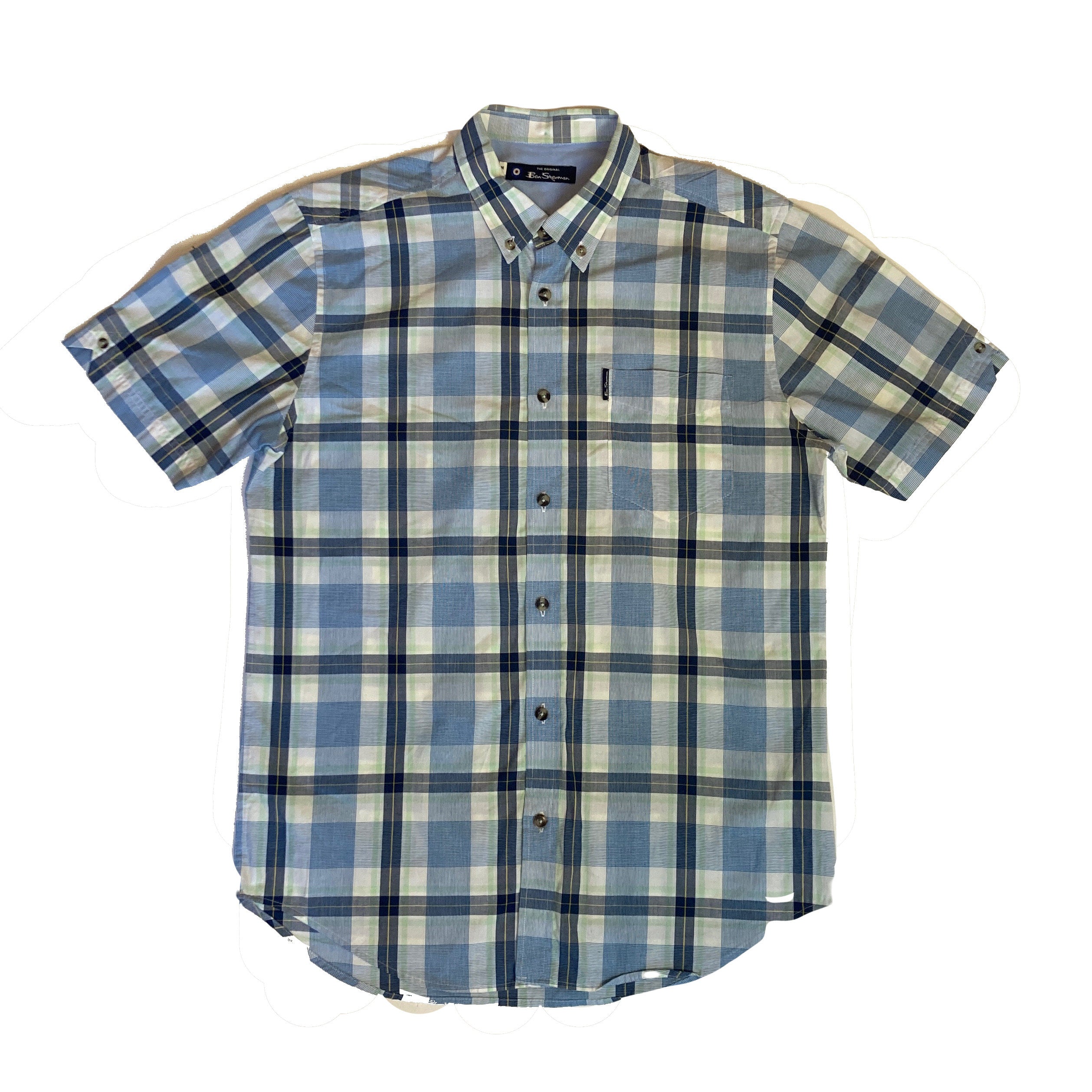 Vintage Ben Sherman light blue green tablecloth fine check short sleeve Mod skinhead retro punk shirt size medium