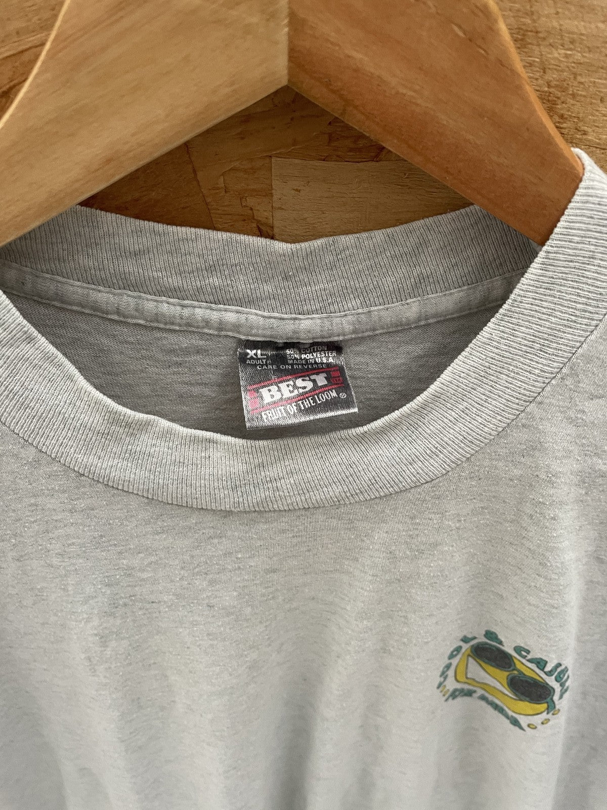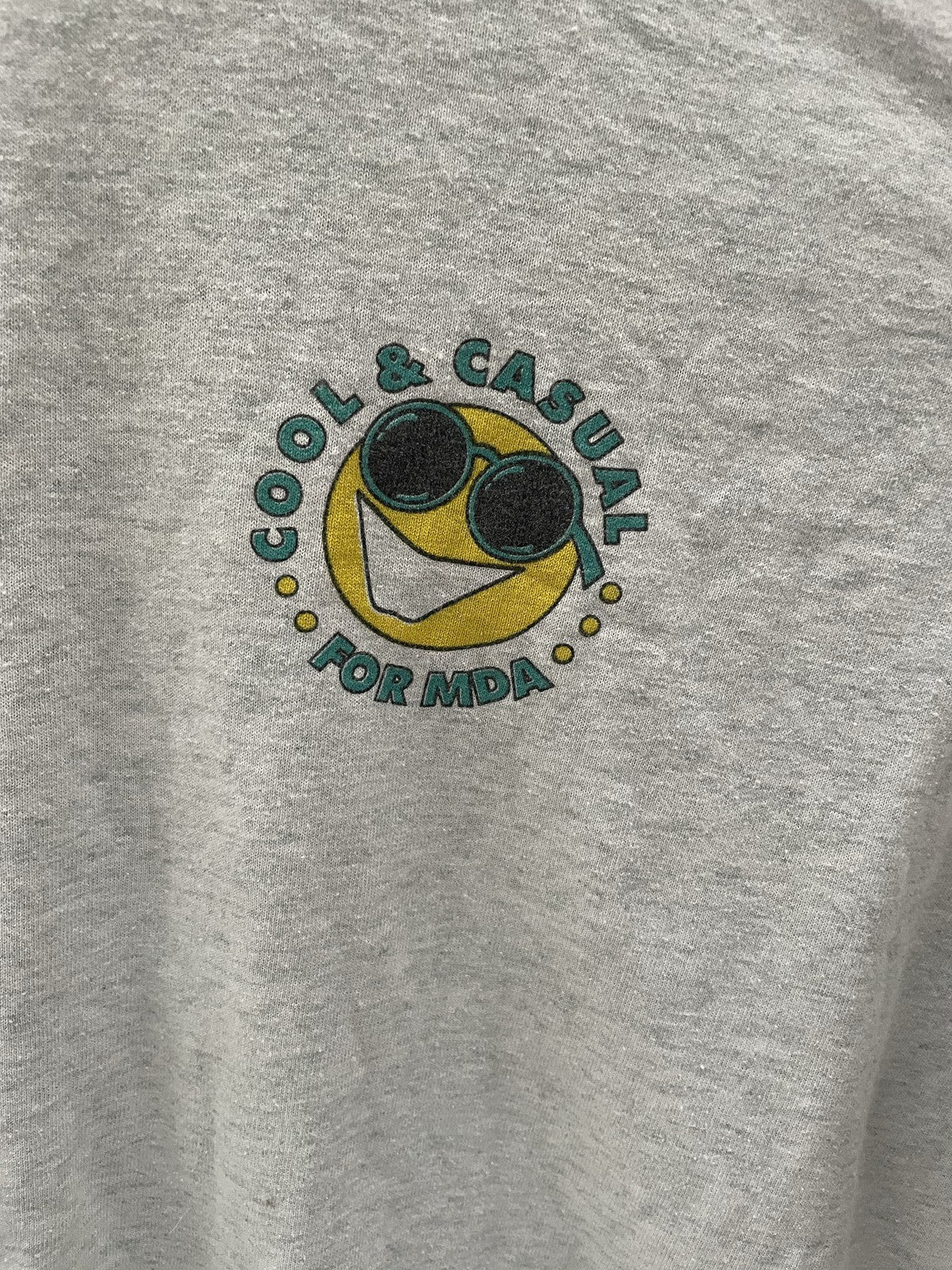Vintage BEST brand t-shirt in size XL. Gray color with a 'Cool & Casual For MDA' graphic. Made from a comfortable cotton blend, perfect for everyday wear. No visible signs of wear or damage.