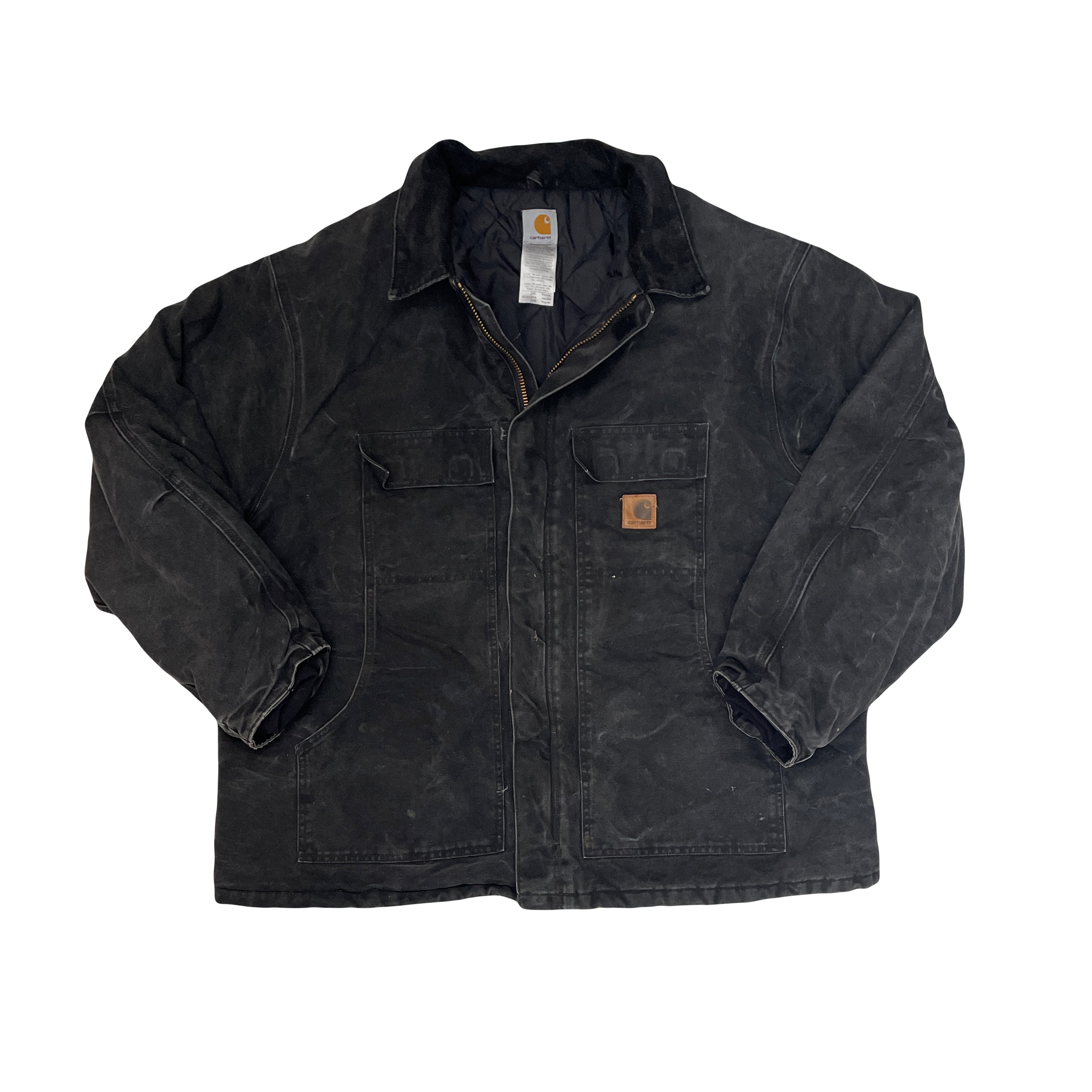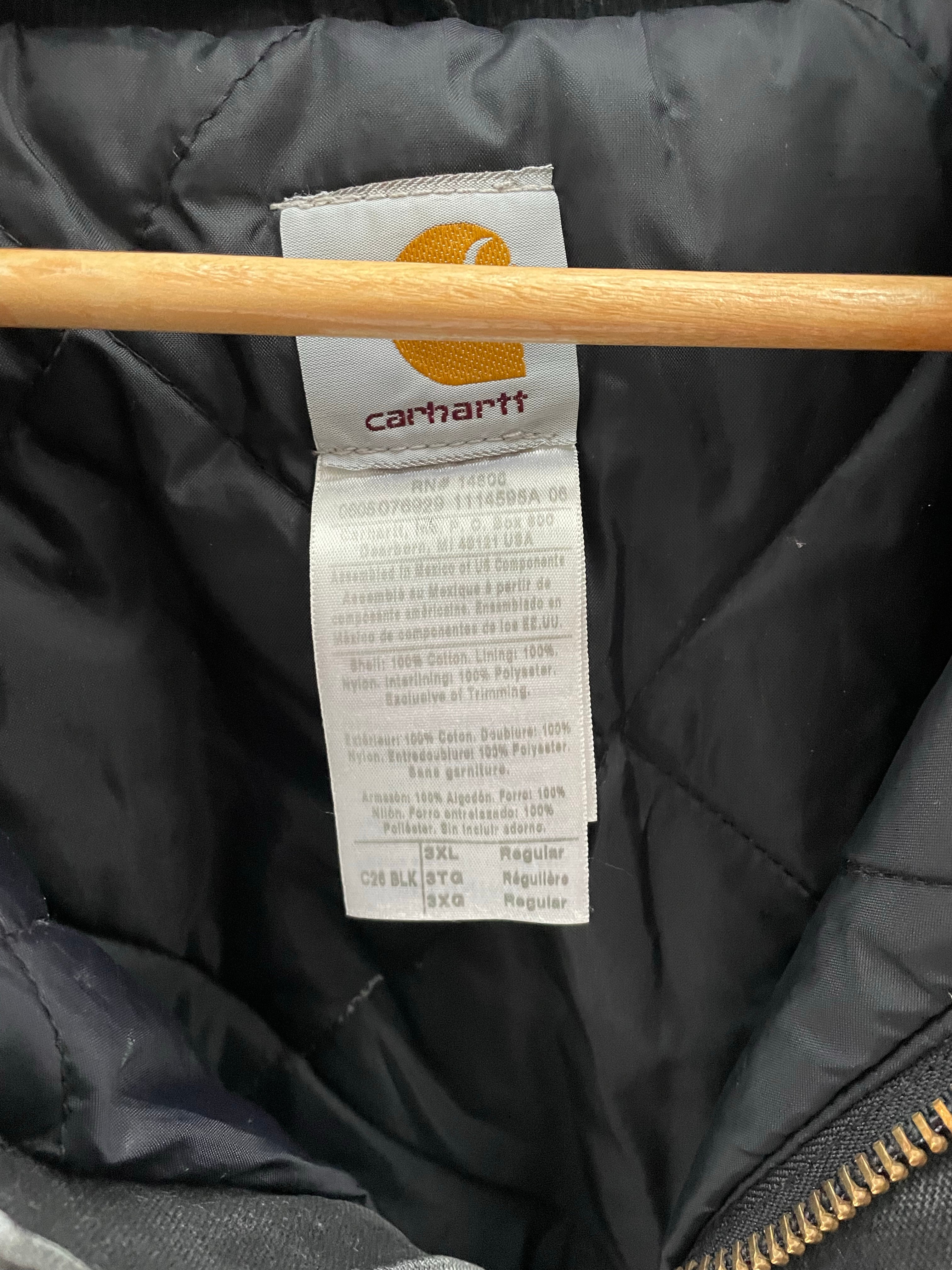 Durable Carhartt C26 BLK 3TG chore barn coat in black, size 3XL. Features a quilted lining for warmth, multiple pockets, and a classic workwear design. Ideal for outdoor work or casual wear. Excellent condition.