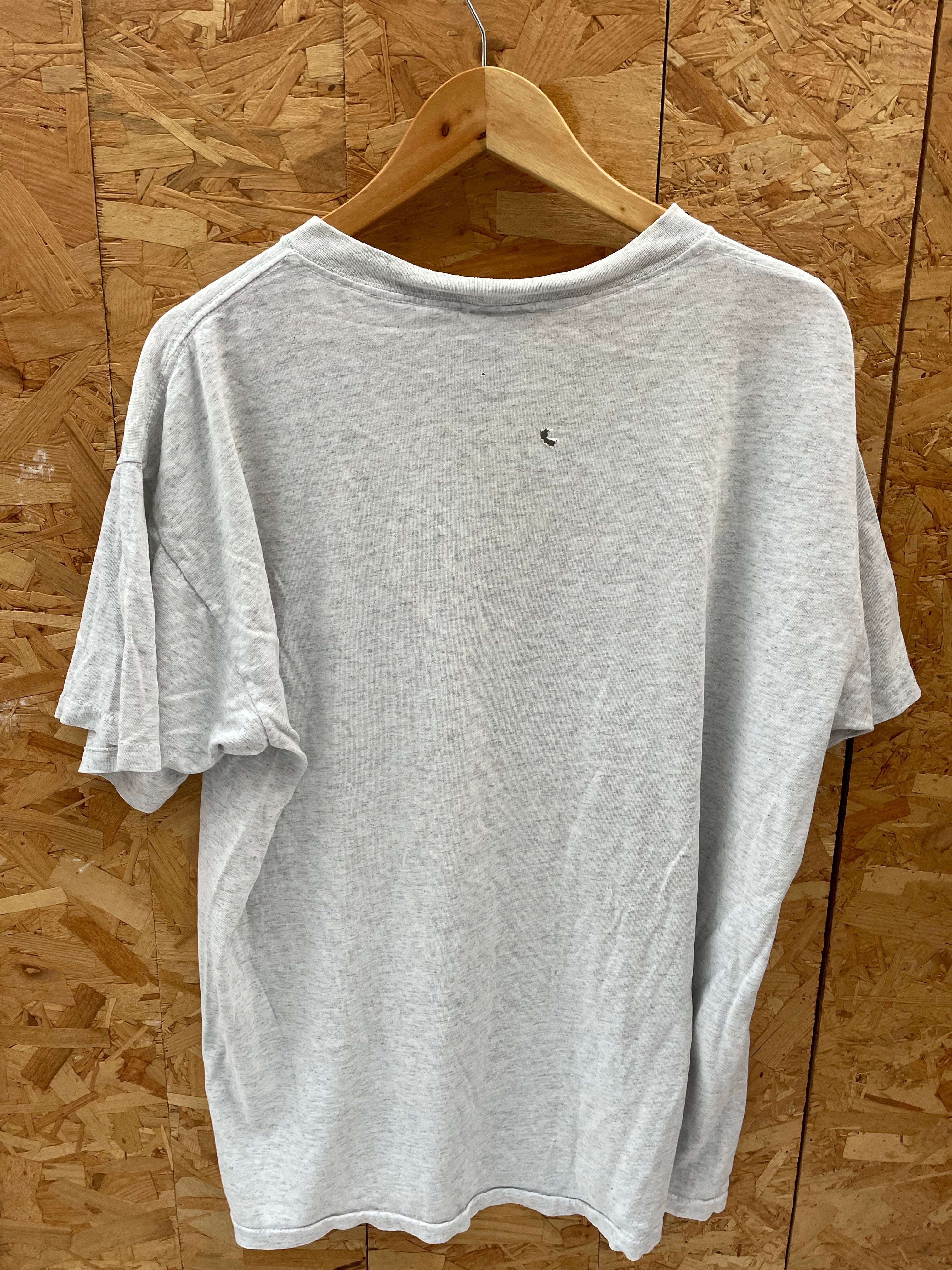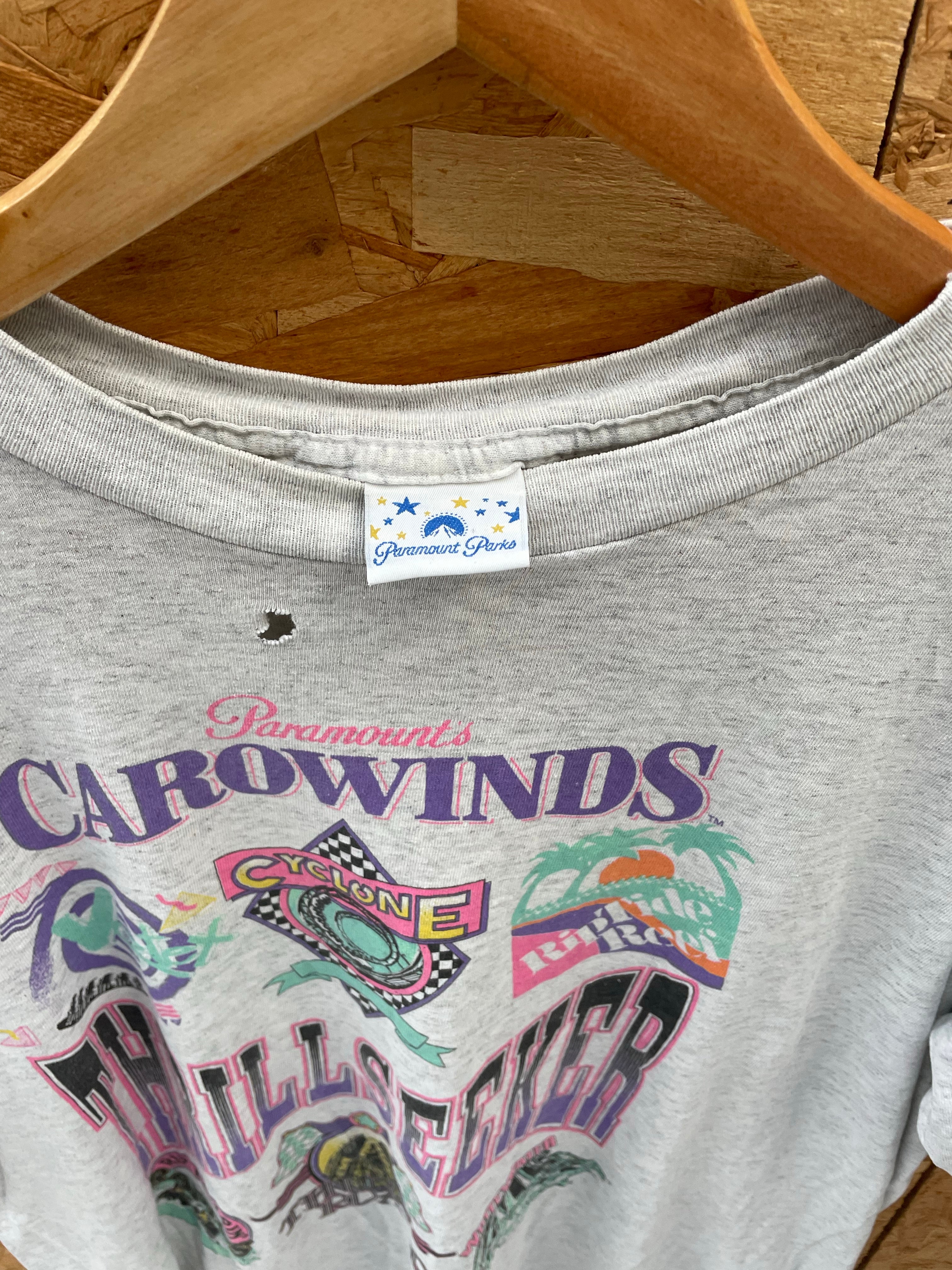 Vintage single stitch Carowinds Thrillseeker t-shirt from Paramount Parks. Features a retro 90s graphic with roller coaster and park attractions. Gray heathered fabric. A small hole is present near the collar both sides.