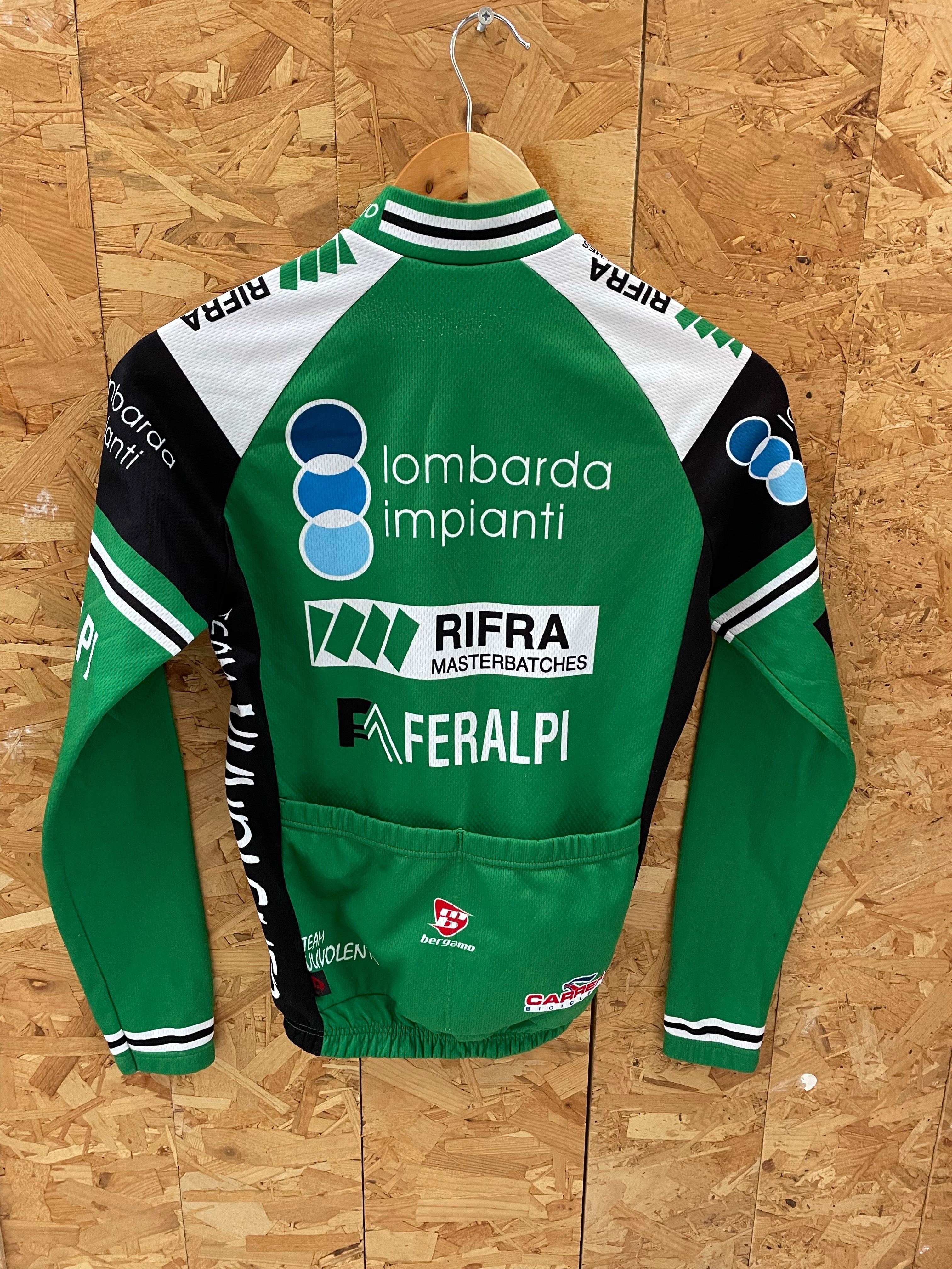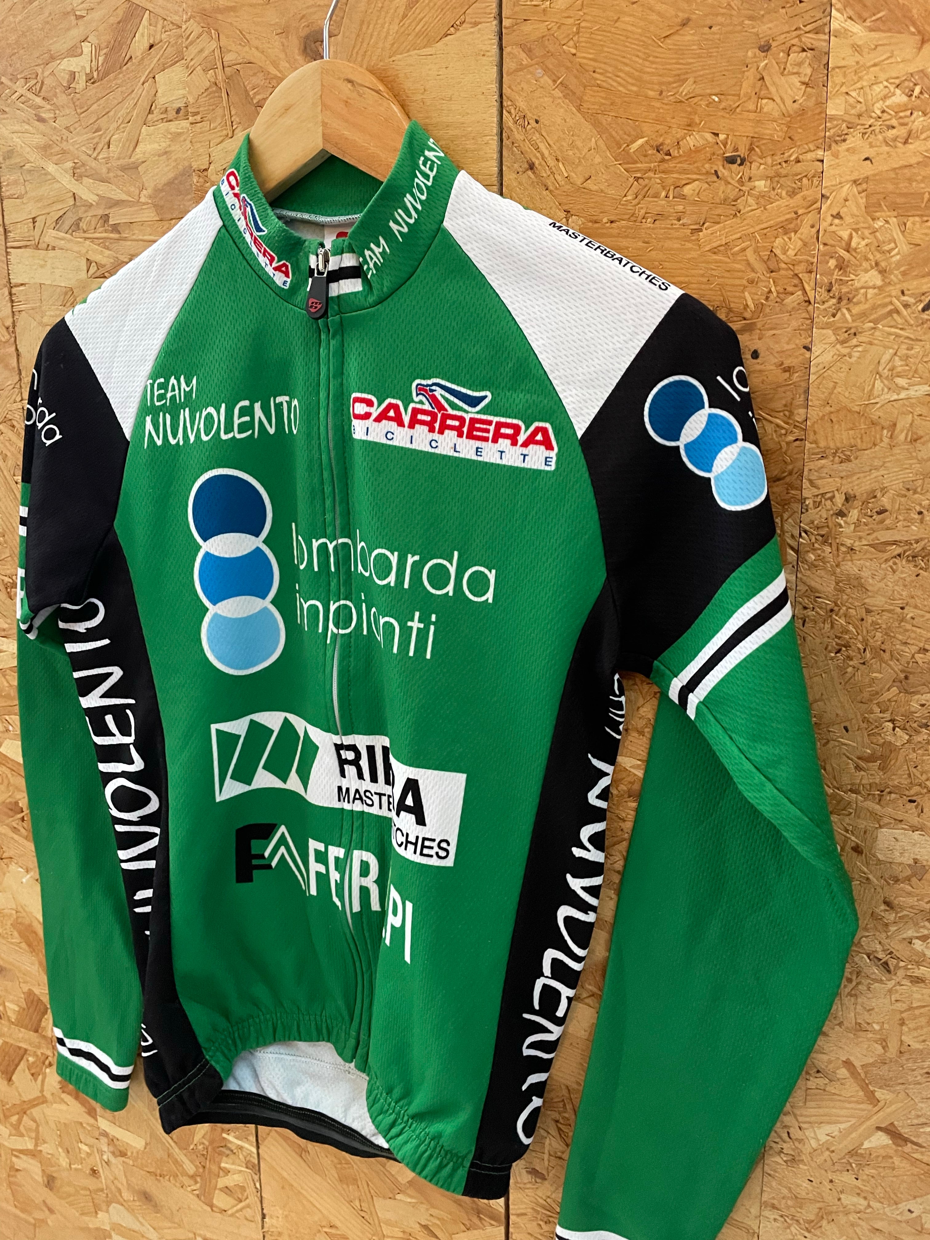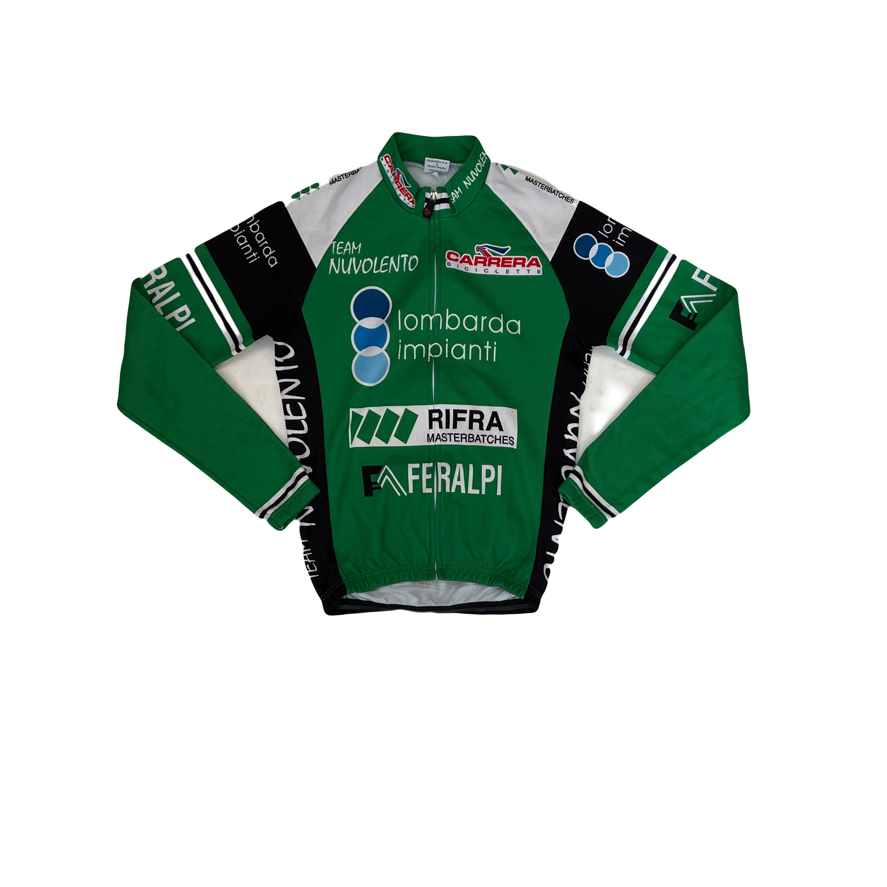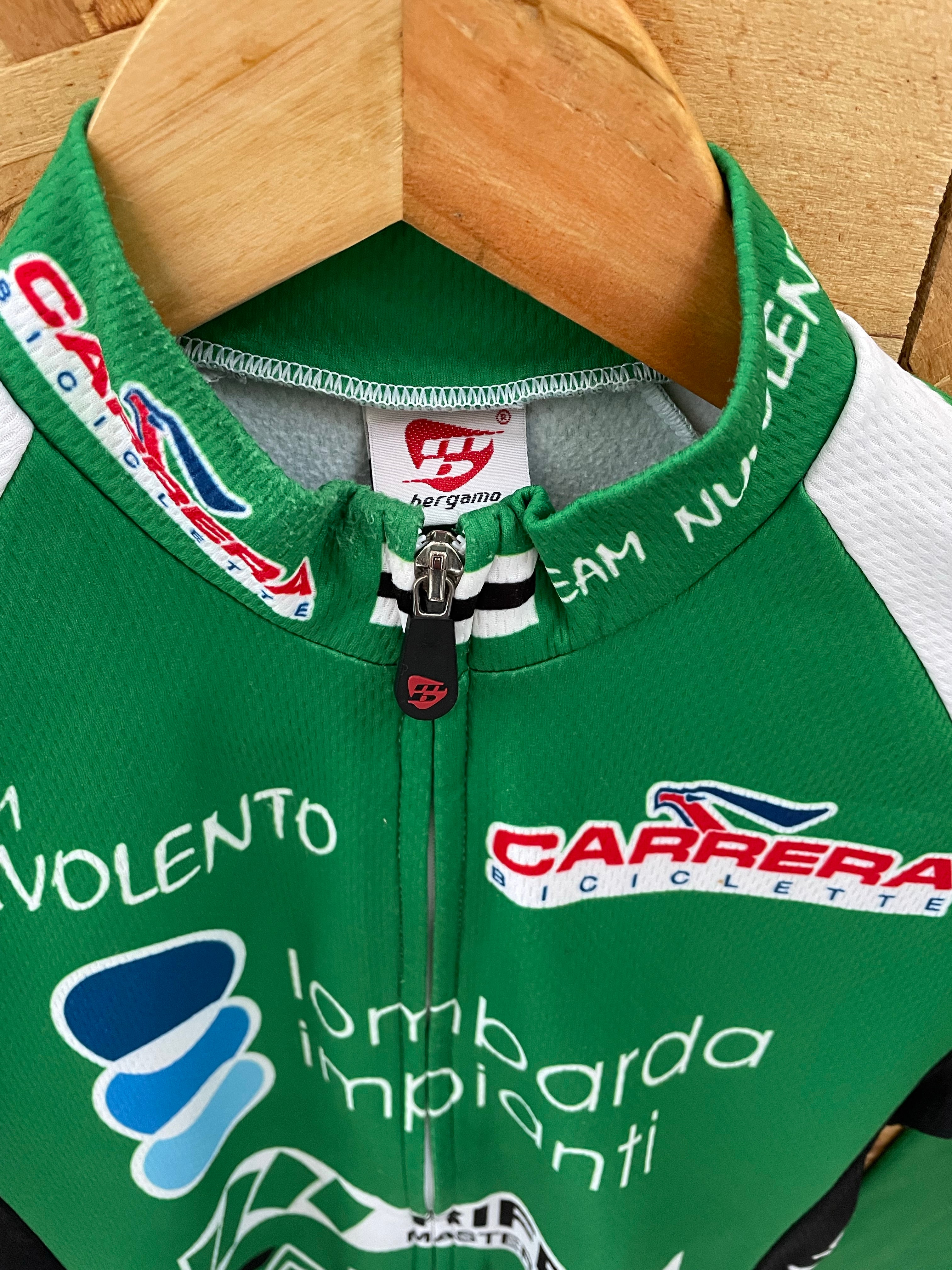 Vintage Carrera Biciclette cycling jersey for Team Nuvolento. Features a vibrant green color with black and white accents. Long sleeves, full zip closure, and multiple pockets on the back. Made for performance and style.