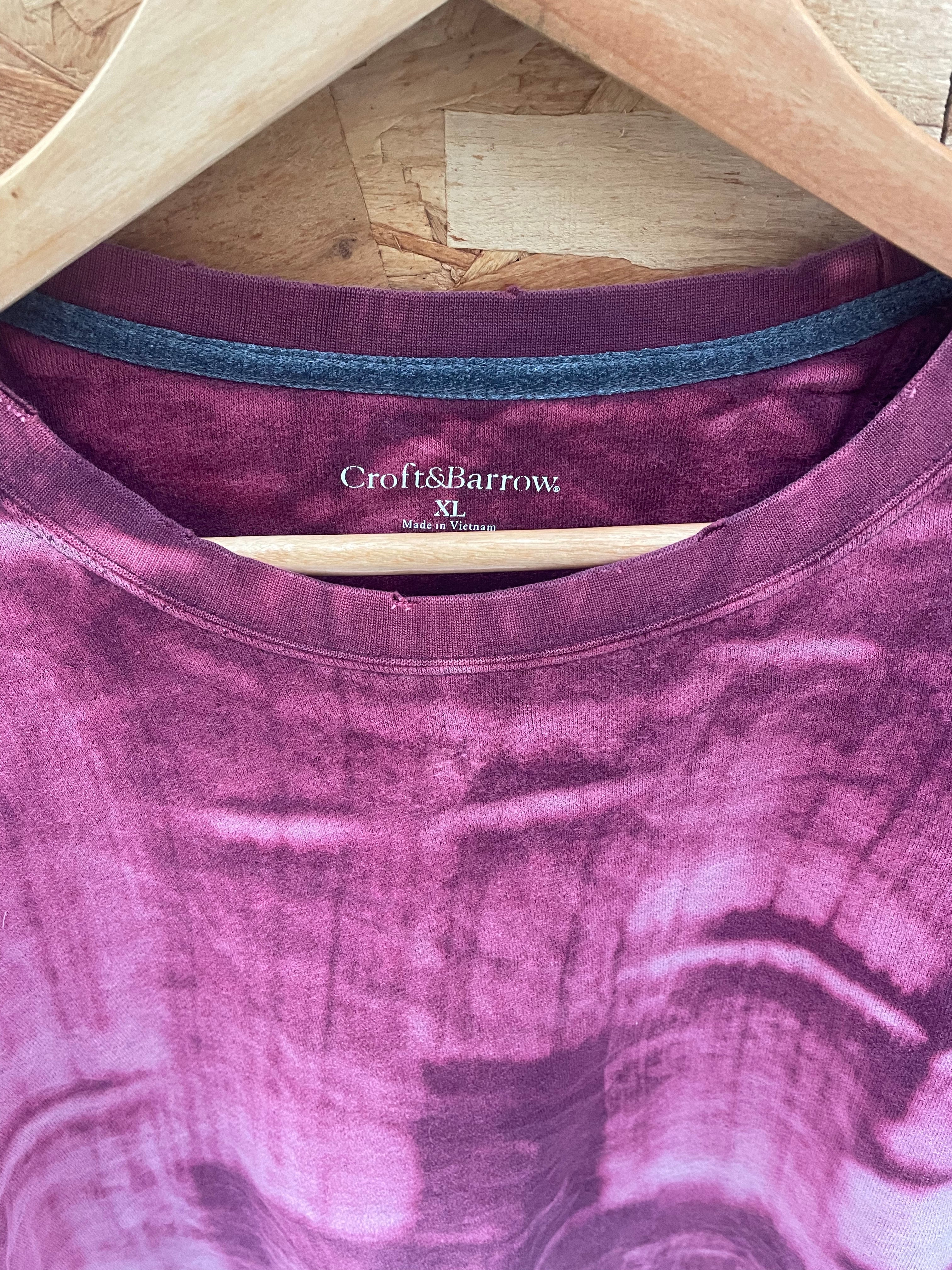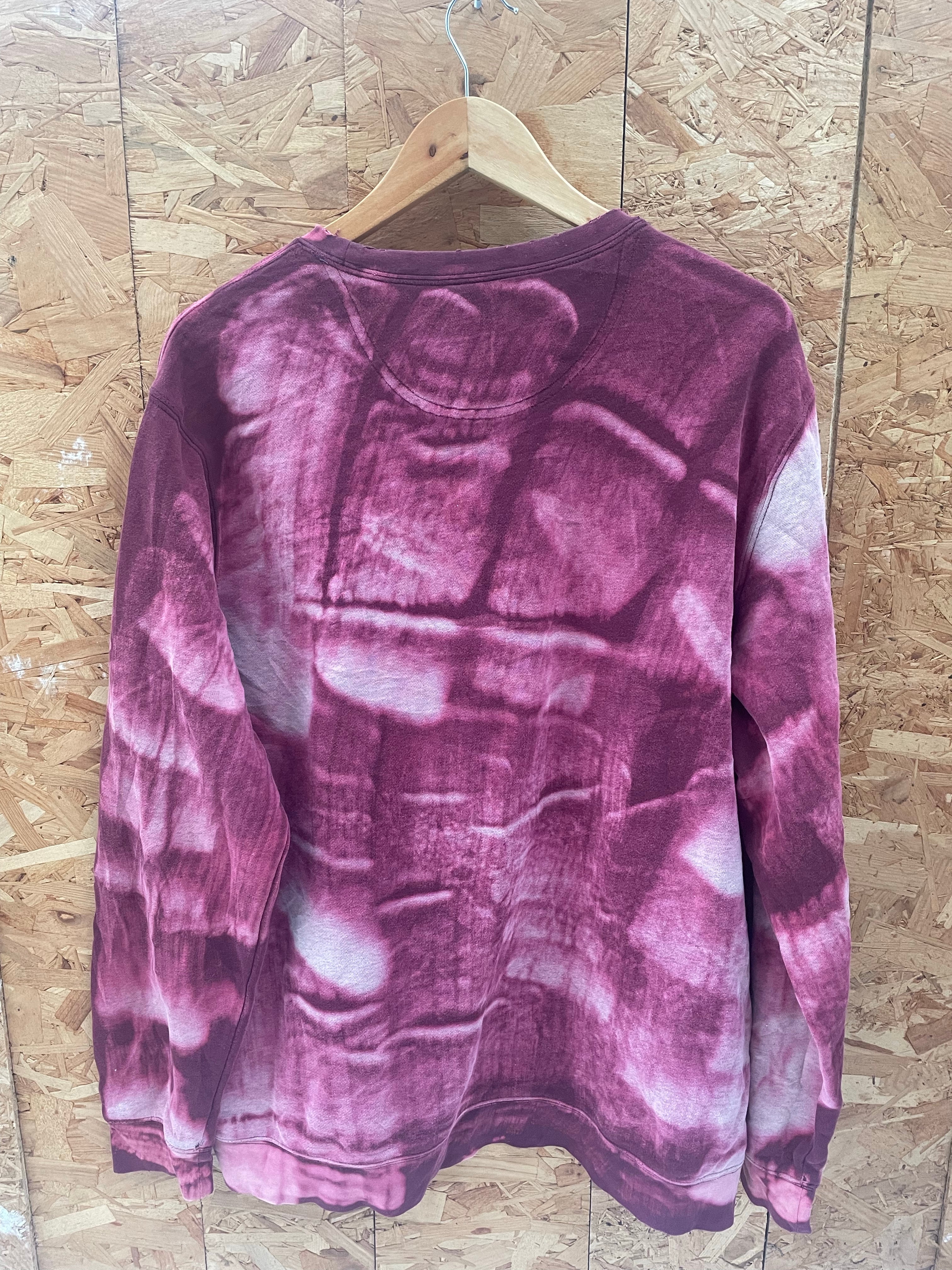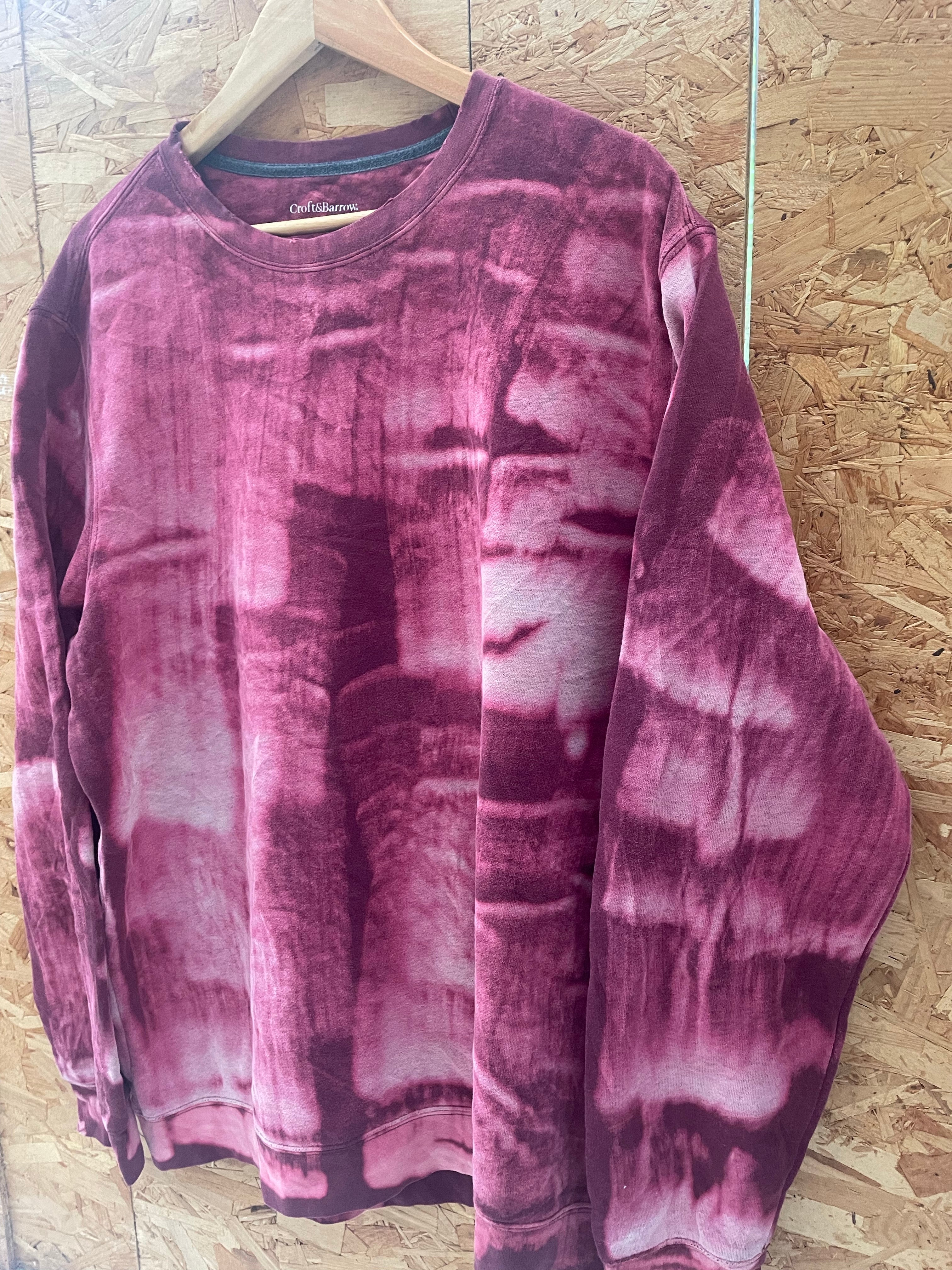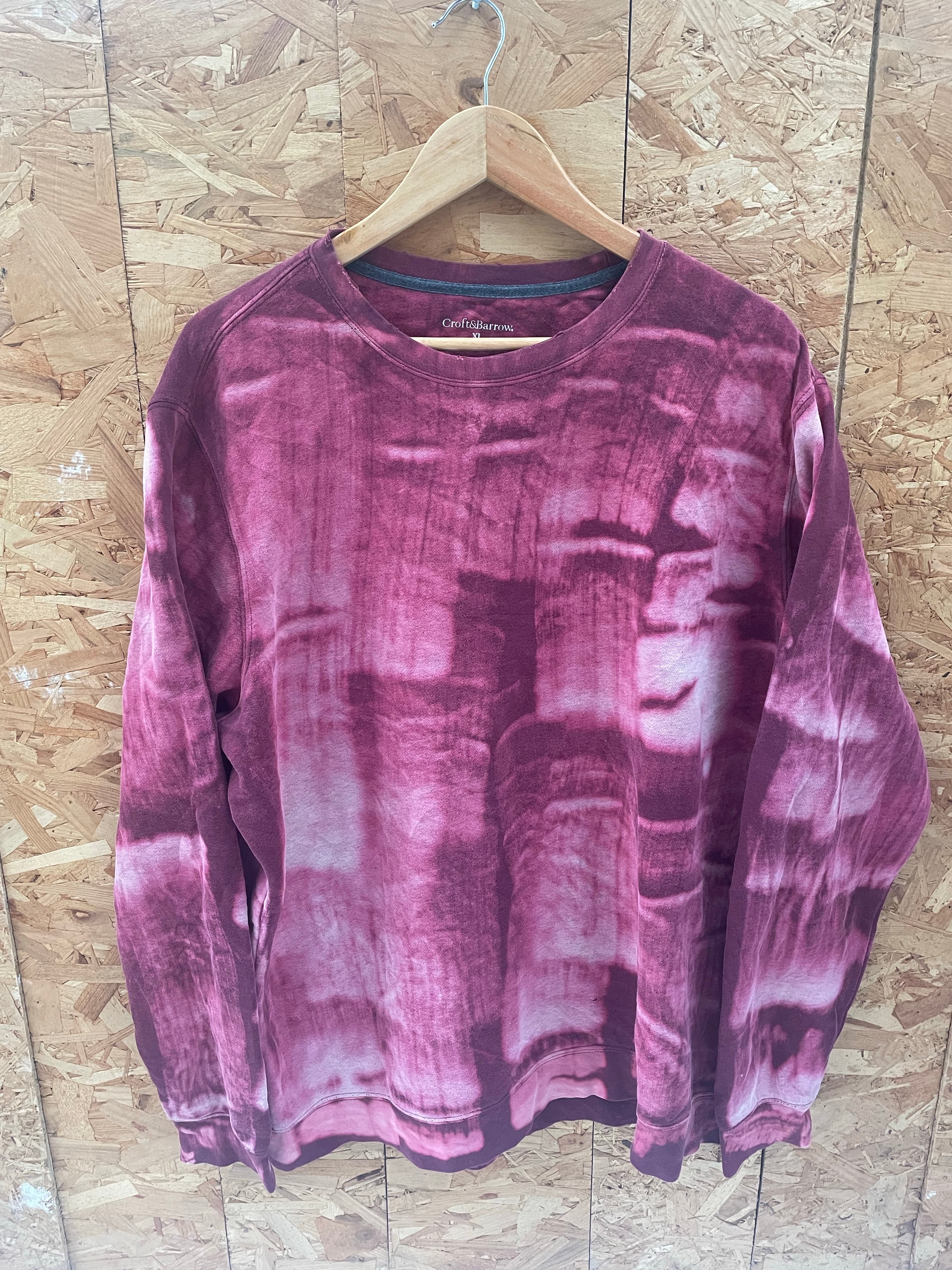 This Croft & Barrow long sleeve sweatshirt features a unique burgundy tie-dye pattern. Made from a comfortable fabric, it's perfect for casual wear. The crew neck design and relaxed fit make it a versatile addition to any wardrobe. Size XL.