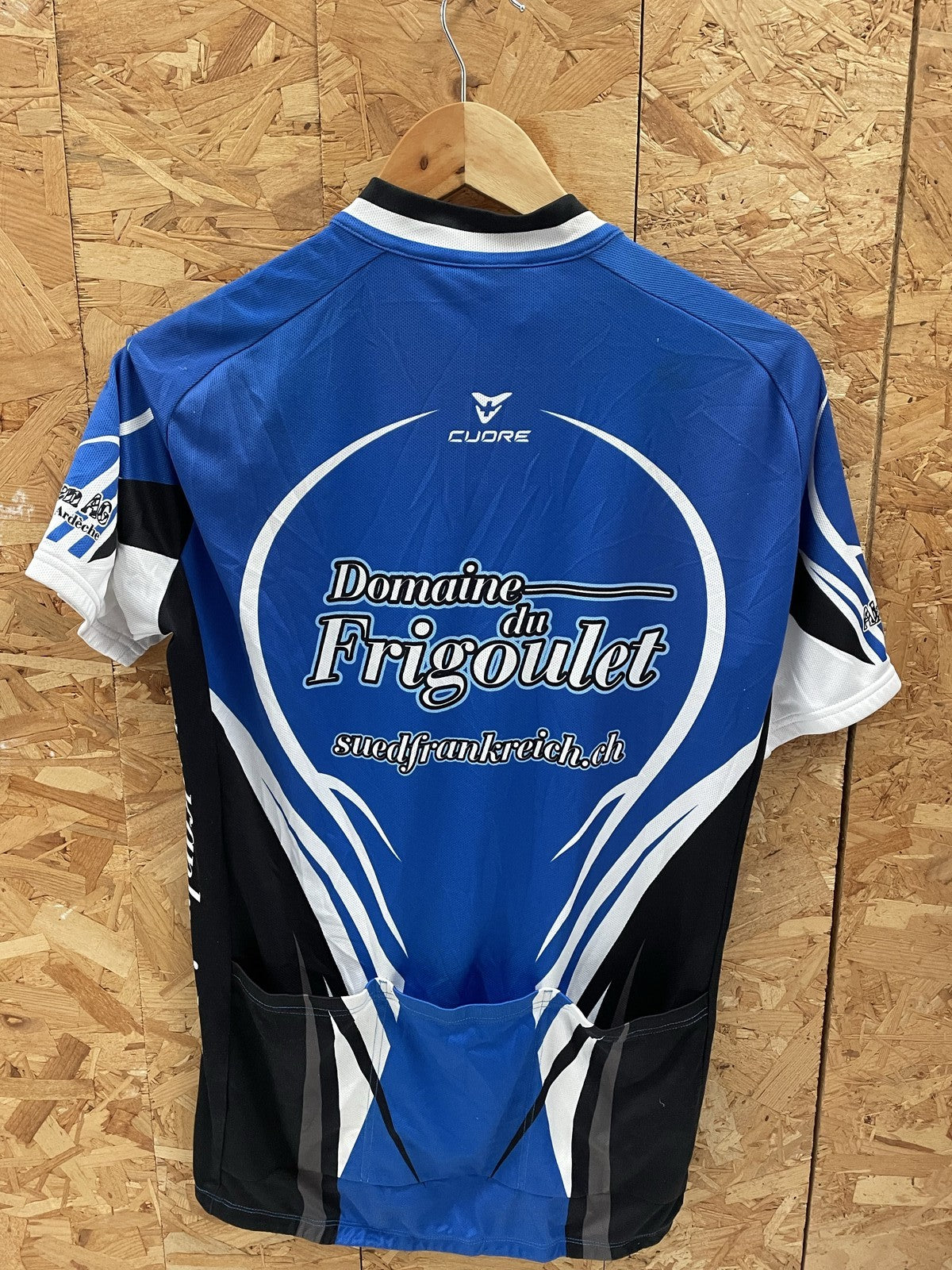 This CUORE cycling jersey features a vibrant blue color with "Domaine du Frigolet" branding. It's a short-sleeve style with a full zipper and three back pockets, perfect for avid cyclists. The "Swiss precision meets Italian passion" tag indicates quality
