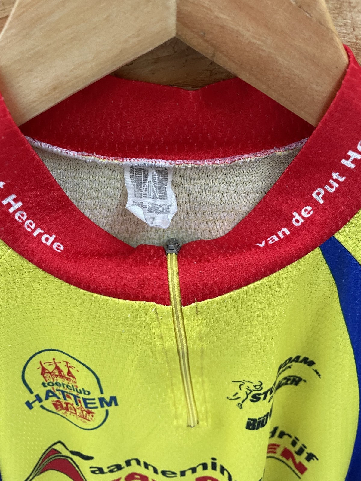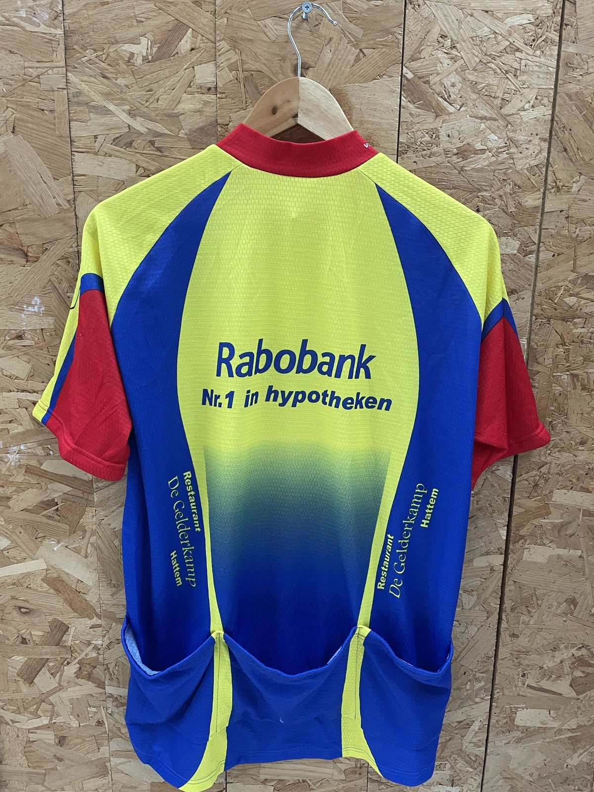 Vintage short sleeve cycling jersey in vibrant yellow, blue, and red. Features sponsor logos from Ramaker Toyota, Aannemingsbedrijf van Dieren, and Rabobank. Quarter zip neckline. Perfect for cycling enthusiasts or as a retro sportswear piece.