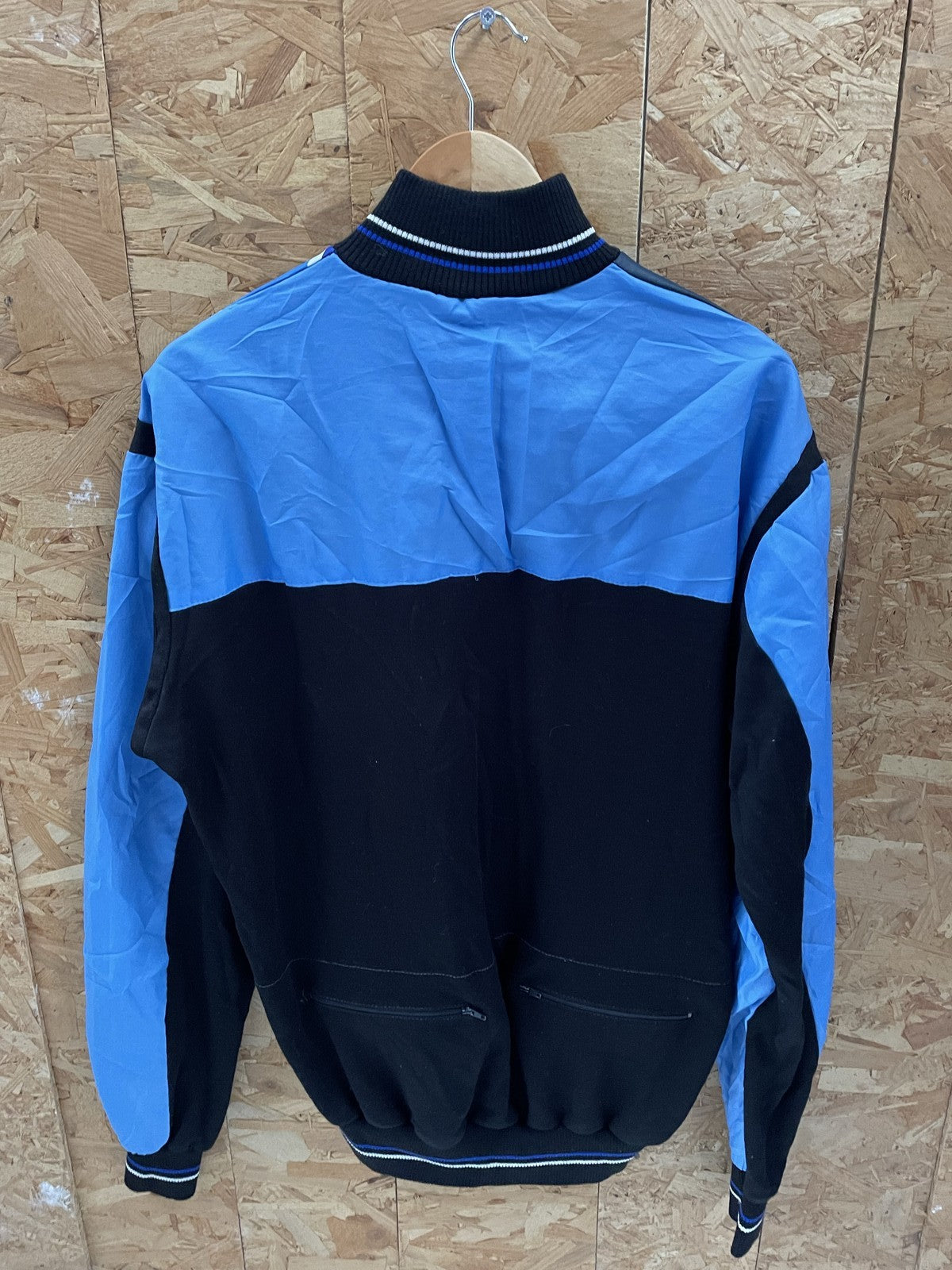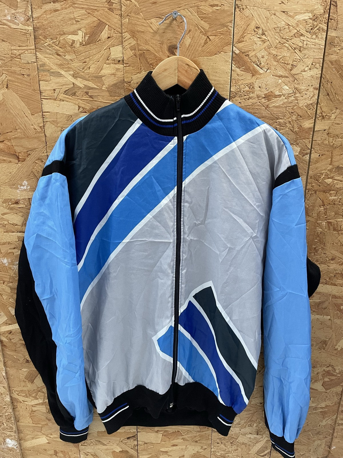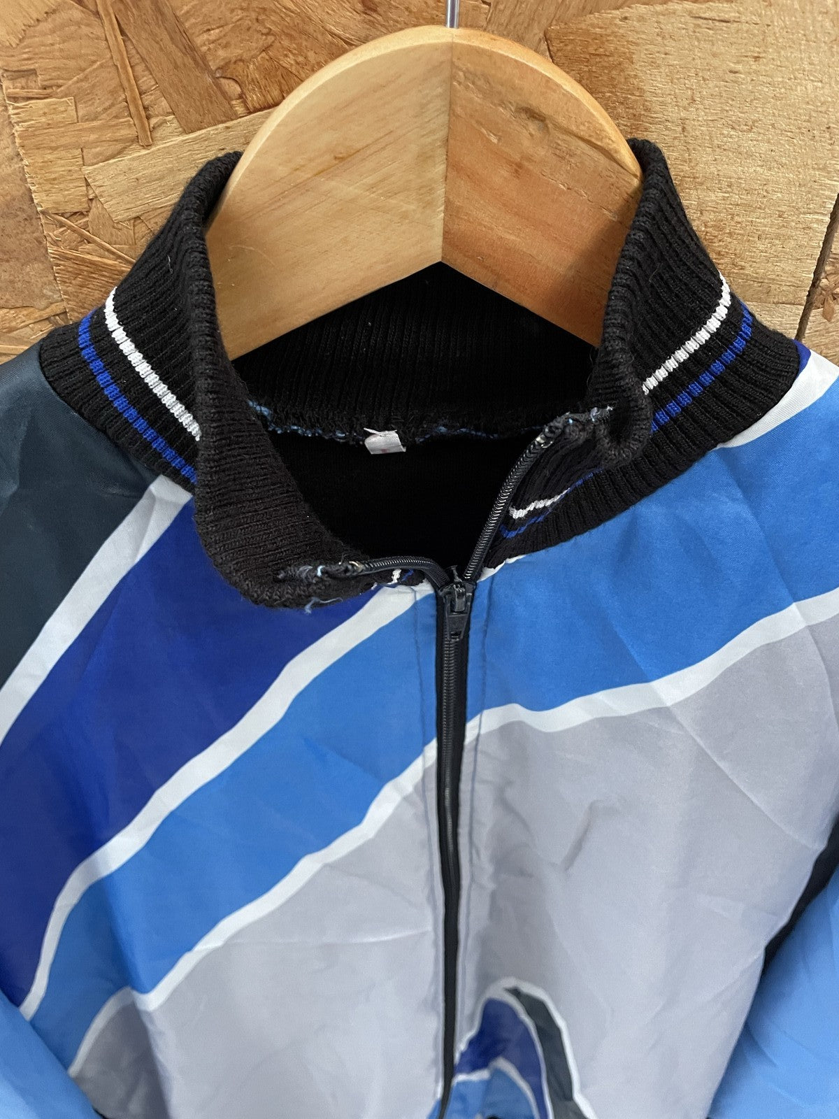 Retro cycle track jacket featuring a bold geometric design in blue, grey, and black. This vintage piece has a full zip closure, ribbed collar, cuffs, and hem. Perfect for athletic wear or a stylish streetwear look. Shows some signs of wear consistent wit