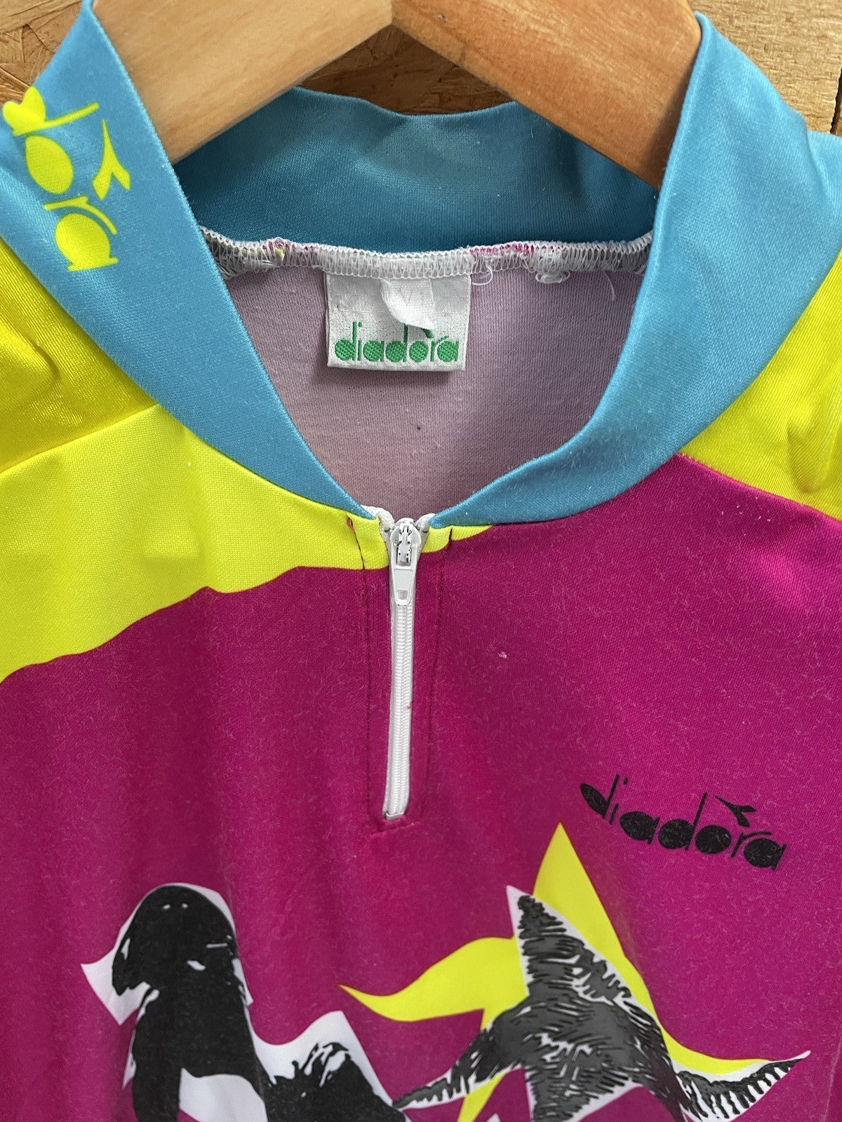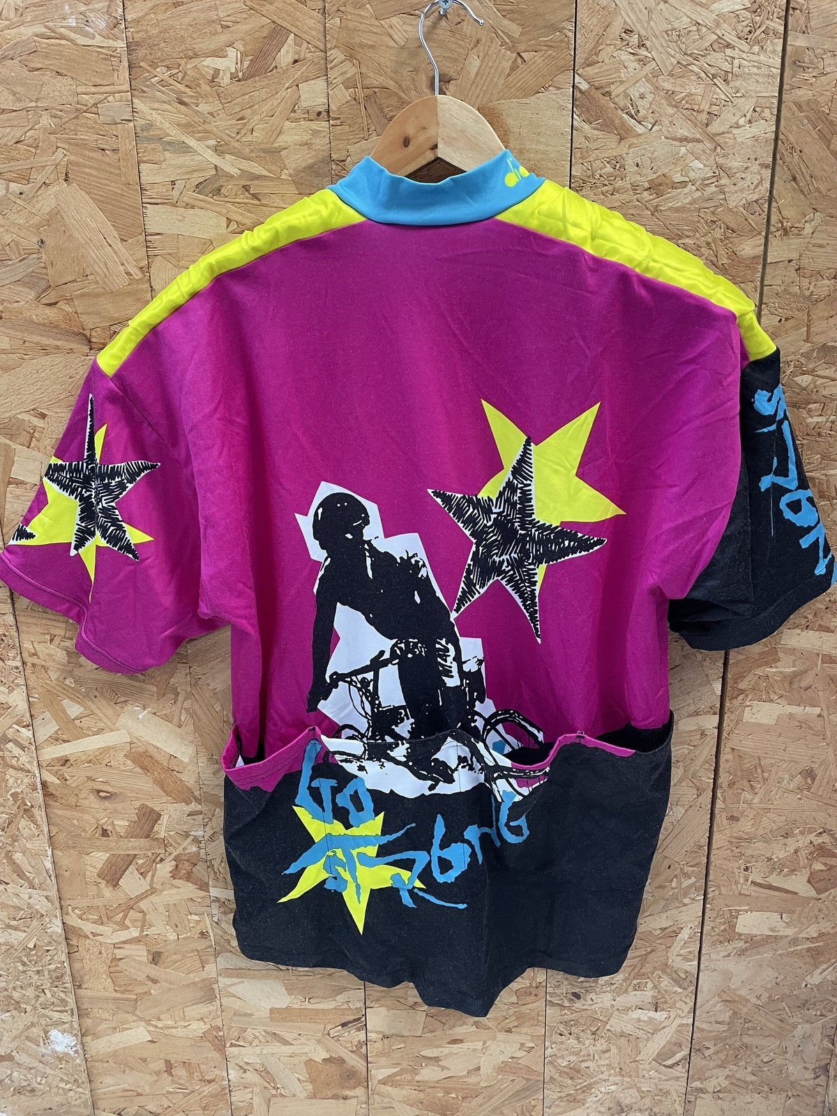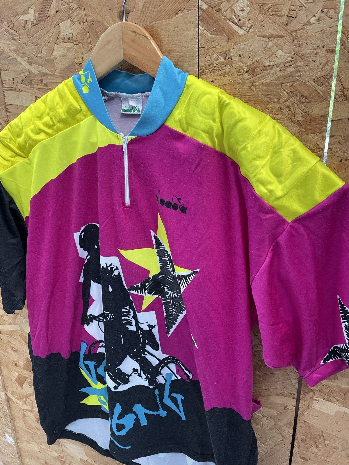 Vintage Diadora cycling jersey with a bold graphic featuring a BMX rider and stars. Features a half-zip neckline,padding on shoulders, vibrant pink, yellow, and black color blocking, and a relaxed fit. Perfect for cycling enthusiasts or as a retro stateme