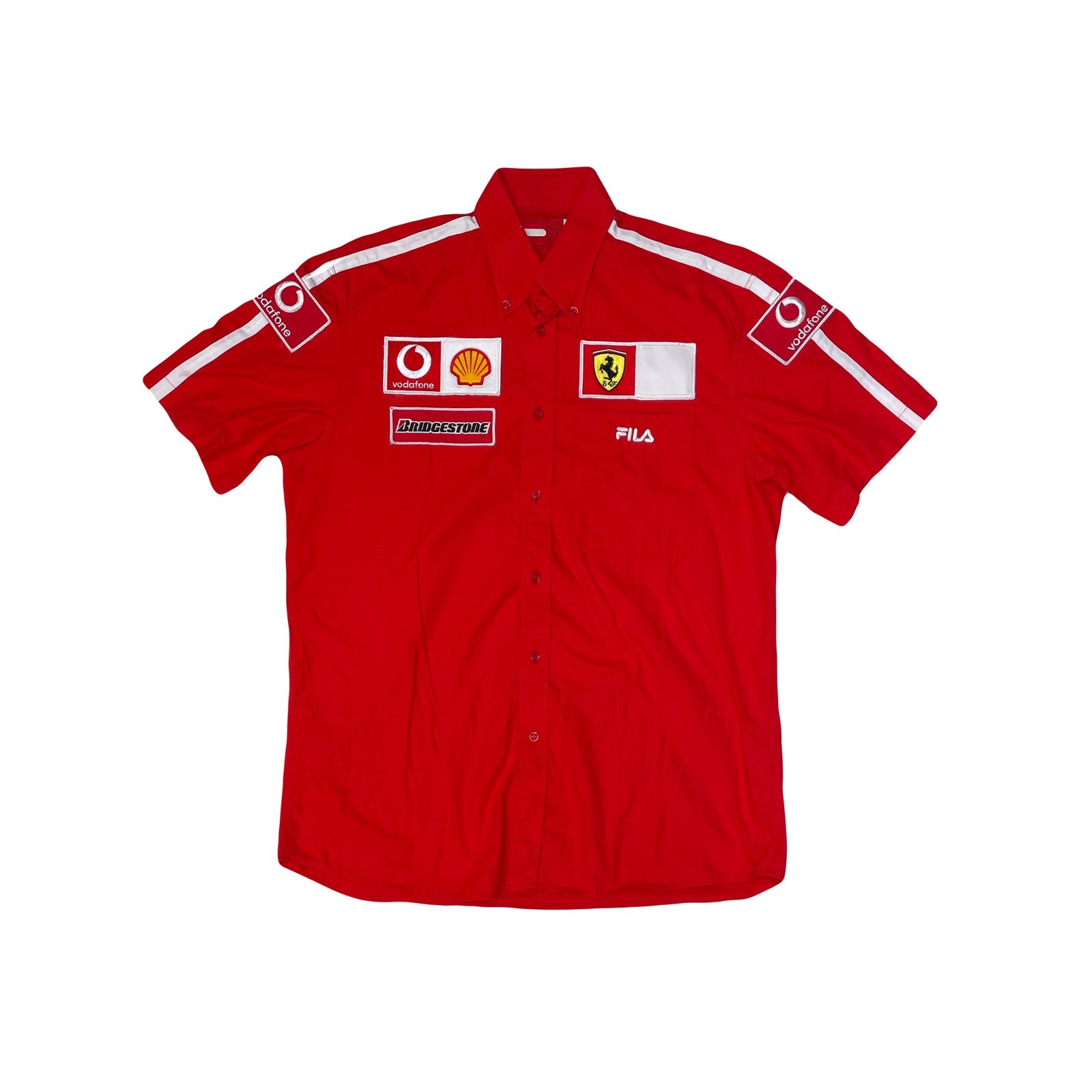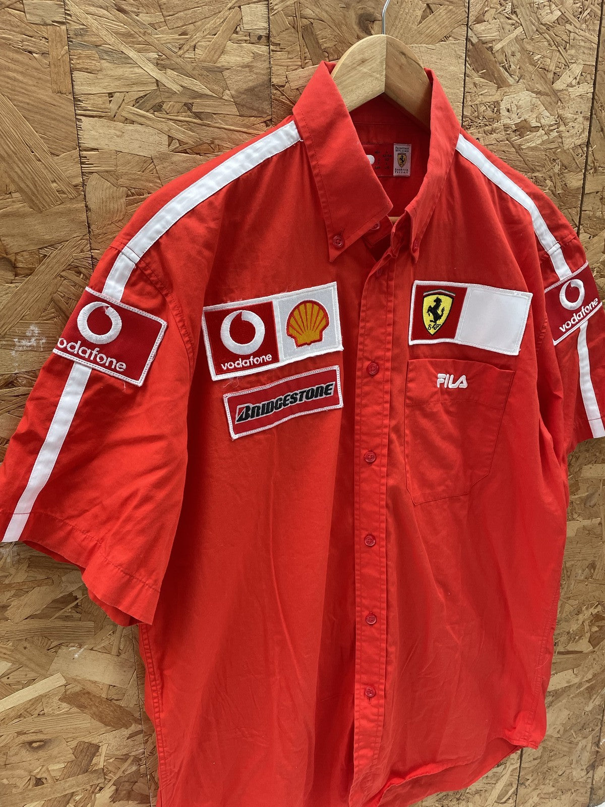 Authentic Fila Ferrari Racing Team short sleeve button-up shirt. Features multiple sponsor logos including Vodafone, Shell, Bridgestone, and the iconic Ferrari Prancing Horse. Made for fans of motorsport and vintage racing apparel. Size L.