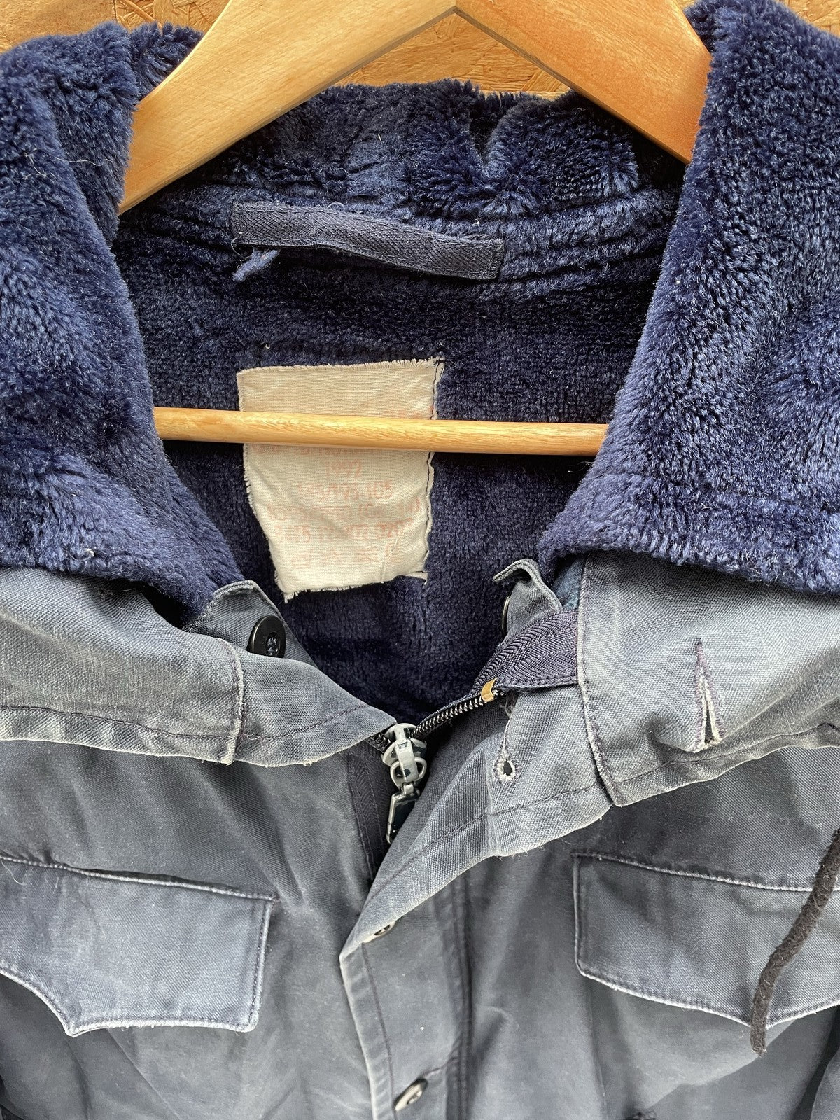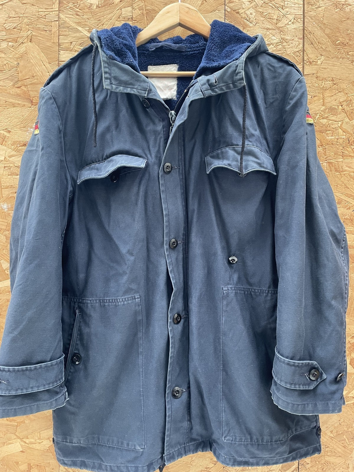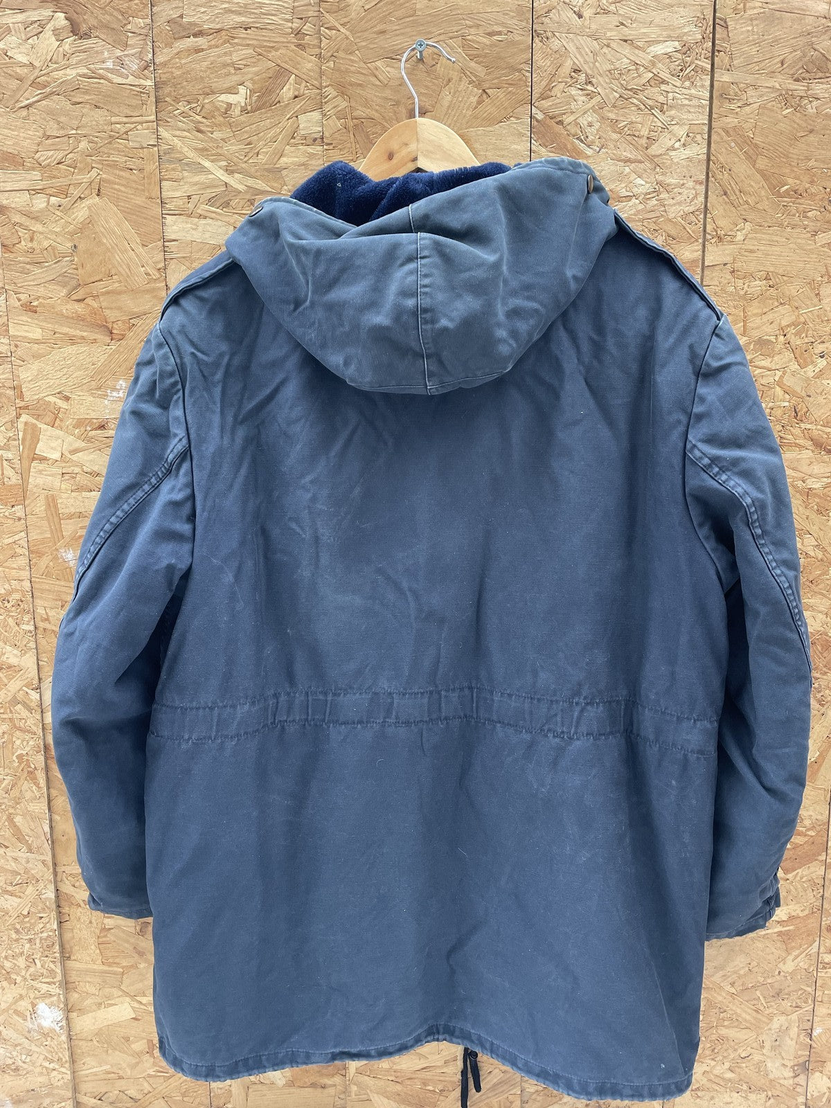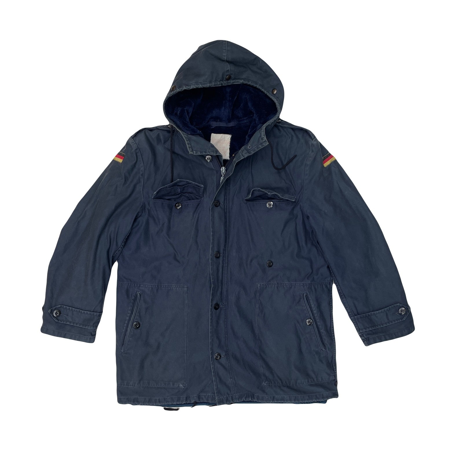 Authentic true vintage German military parka jacket. Features a dark blue durable outer shell, warm fur lining, and a detachable hood. Detachable fleece liner. Multiple pockets and adjustable drawstring waist. Ideal for workwear or casual layering. size label faded away, fits as L see measurements for exact fit