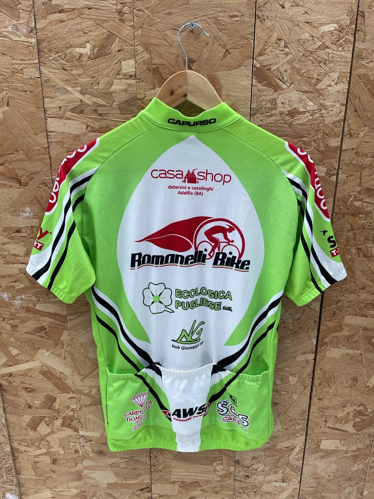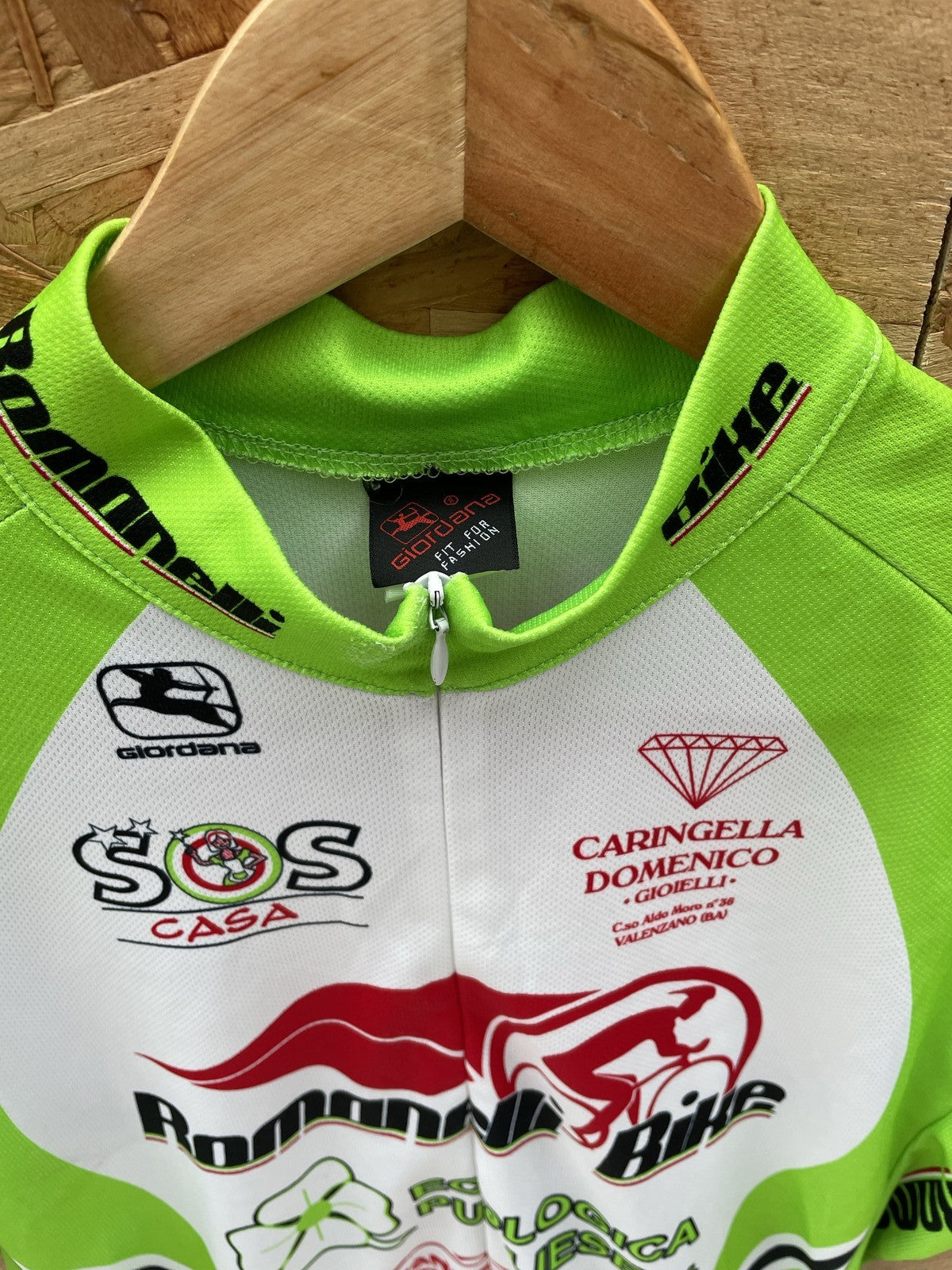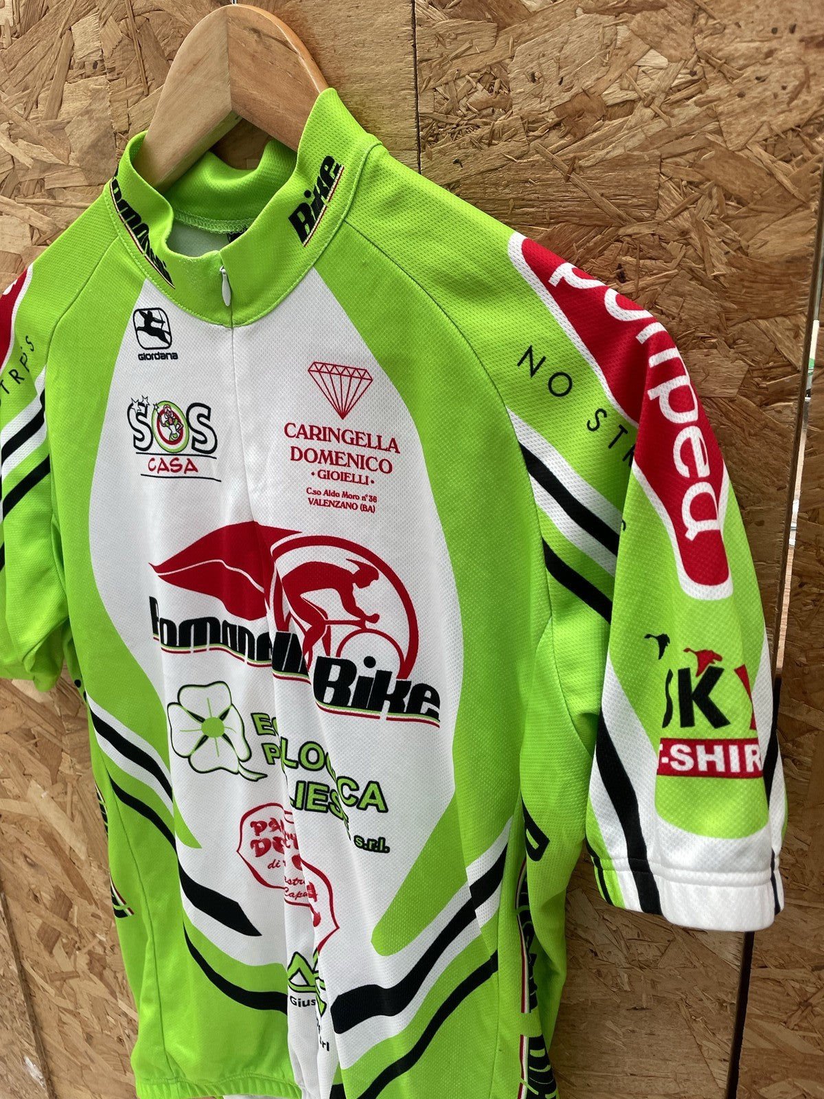 Vintage Giordana cycling jersey in vibrant green. Features short sleeves, a full zip front, and multiple sponsor logos. Made for performance and comfort on the bike. Excellent condition, looks new.