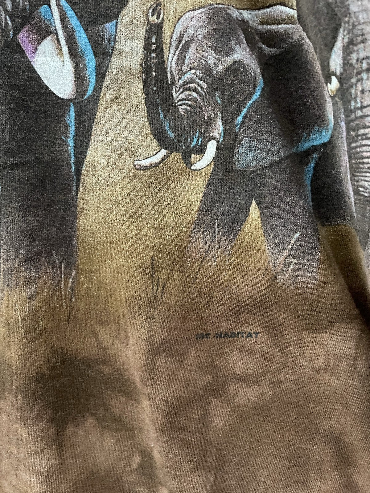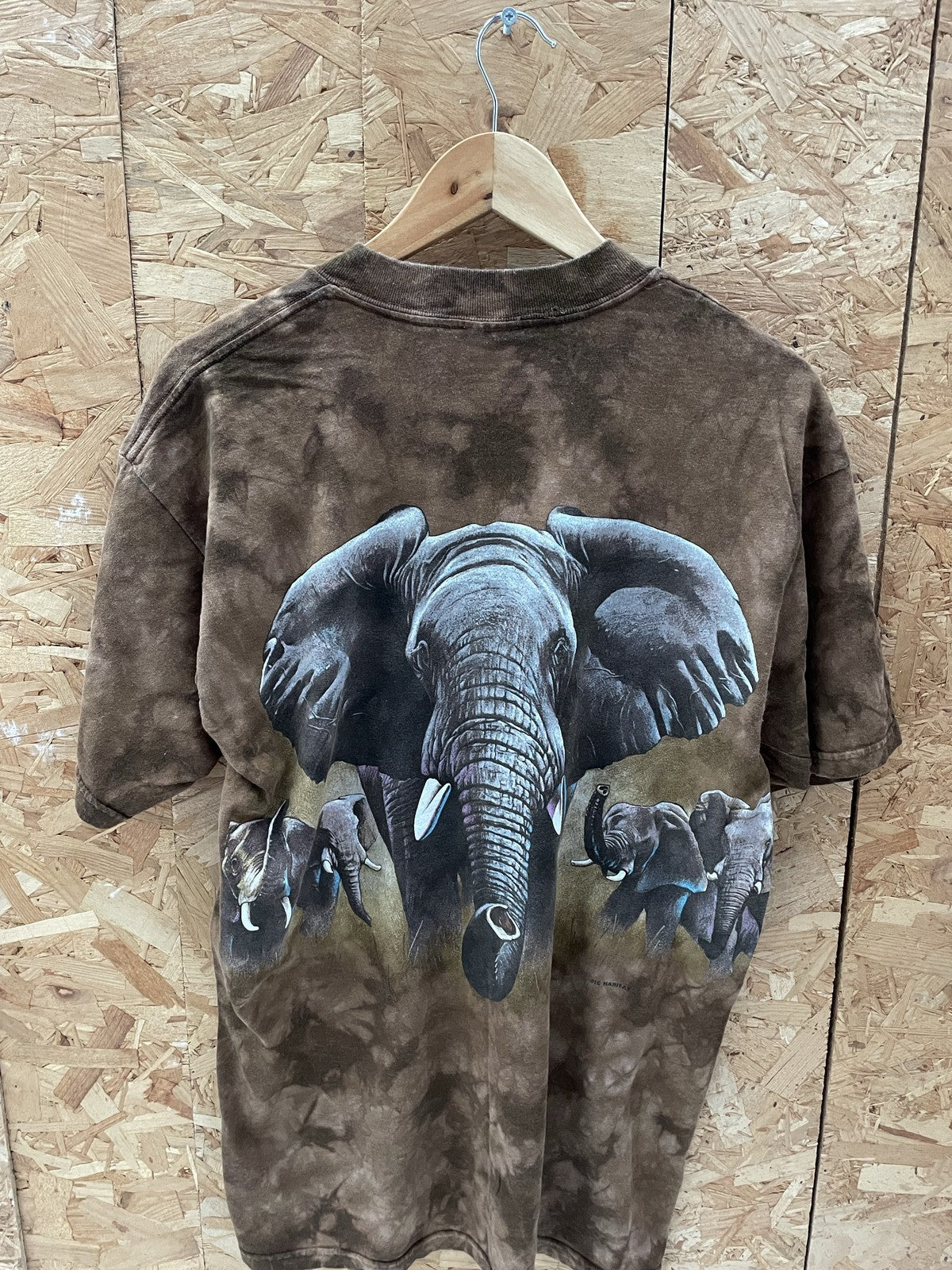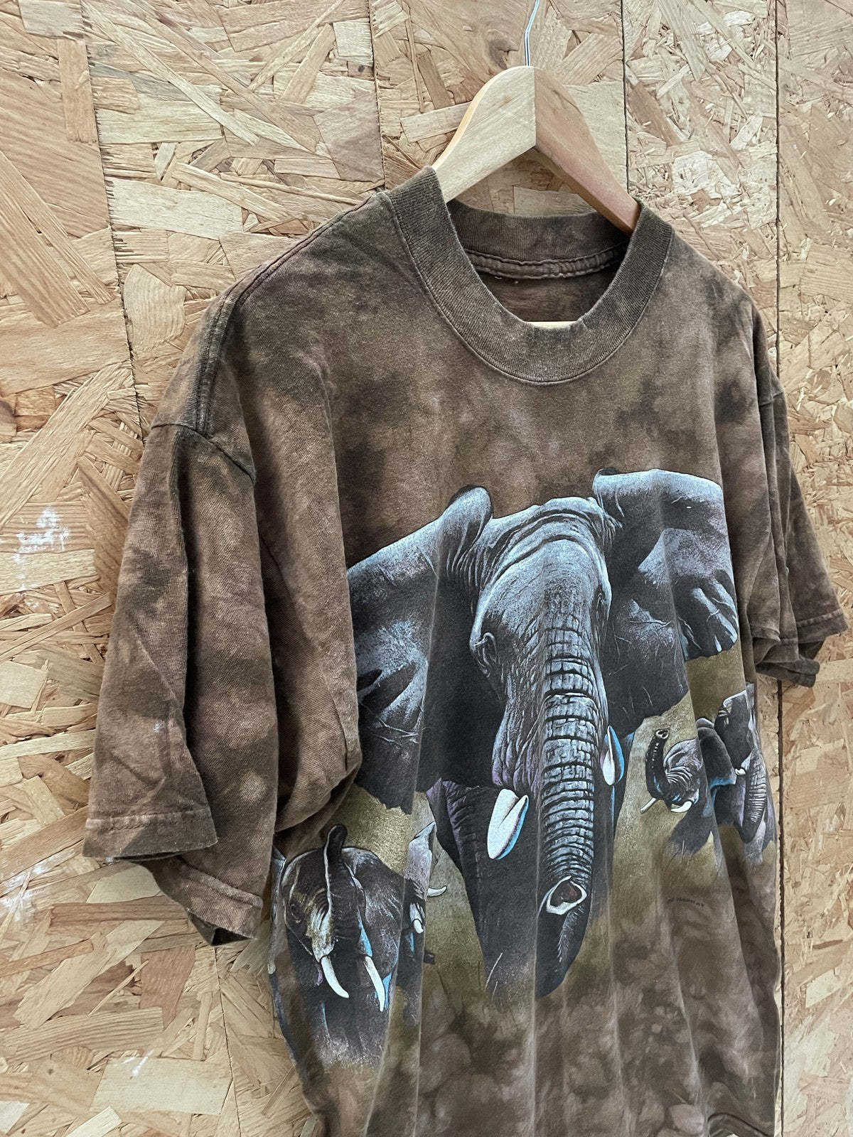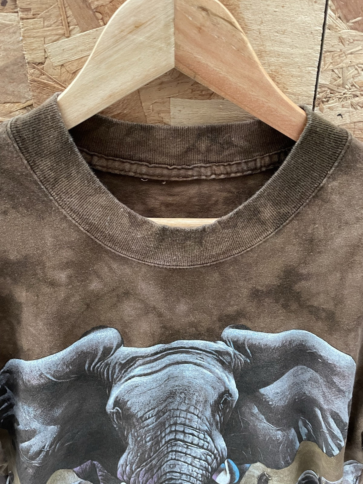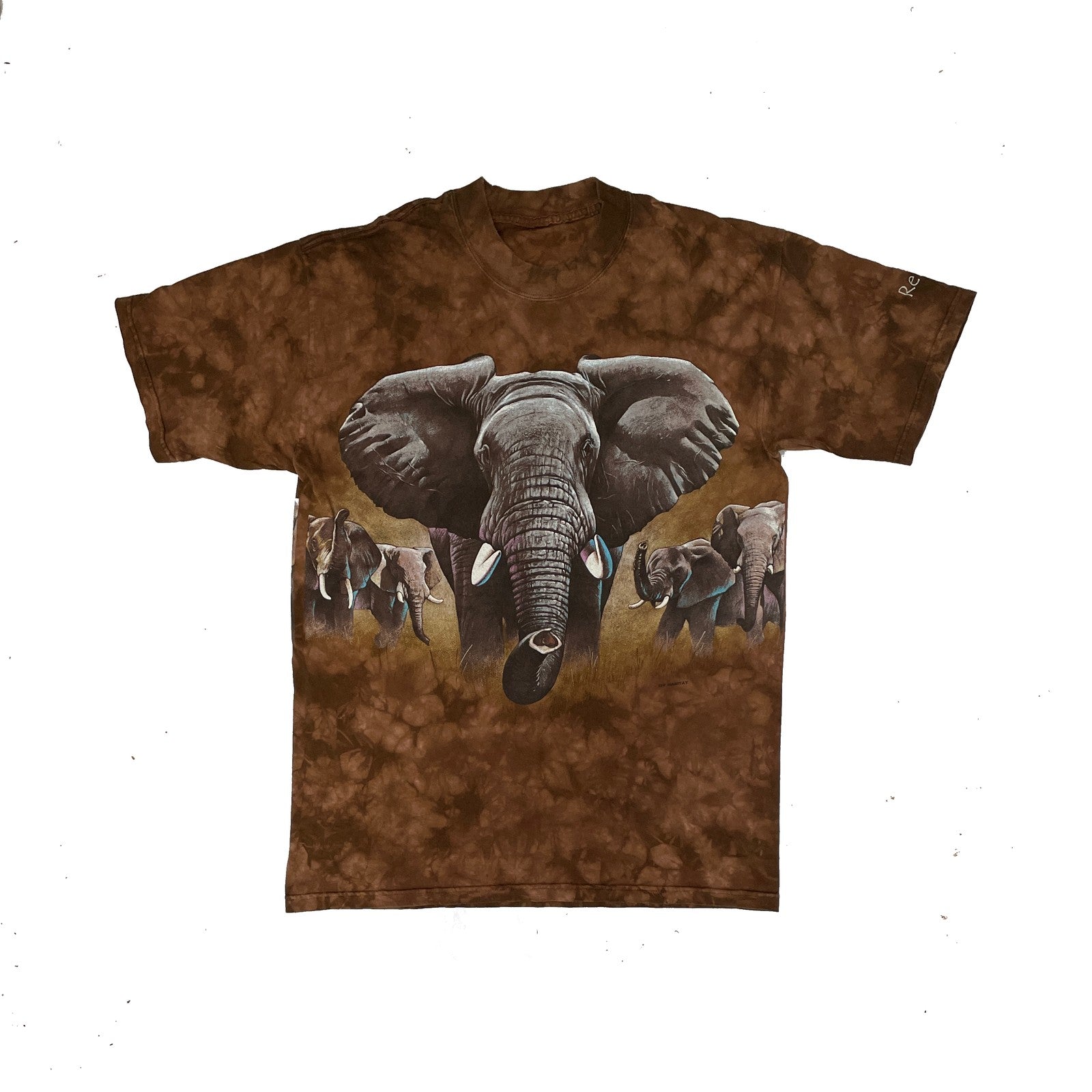 Vintage t-shirt featuring a detailed graphic of elephants in a tie-dye brown pattern. This shirt appears to be from the early 2000s and is in good used condition with no visible signs of damage. The unique "tie-dye" effect gives it a retro feel.