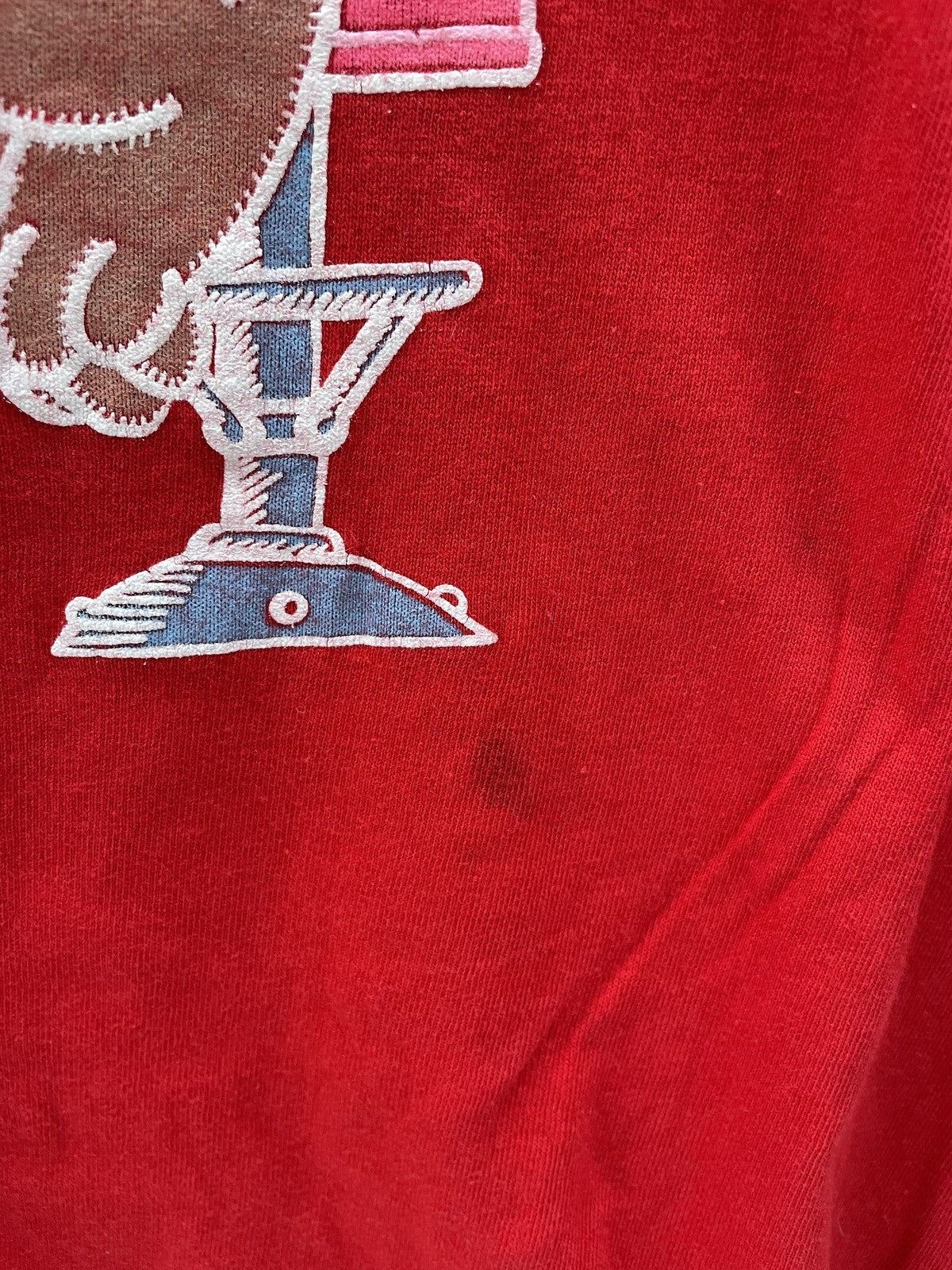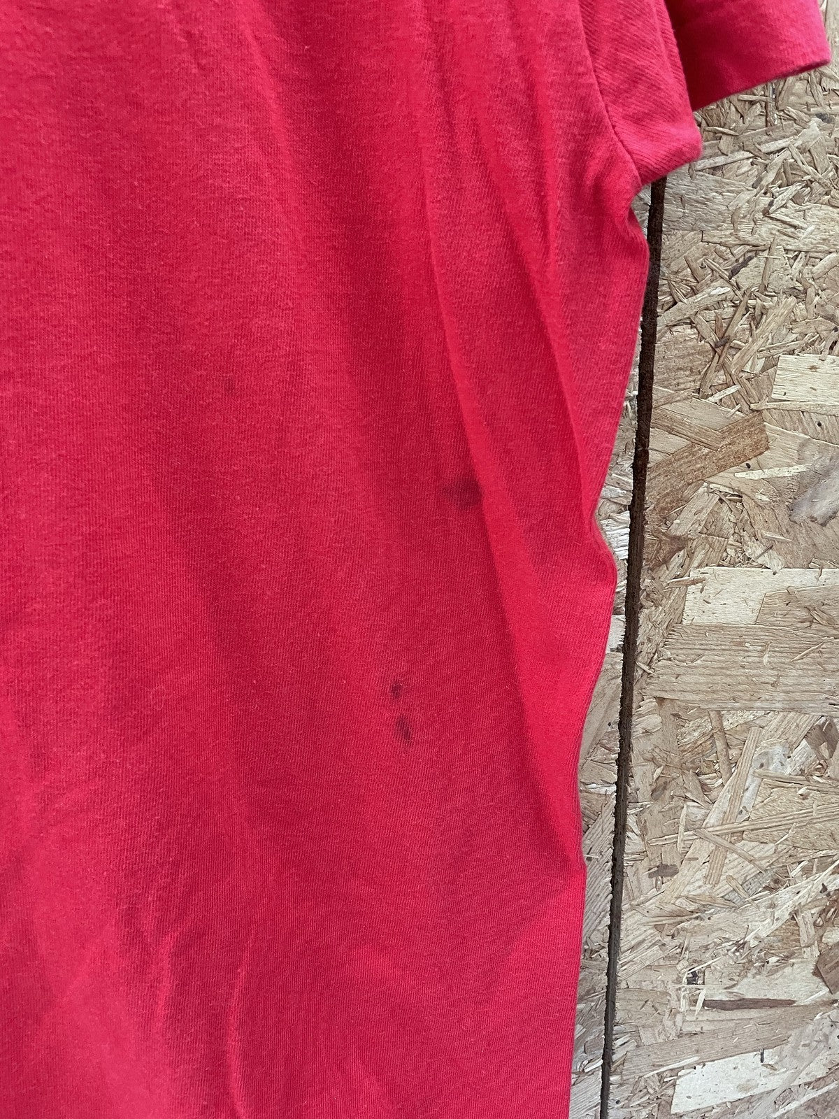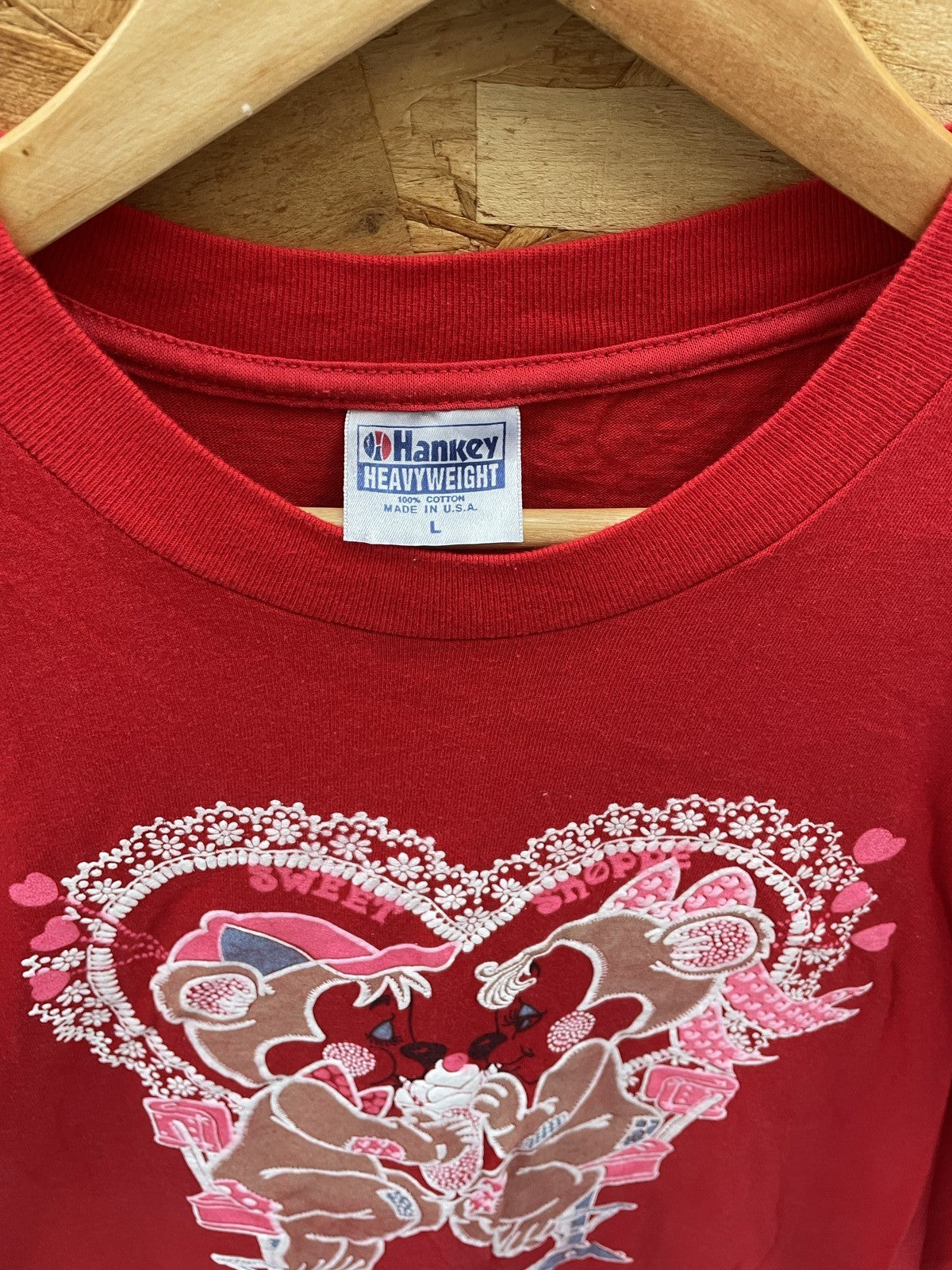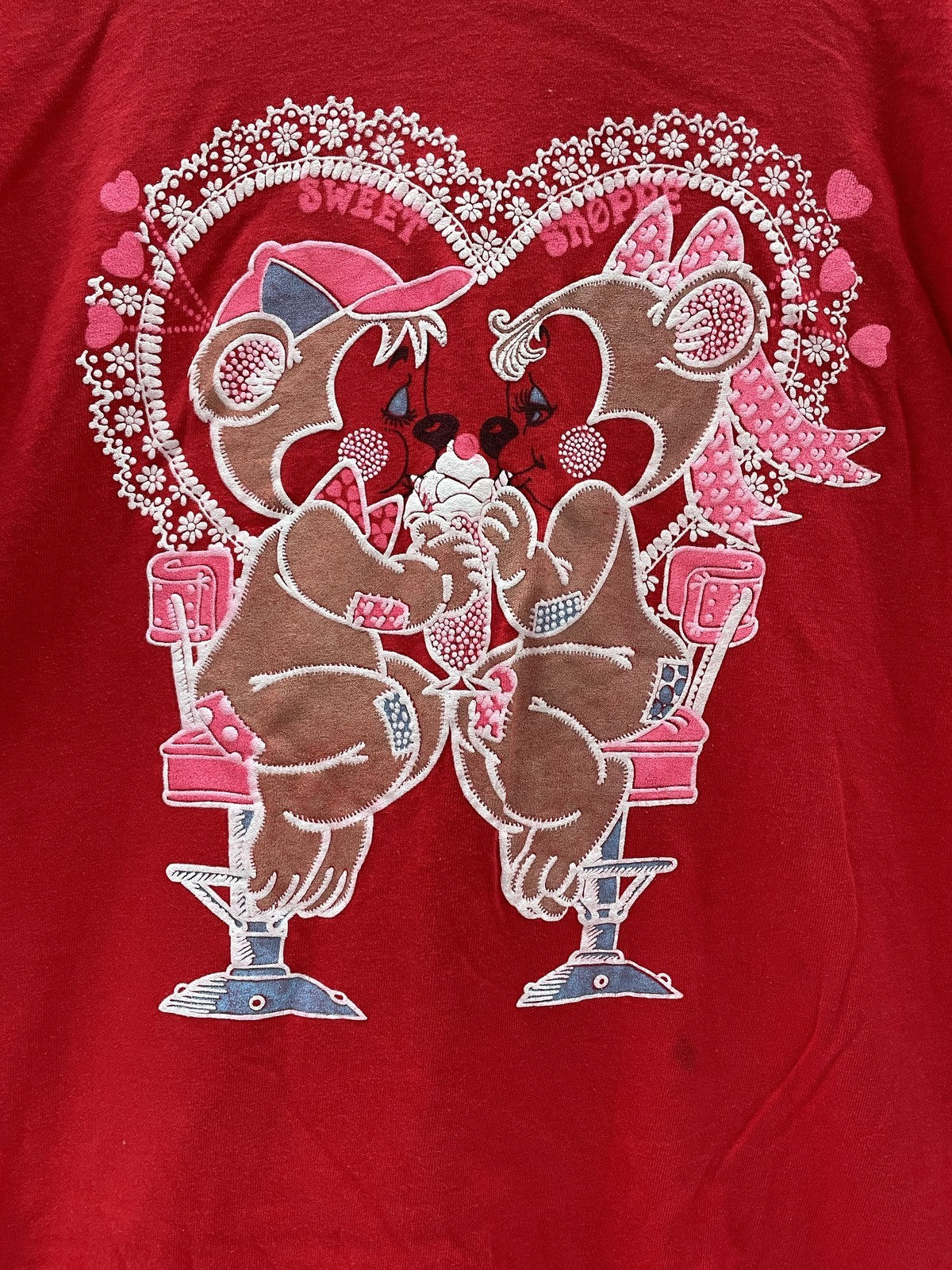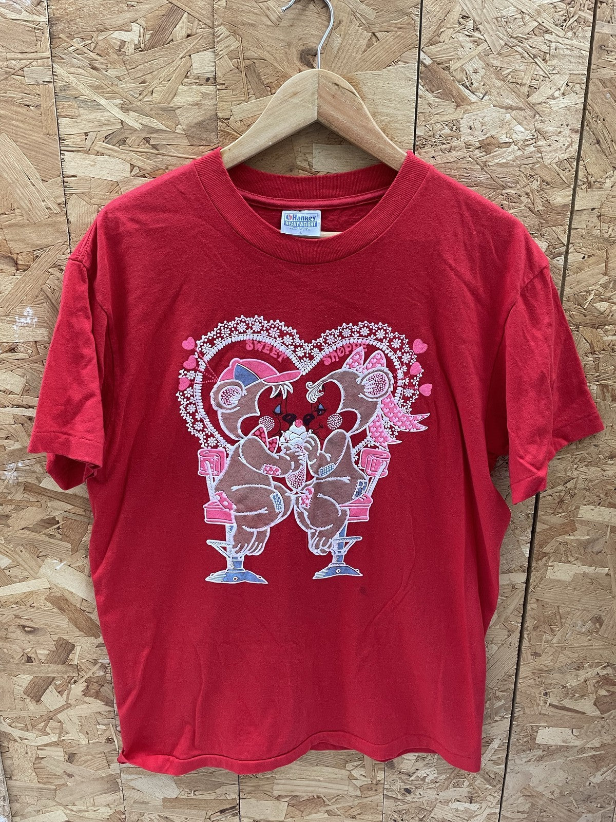 Vintage Hanes Heavyweight t-shirt in red with a "Sweet Date" graphic featuring bears. Made in USA. Shows some minor staining on the front, consistent with age and use.