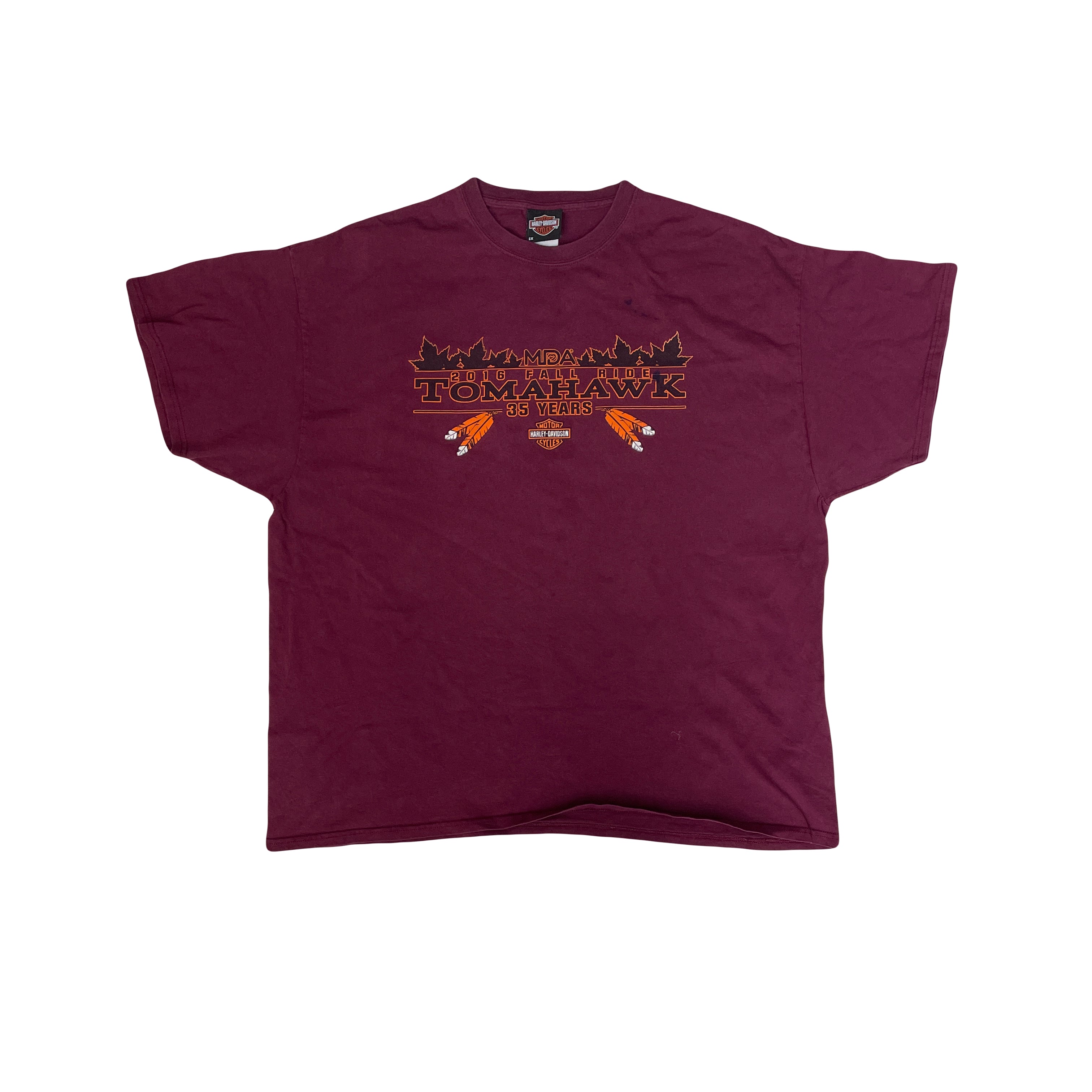 Vintage Harley-Davidson Maroon T-Shirt. Features 2016 MDA Fall Ride Tomahawk graphic. Size 2X. Pre-owned, good condition, minor wear some ghost stains on front.