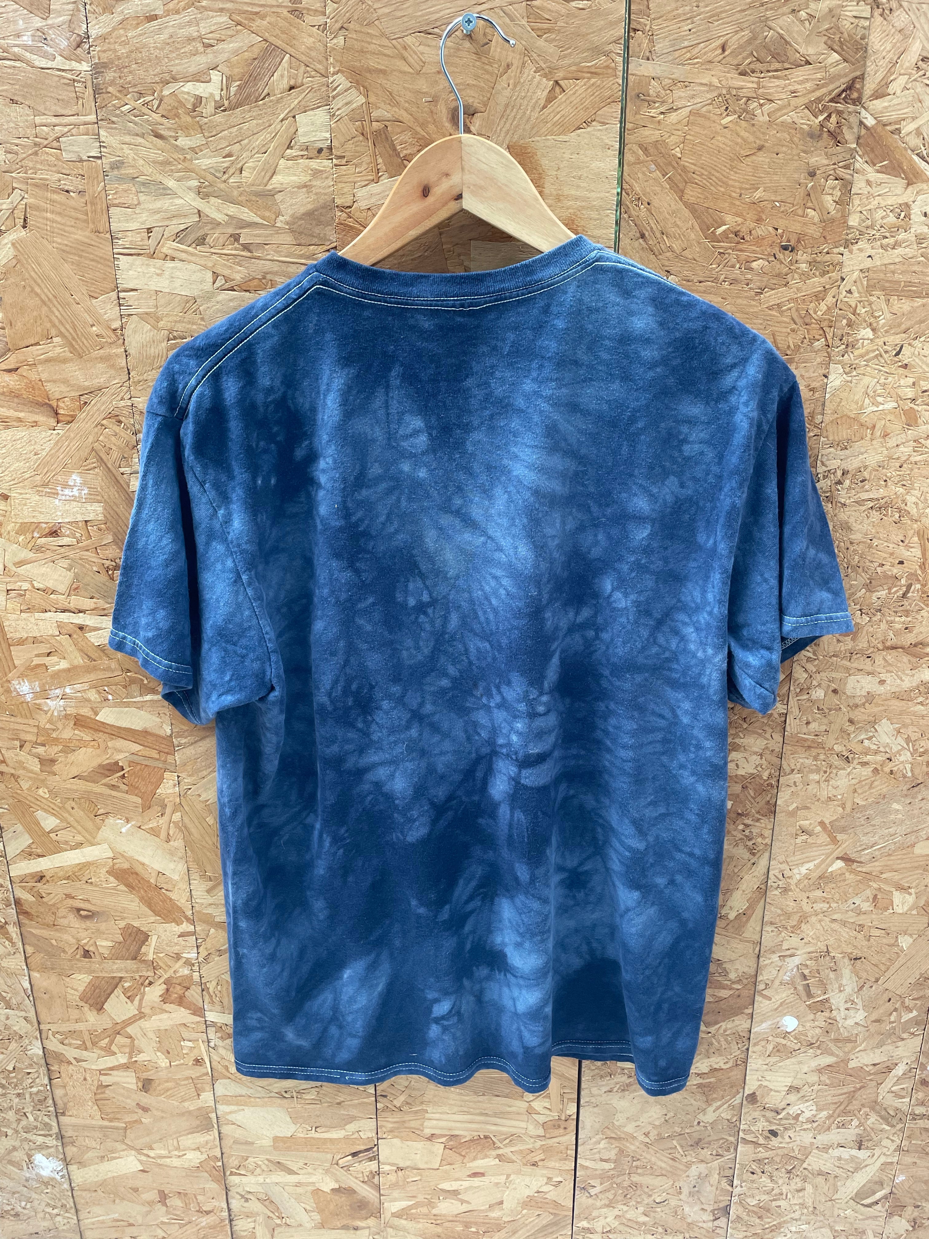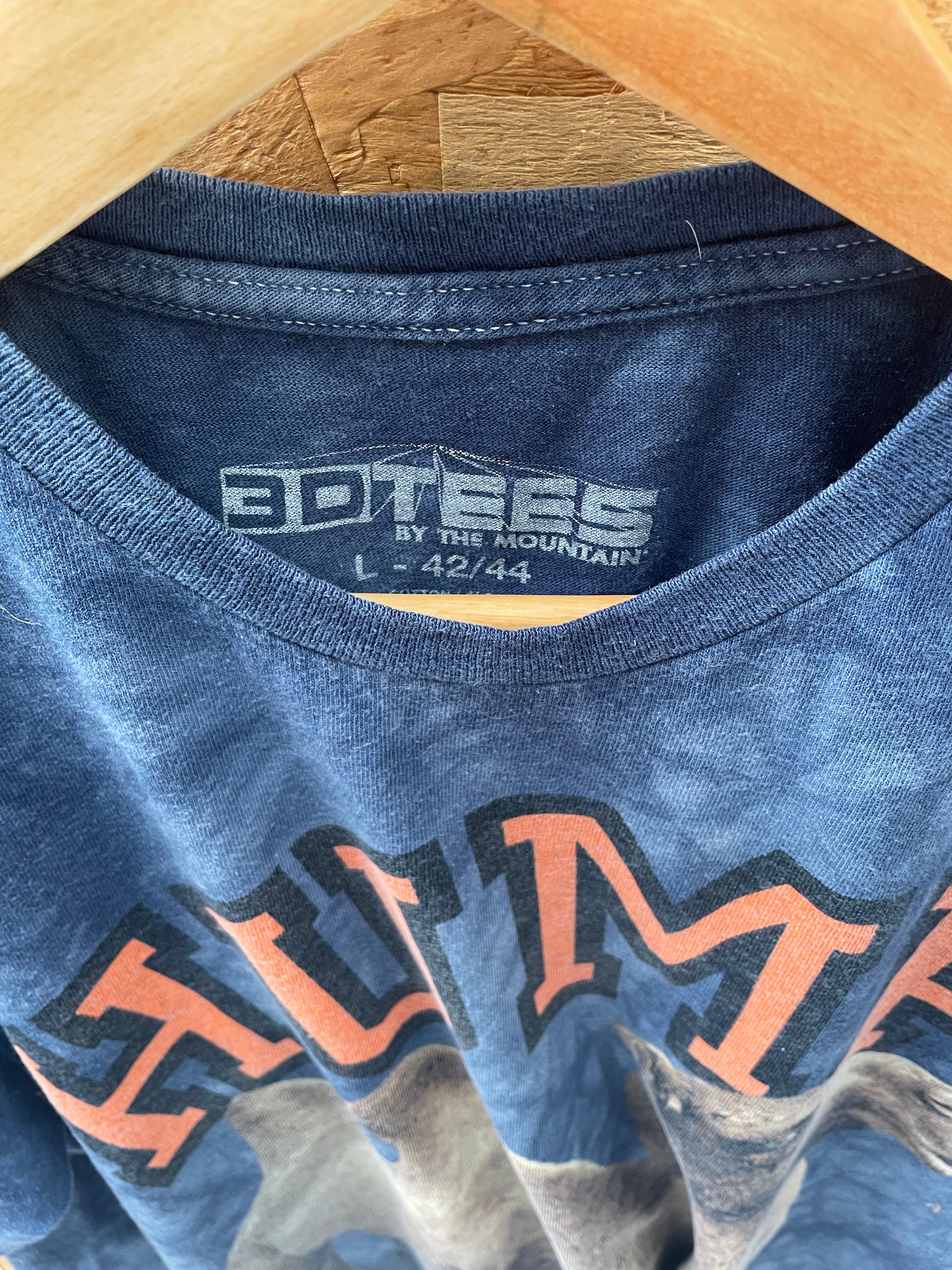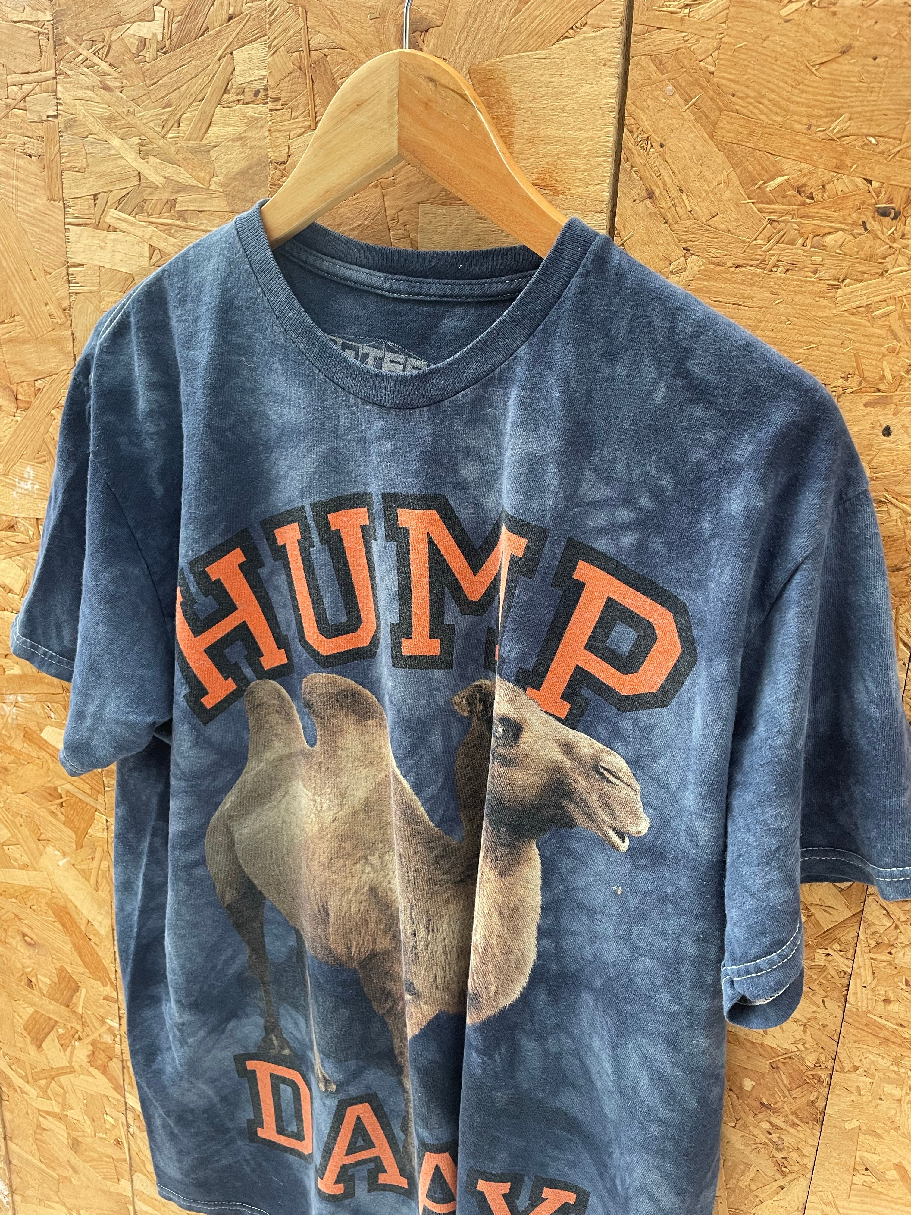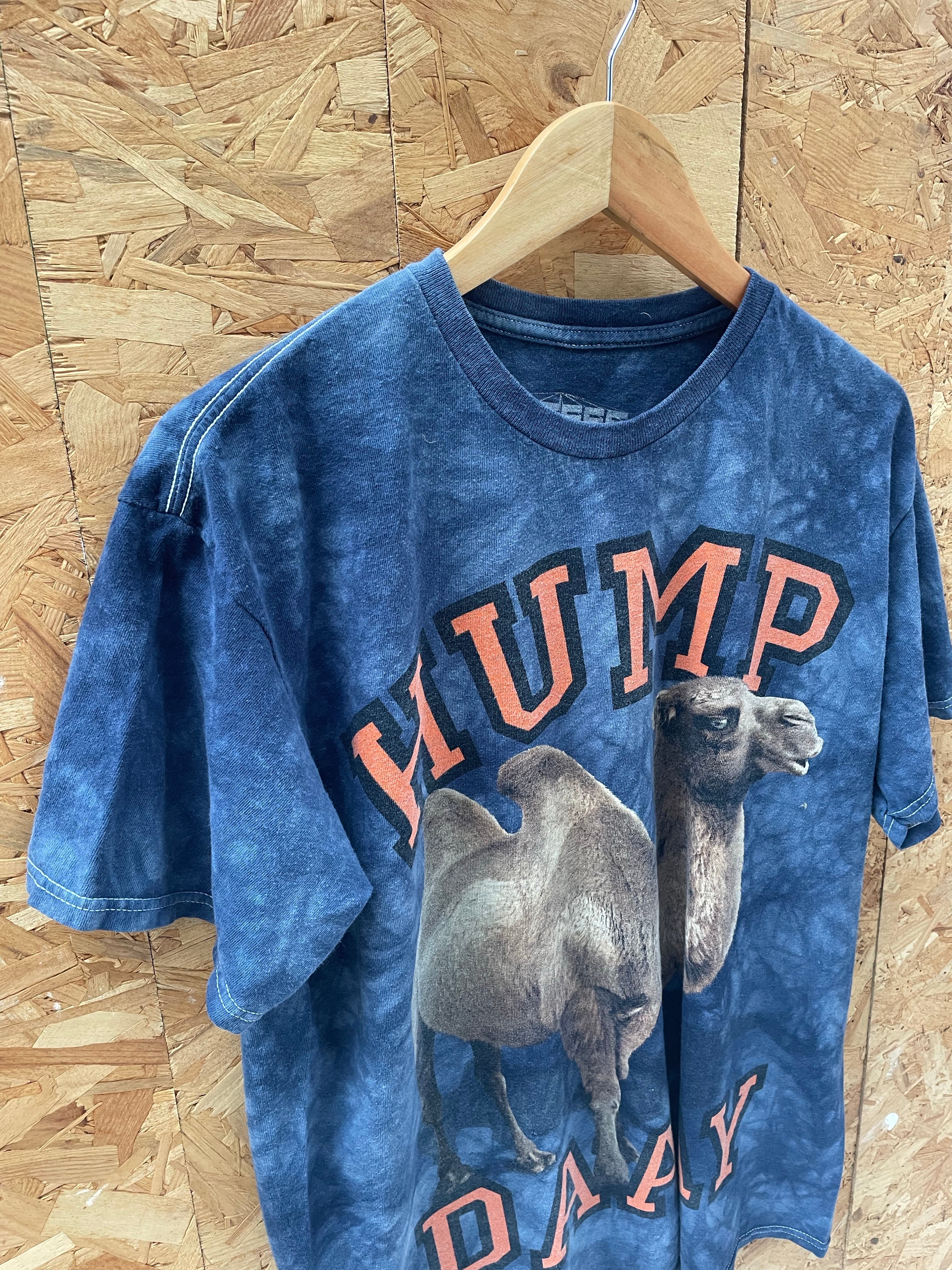 3D Tees tie-dye graphic tee shirt featuring a camel with "Hump Day" text. Size L-42/44. Blue color. Pre-owned, good condition. Color: Blue.