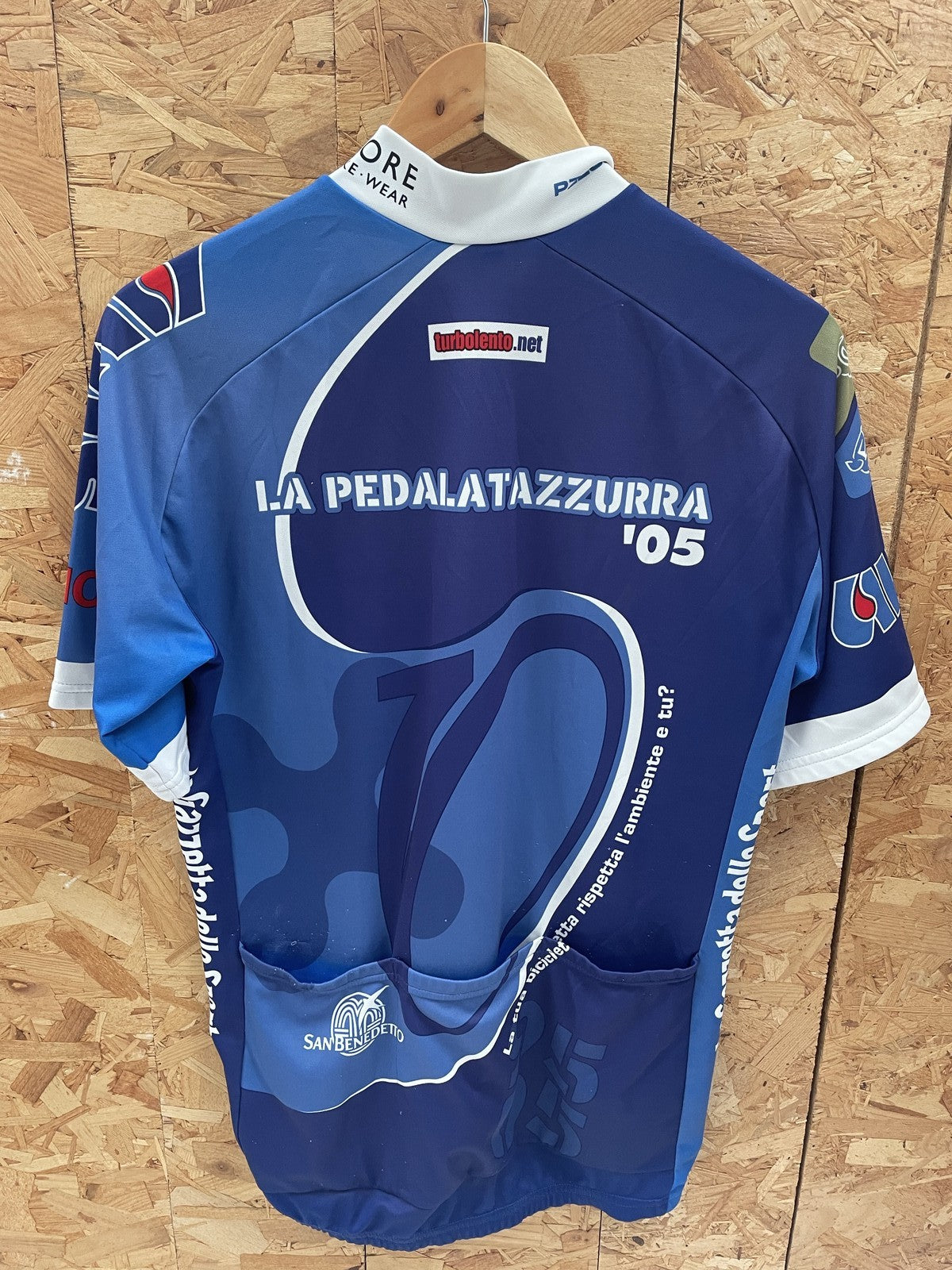 Gore Bike Wear short sleeve cycling jersey in blue, featuring "Italia" and "La Pedalatazzurra '05" graphics. Zipped collar for ventilation. Made with Gore Bike Wear technology for performance. Size XL.