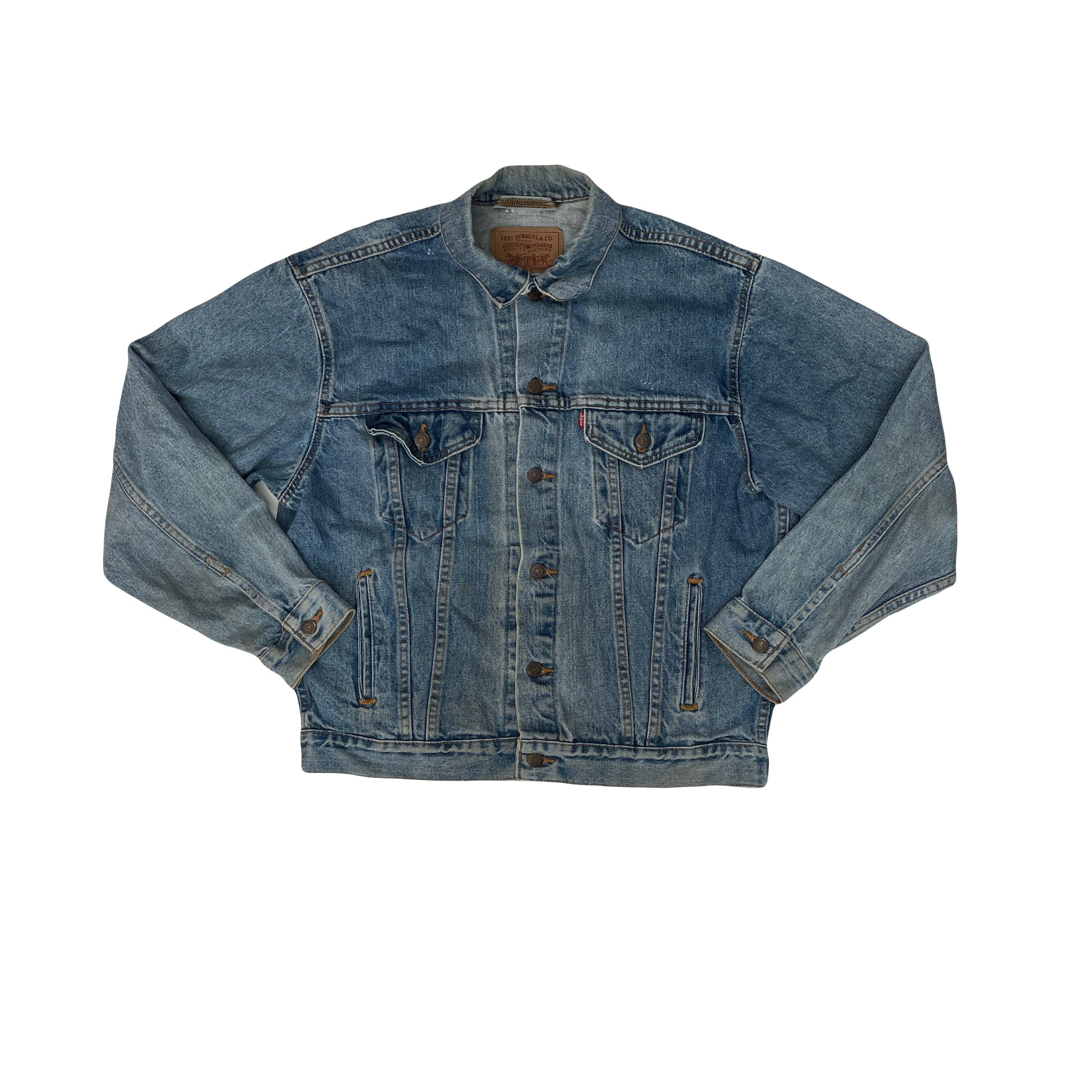 Levi's men's classic denim jacket in light wash. Size Medium. Pre-owned, good condition. Features button closure, classic collar, and two front pockets.