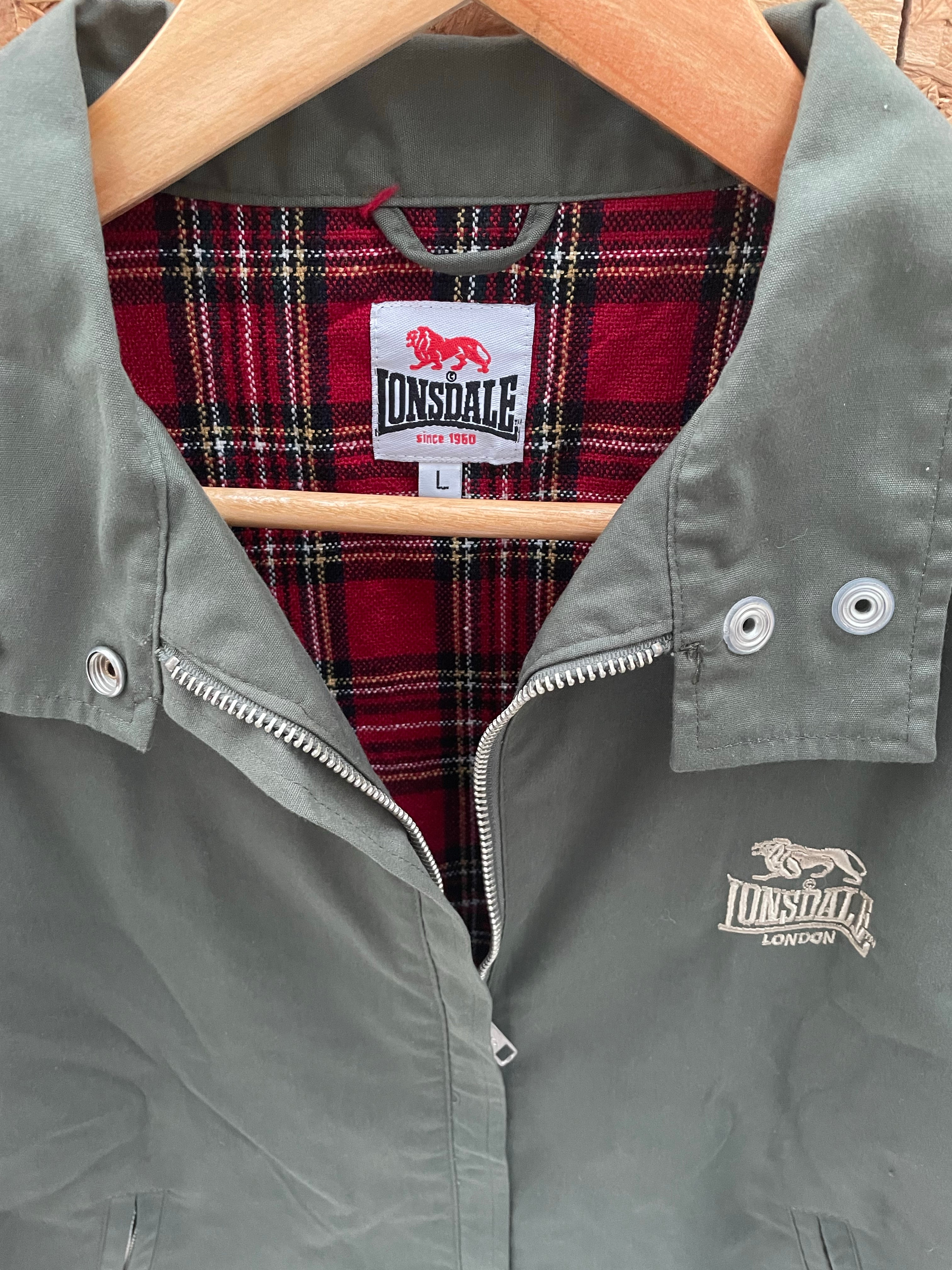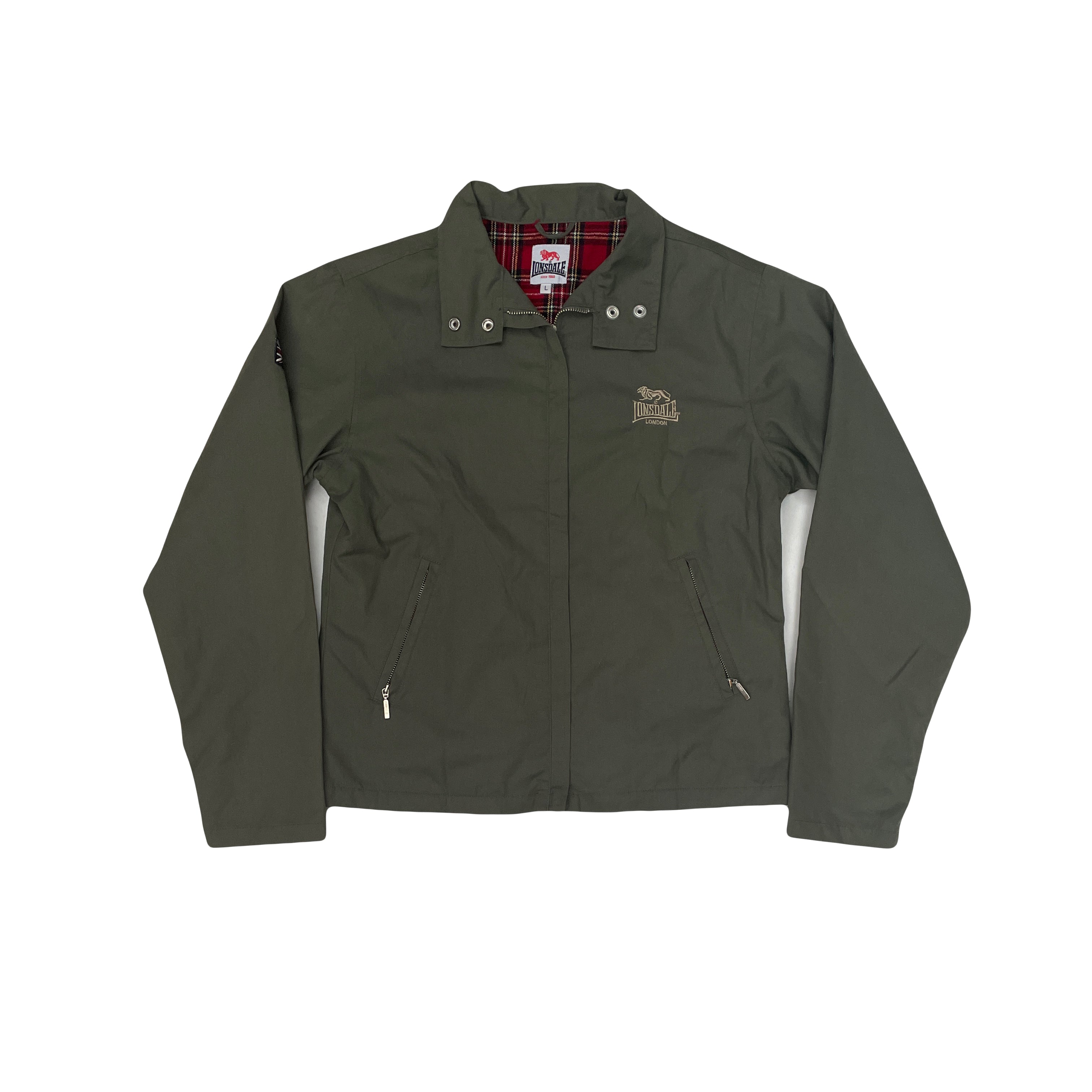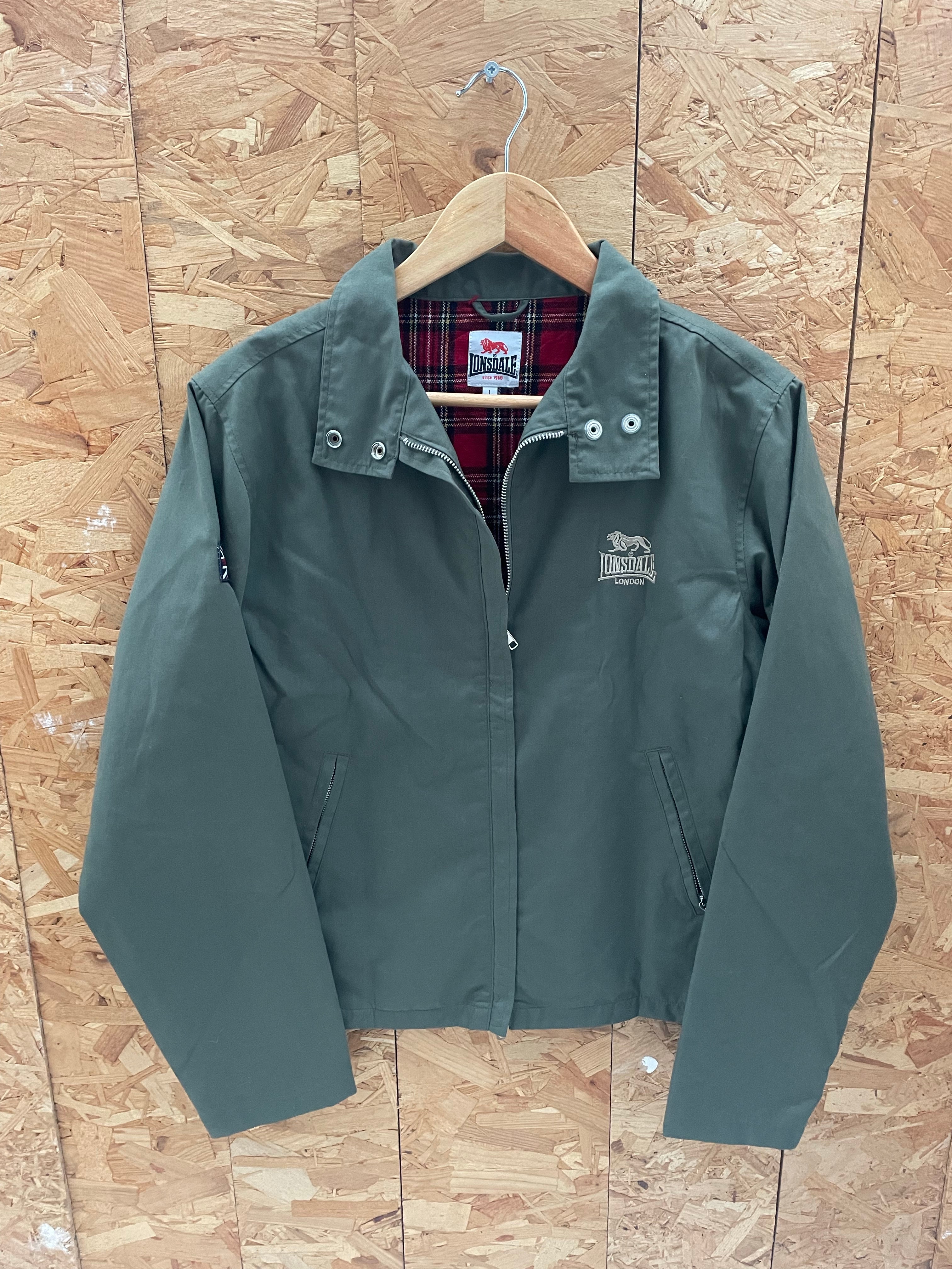 This Lonsdale London jacket is a stylish and practical outerwear piece. It features a classic olive green exterior with a red and black plaid lining for a touch of British flair. The jacket has a full zip closure, two side pockets, and a subtle embroidere