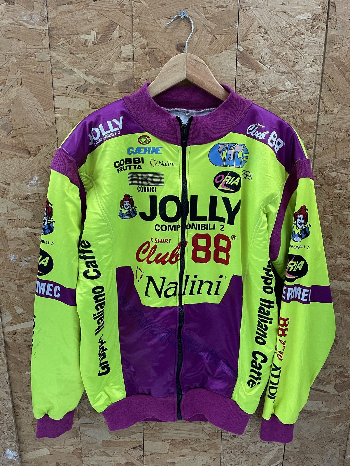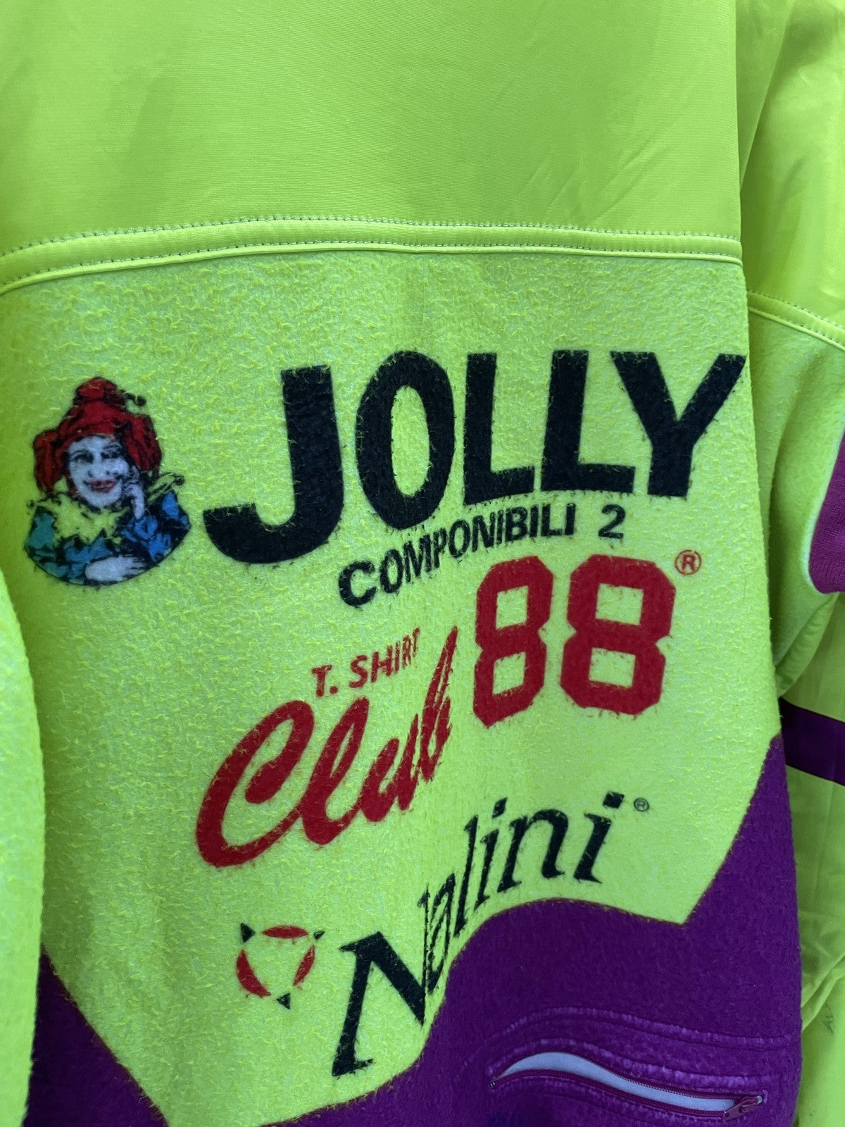 Retro Nalini Jolly Club 88 racing jacket in a vibrant neon yellow and purple colorway. Features multiple sponsor logos and a full zip closure. Perfect for collectors or a unique streetwear statement. true vintage condition, some marks on sleeve