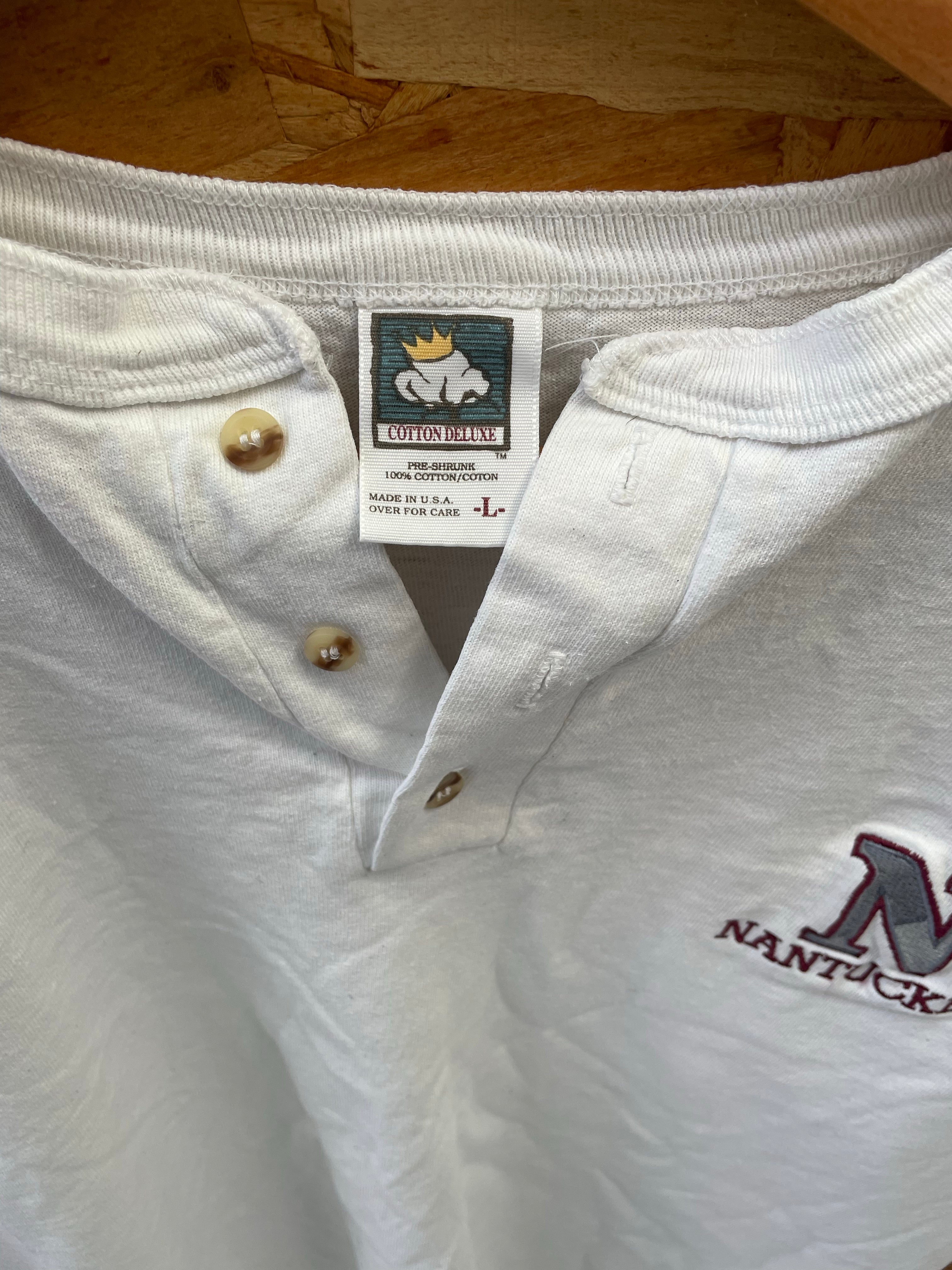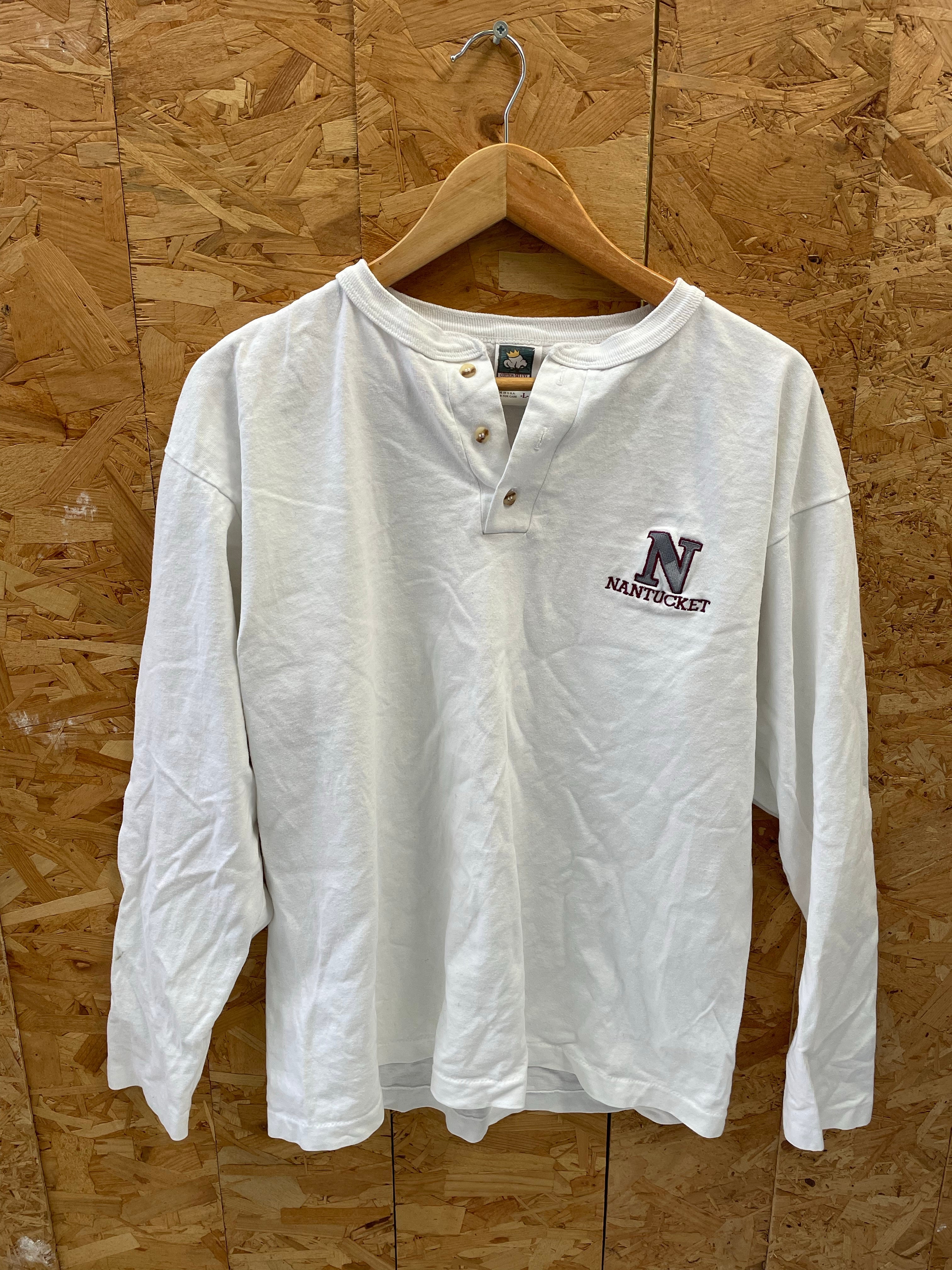 Vintage Nantucket henley long sleeve shirt. Size Large. White cotton. Excellent condition. Features a small embroidered logo. USA made Color: White.