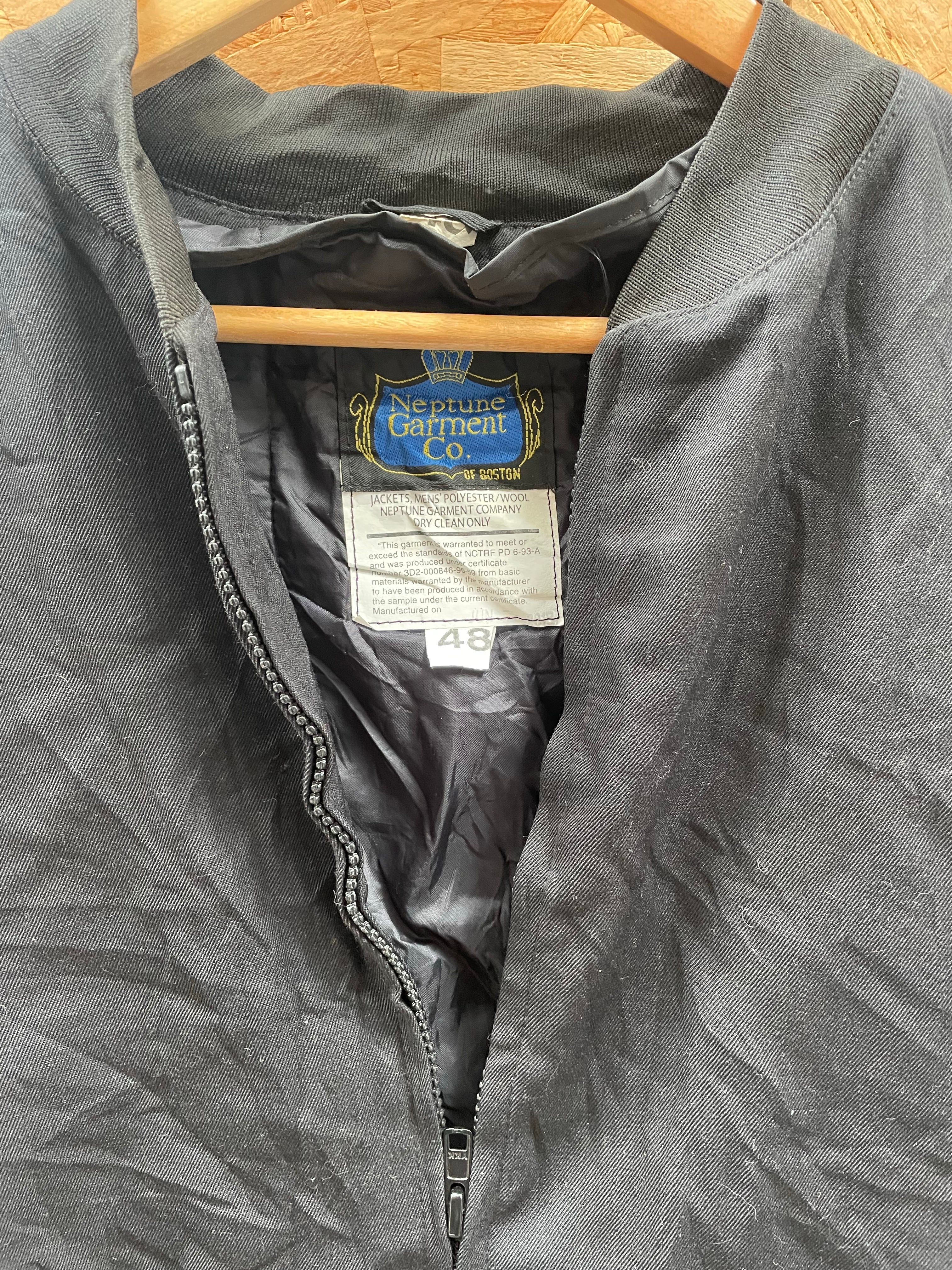 Vintage Neptune Garment Co. men's bomber jacket in black. Size 48. Fits as large Features a zip front closure and ribbed cuffs and hem. Detachable inner quilted gilet. Excellent pre-owned condition. Color: Black.