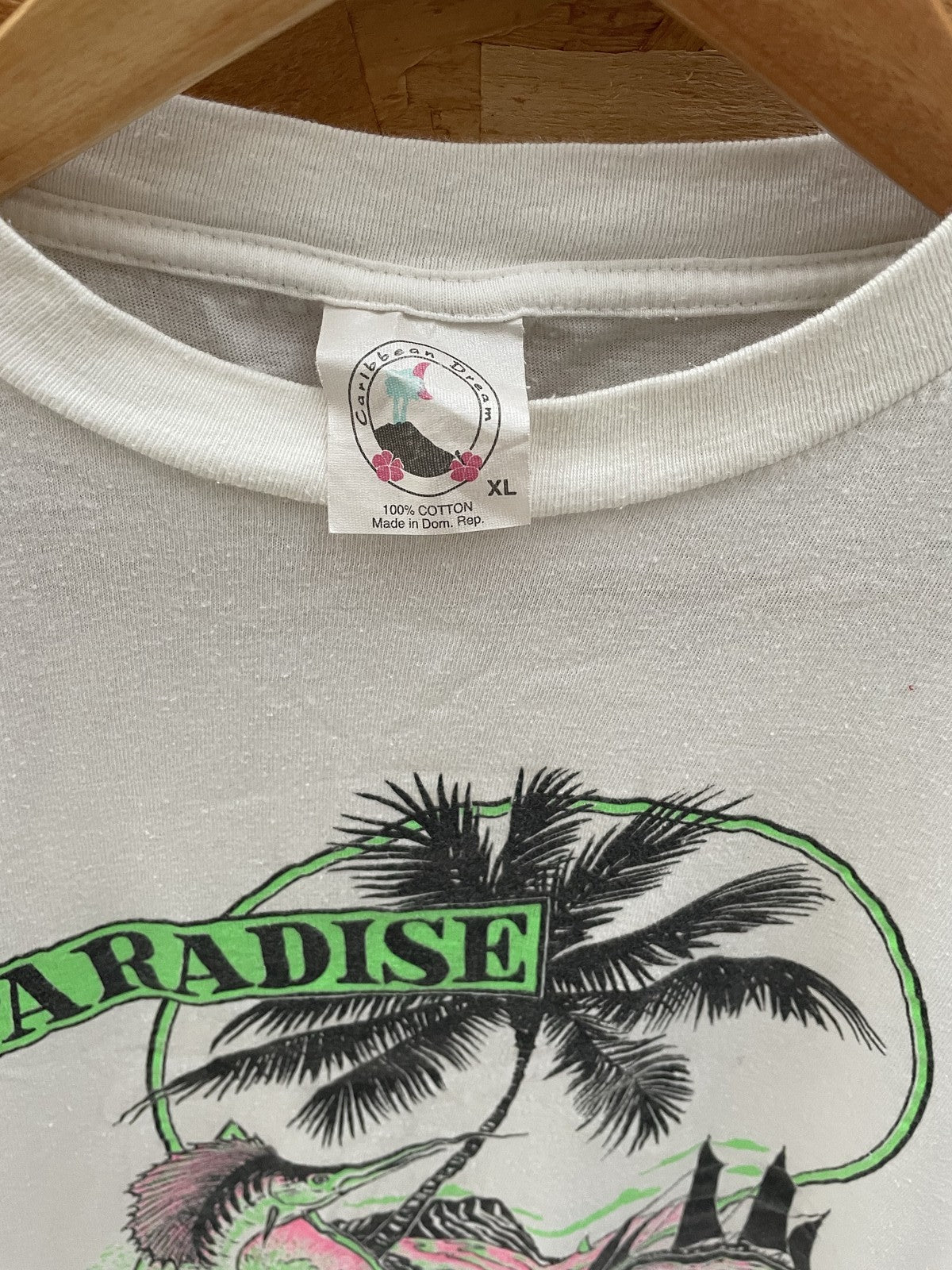 Step into paradise with this vintage white t-shirt featuring a vibrant graphic of palm trees, a sailboat, and the word 'Hawaii'. This tee is perfect for anyone who loves tropical vibes and retro style. Made from 100% cotton on single stitch boxy fit