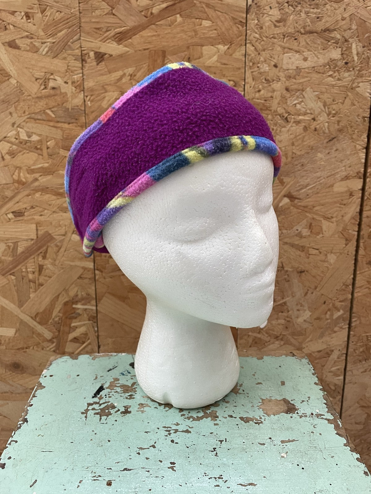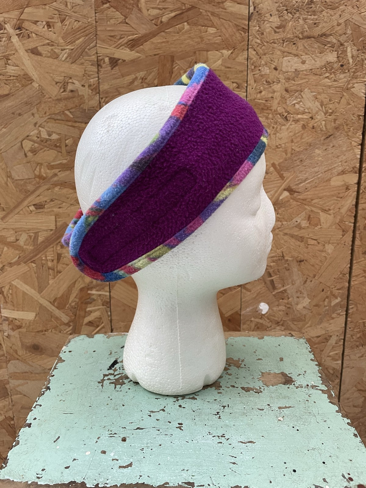 Cozy purple fleece ear warmer headband with a colorful plaid trim and embroidered snowflake graphic. Perfect for keeping warm during winter activities. One size fits most.