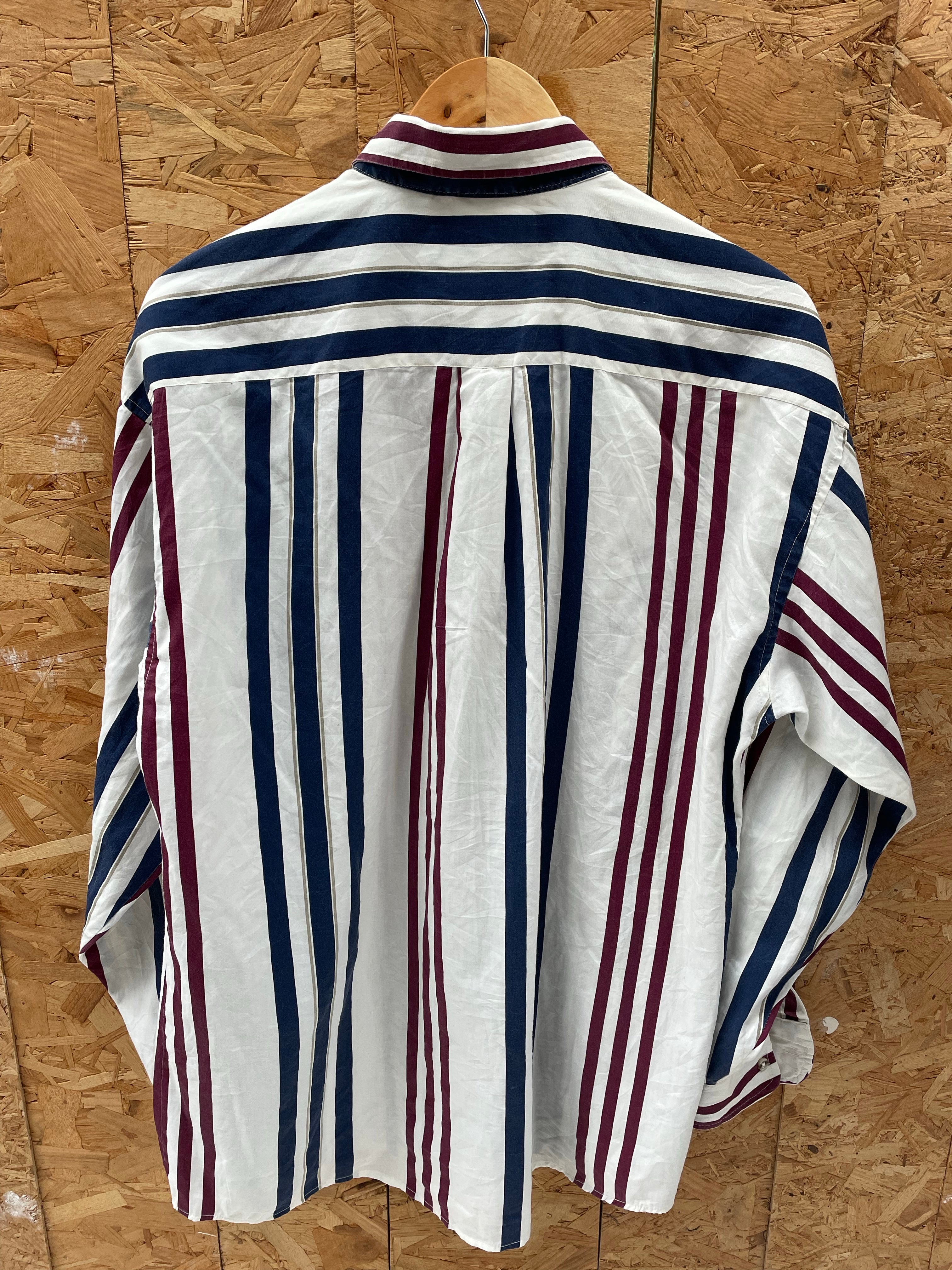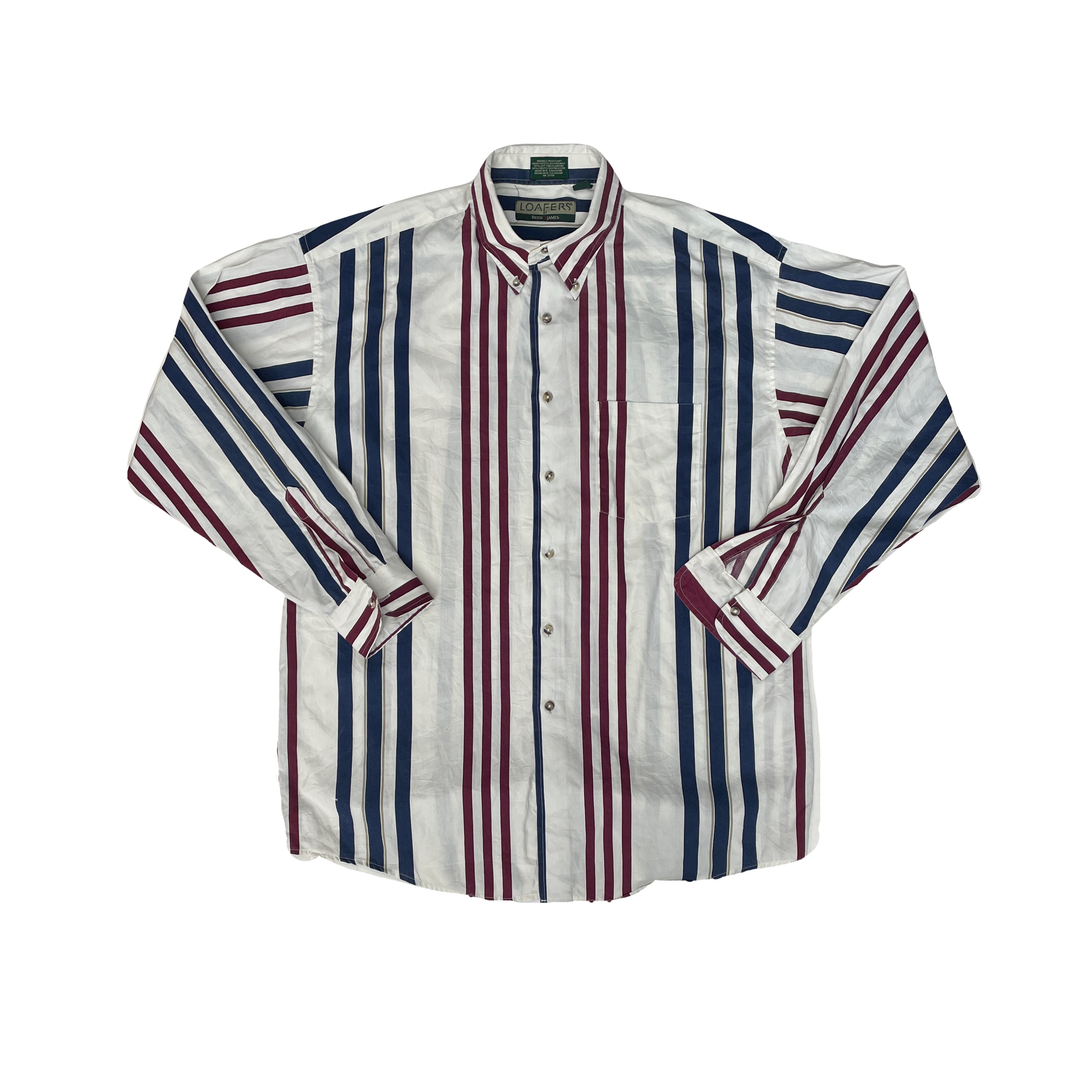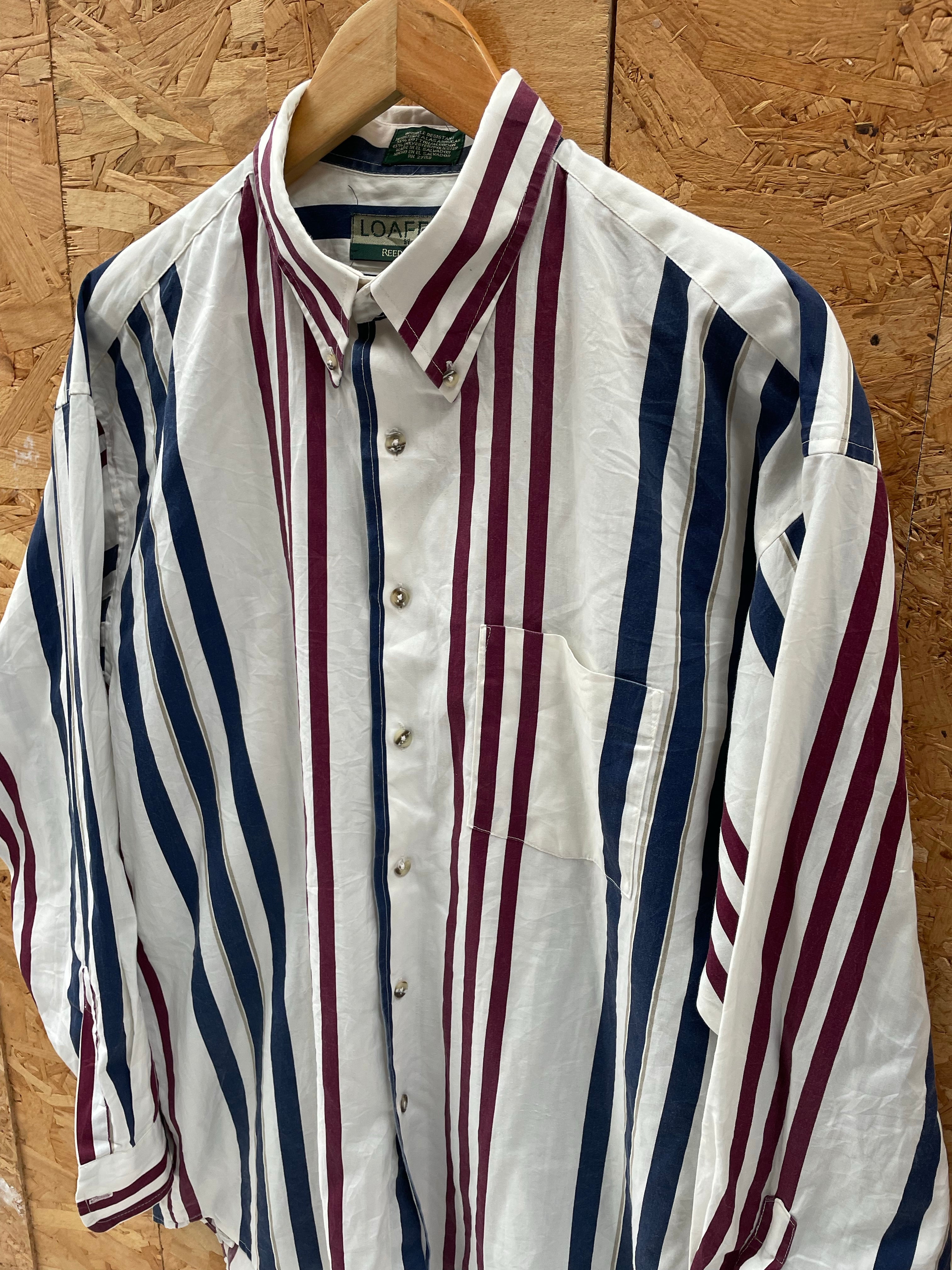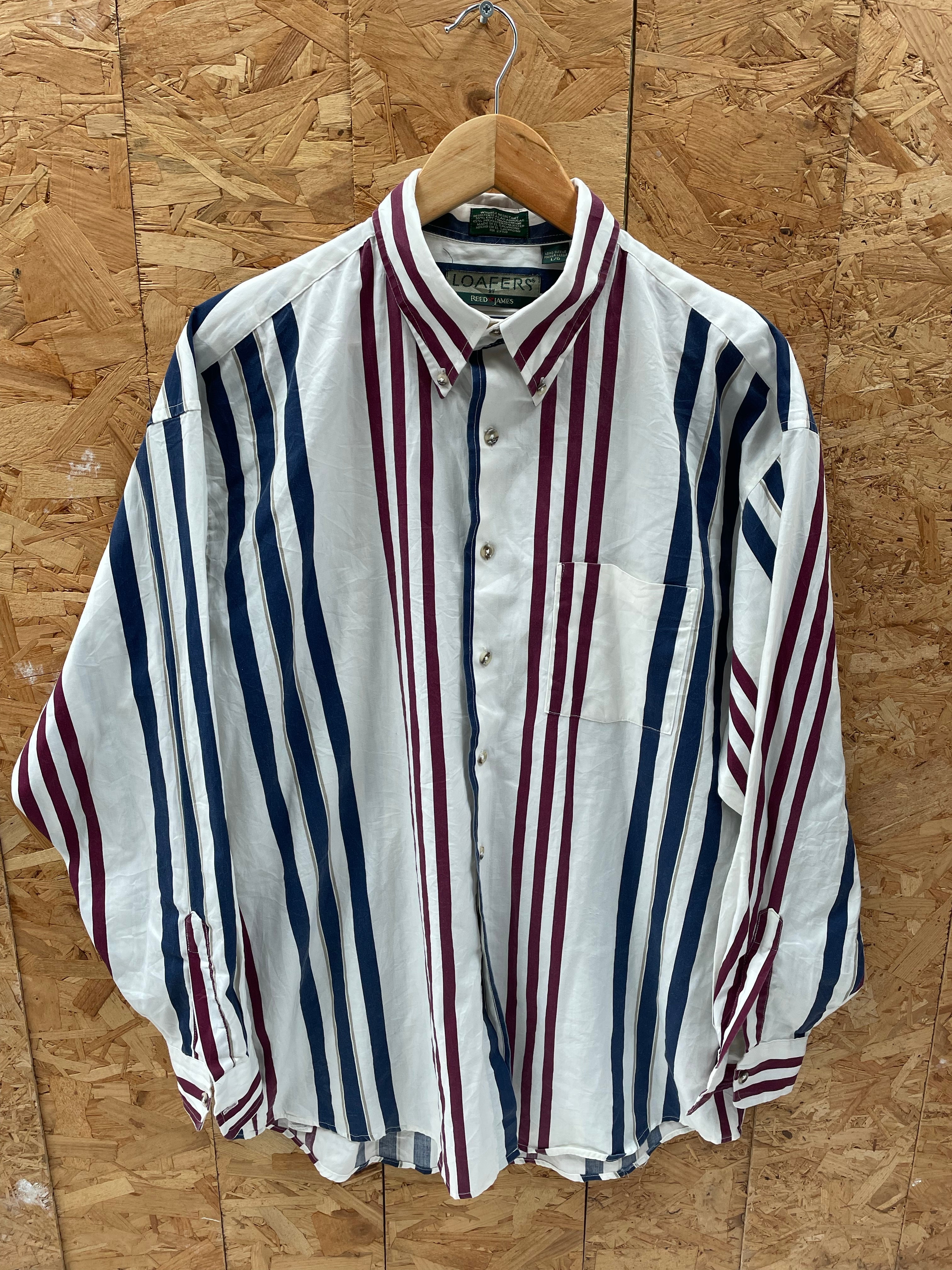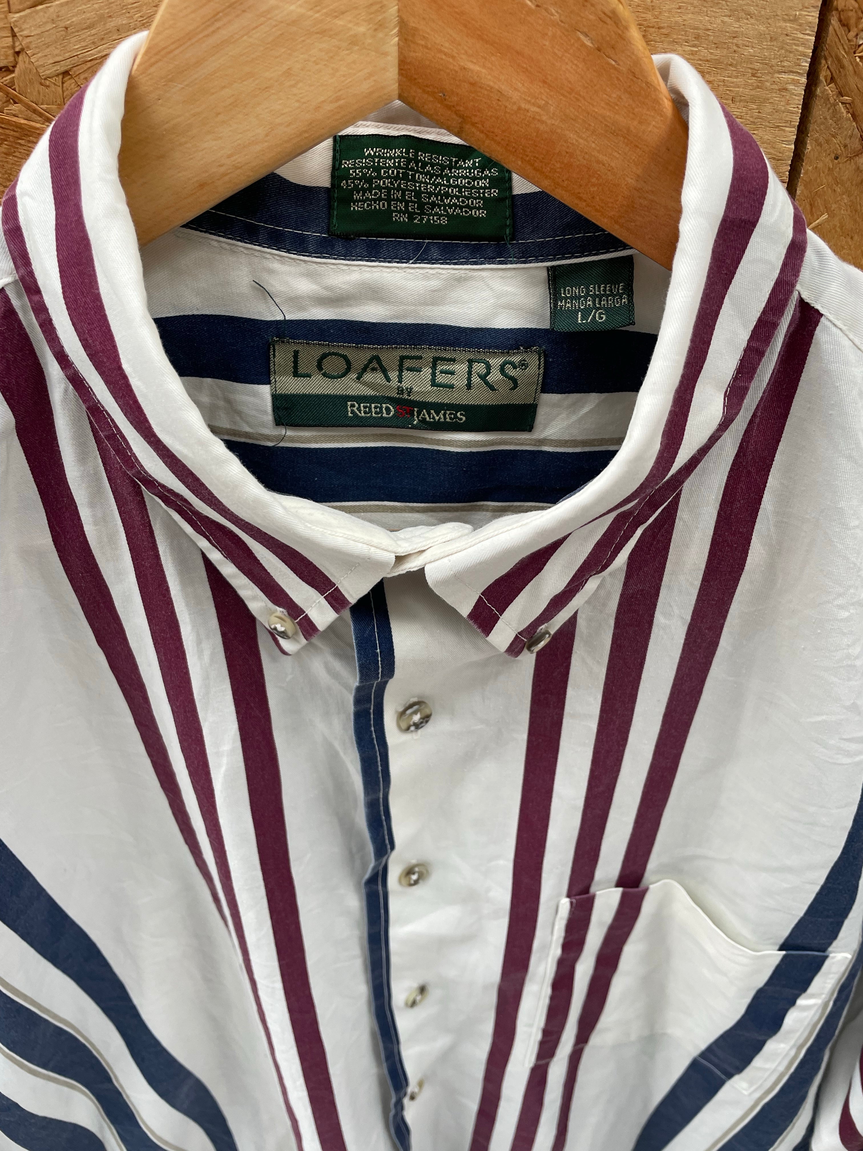 Vintage Reed James Loafers long sleeve button down shirt. Features a classic striped pattern in white, burgundy, navy and light beige. Size Large. Color: Multicolor.