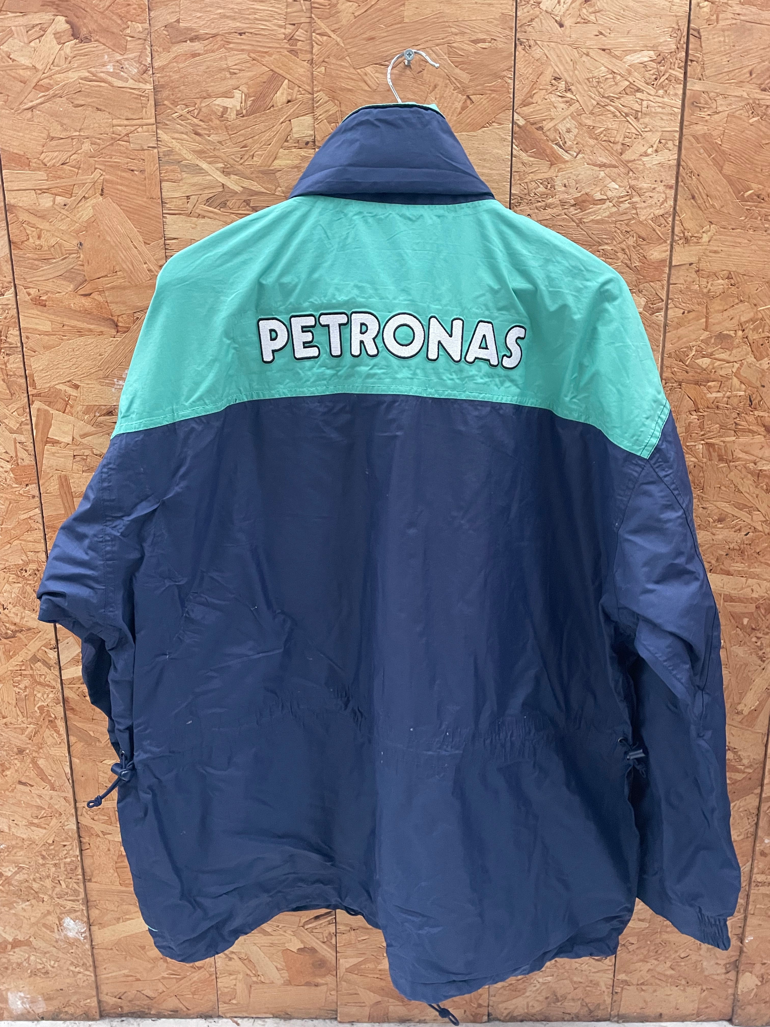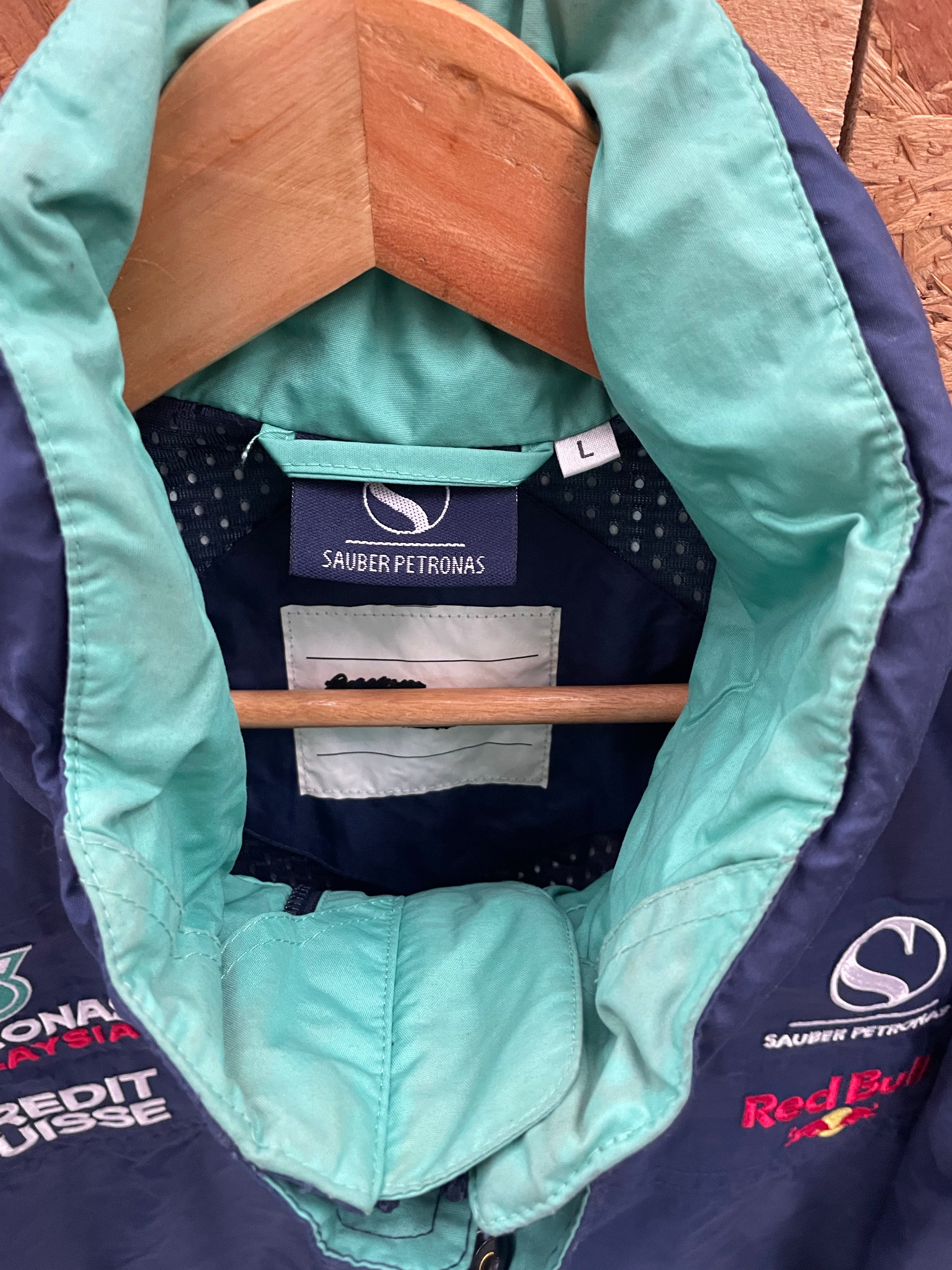 Vintage Sauber Petronas Red Bull Credit Suisse Formula 1 Team racing jacket. Features iconic team branding on the front and back. Navy blue with green accents. Adjustable cuffs and waist. A must-have for any motorsport fan!