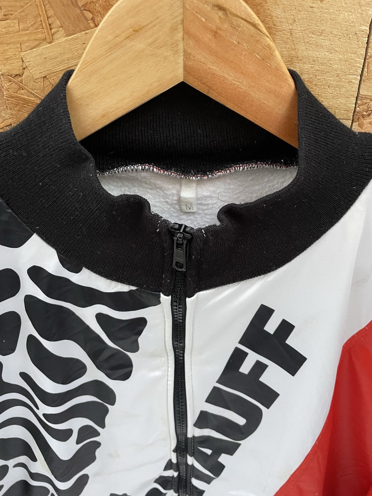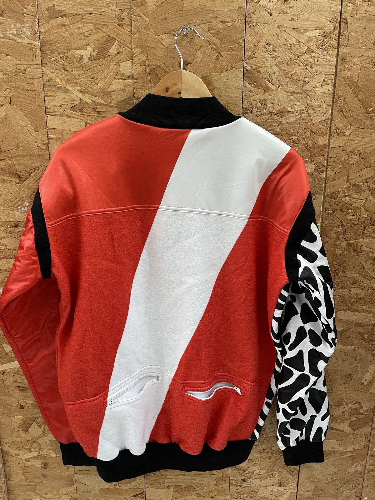 Retro Schauff Velo cycling jacket featuring a bold color-block design with red, white, and a striking black and white animal print on the sleeves. This track jacket has a full zip closure, ribbed cuffs and hem, and two zippered pockets on the back. Perfec