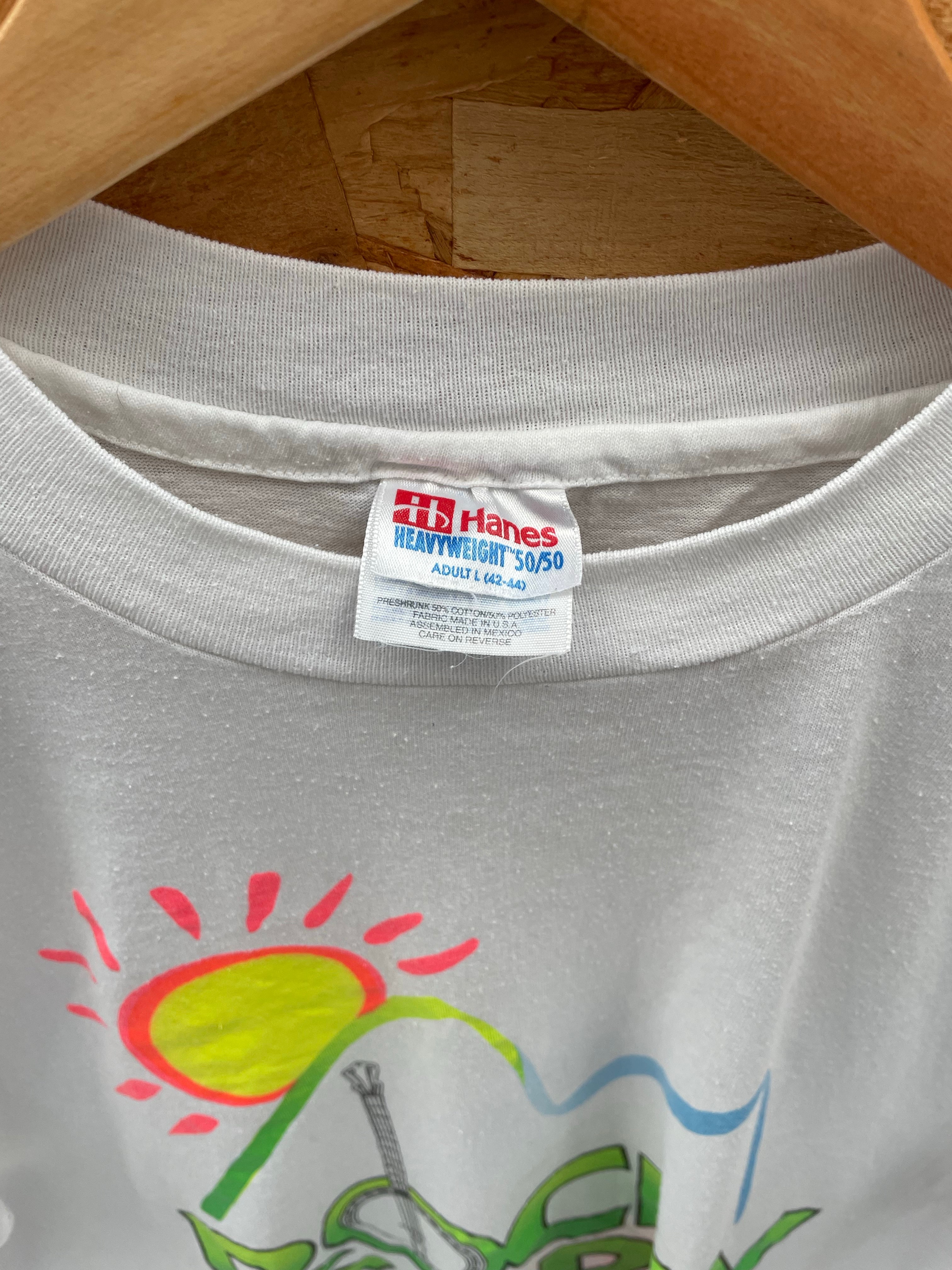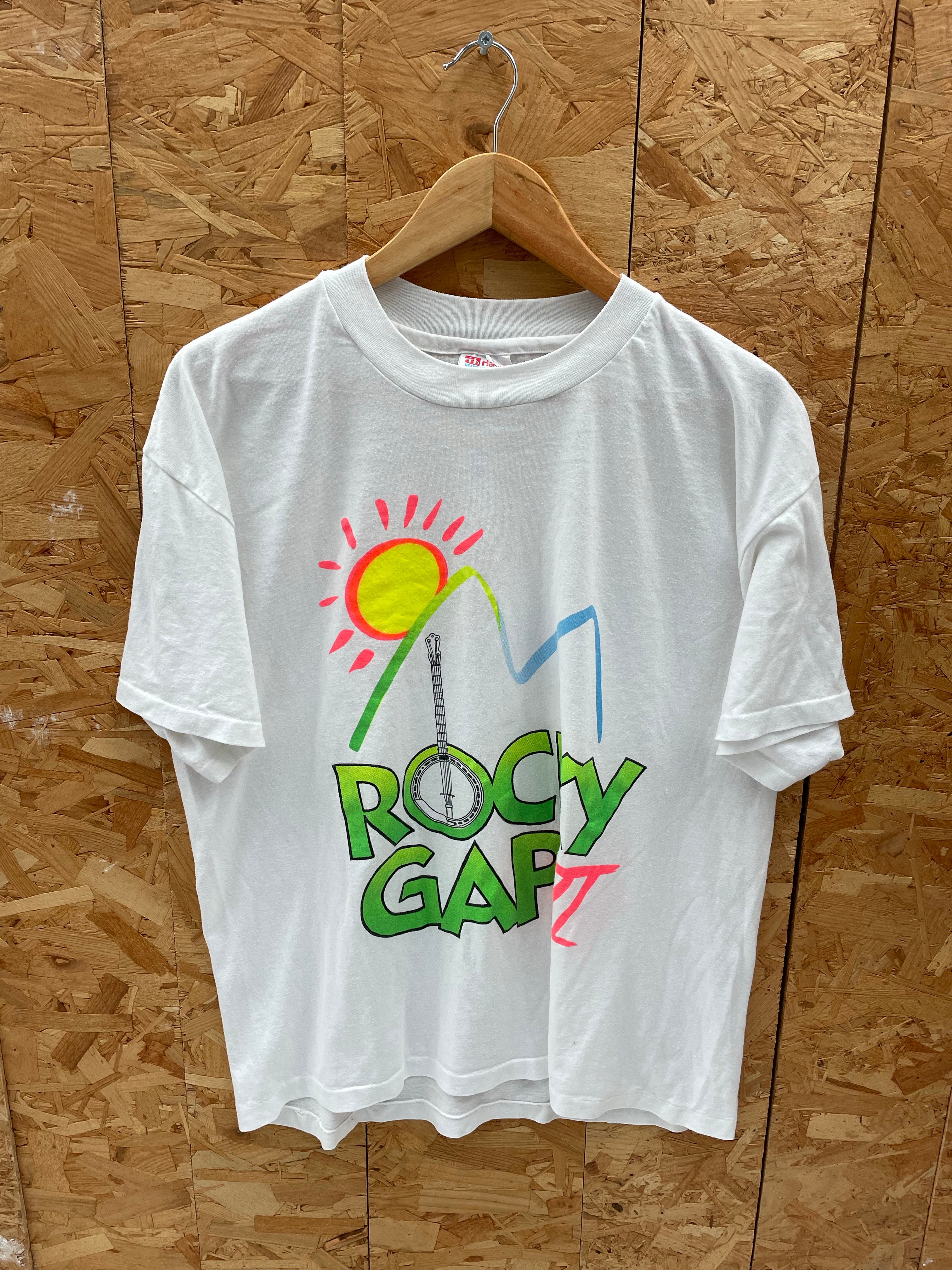 Vintage Hanes Heavyweight 50/50 t-shirt featuring a graphic for the Rocky Gap III music festival with banjo and sun design. Size Adult L. Perfect for collectors or fans of vintage music apparel.