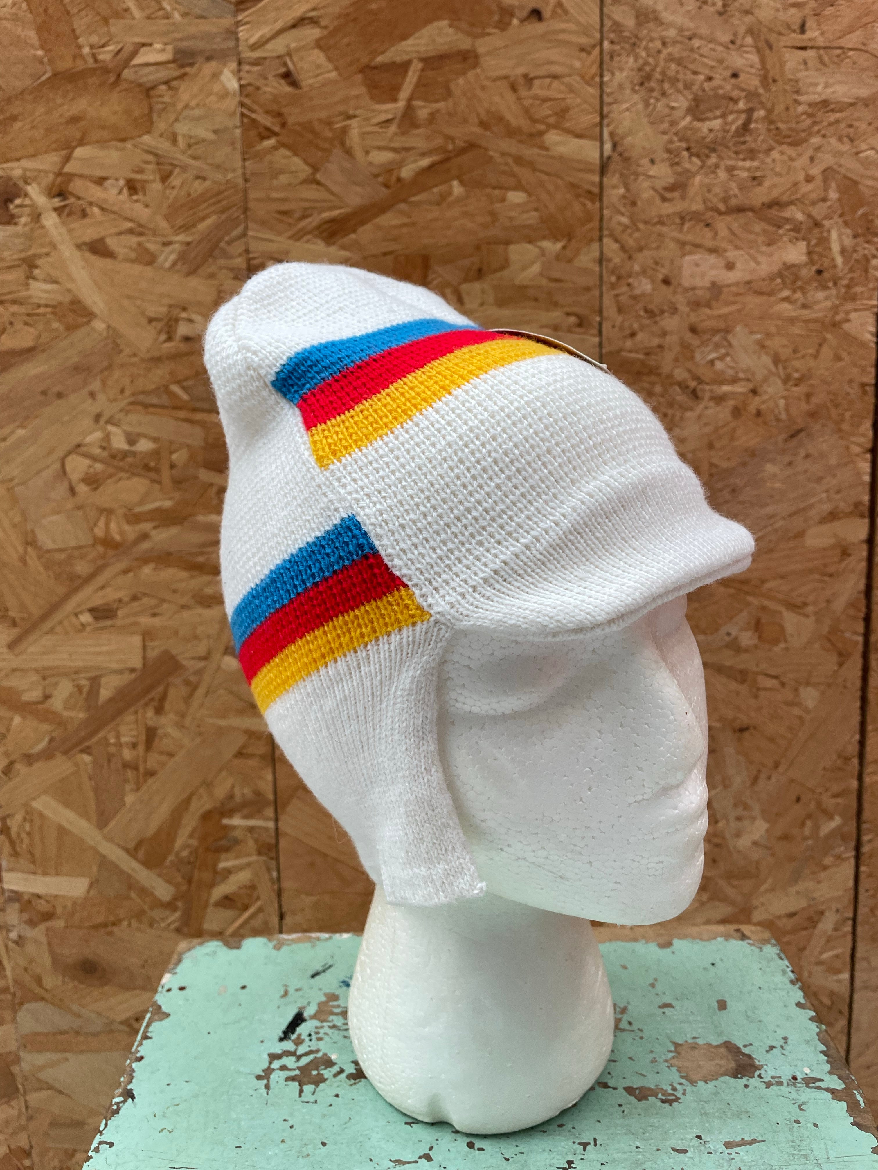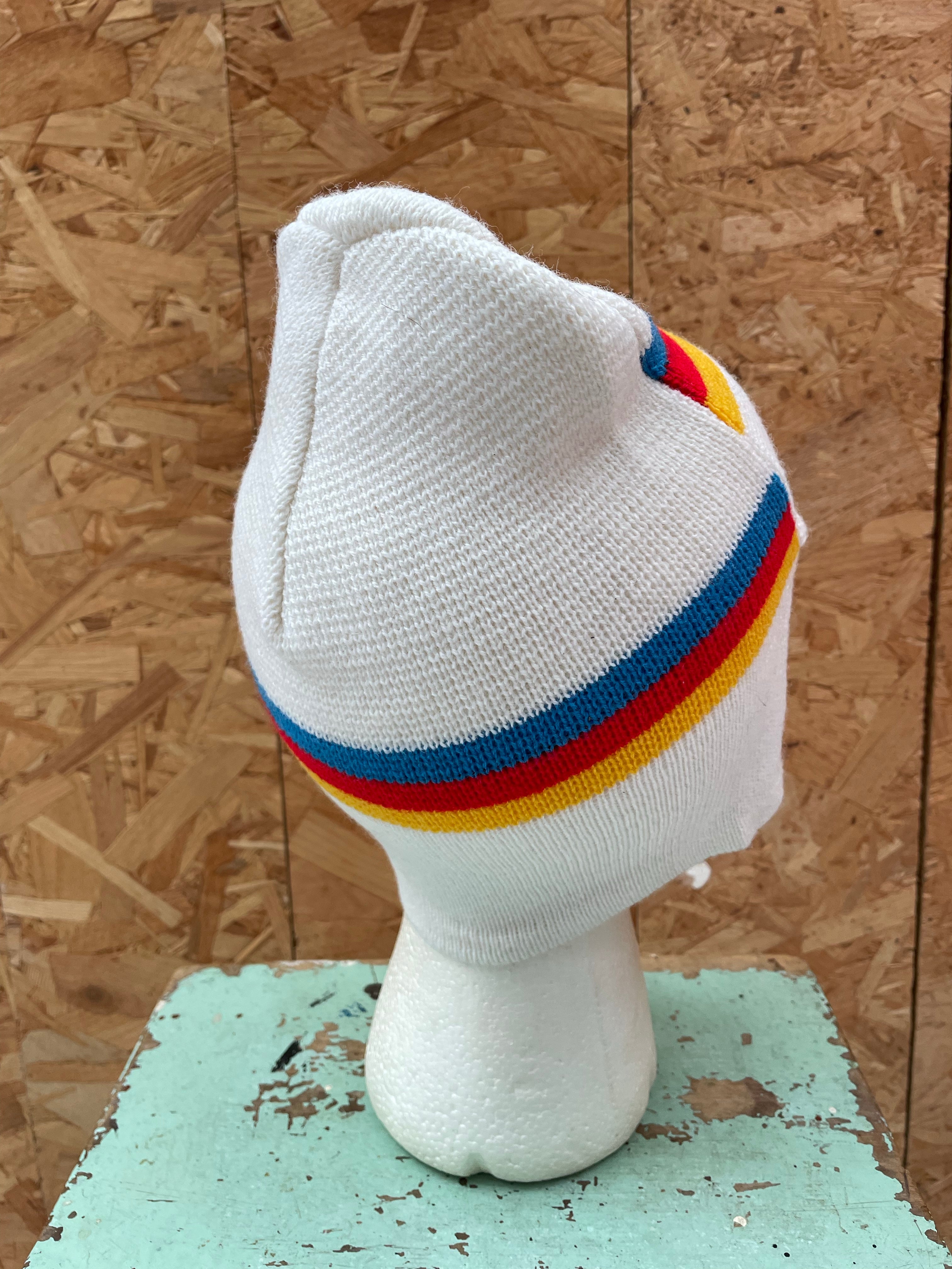 Vintage Sporten knit beanie hat. Features white knit with colorful stripes in red, yellow, and blue. Made in Italy. Appears to be in excellent condition with no visible signs of wear. A stylish retro accessory.