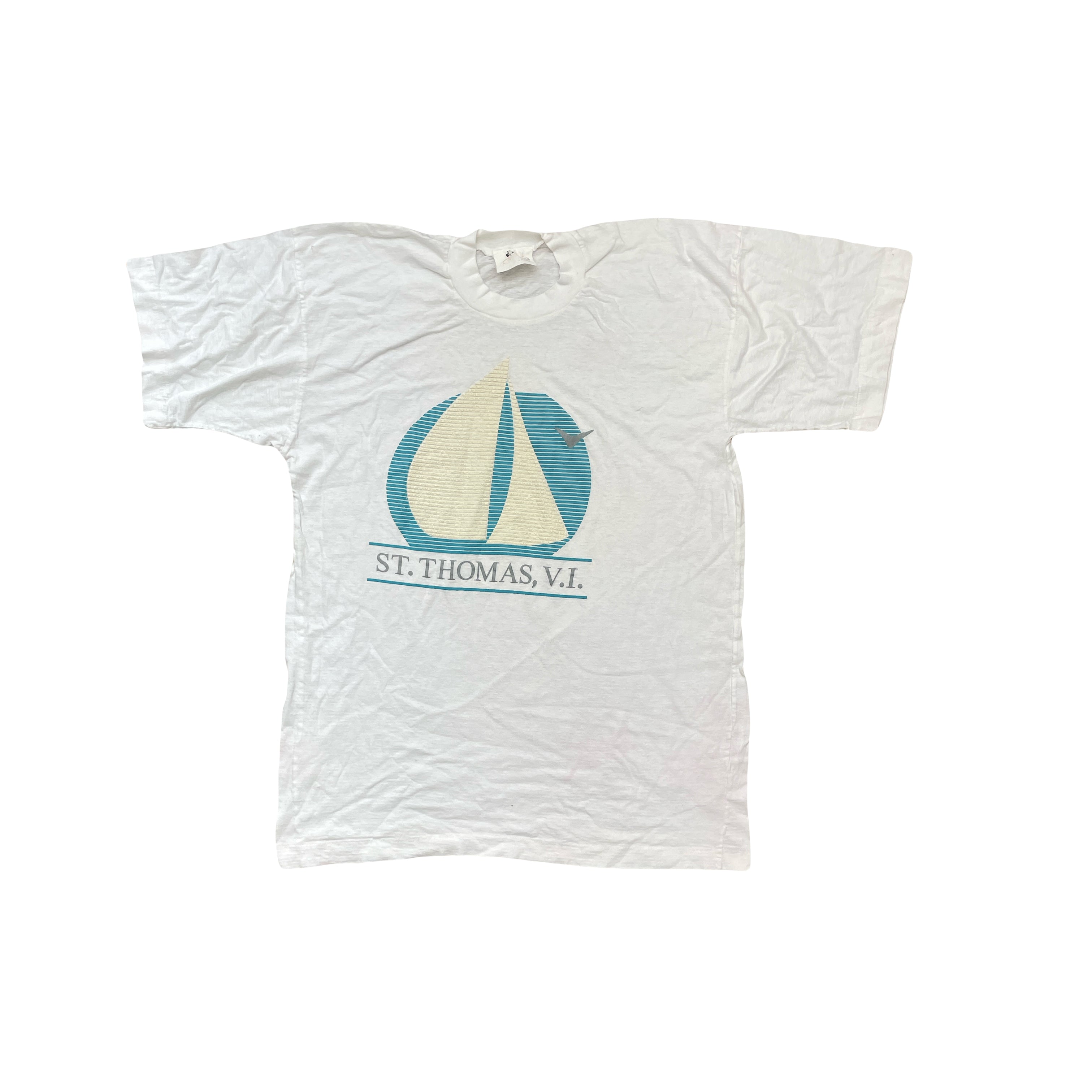 Vintage St. Thomas, V.I. graphic t-shirt. White cotton tee with sailboat design. textured foam print. Shows some minor wear consistent with age. Great for casual summer style. Fits as M Color: White.