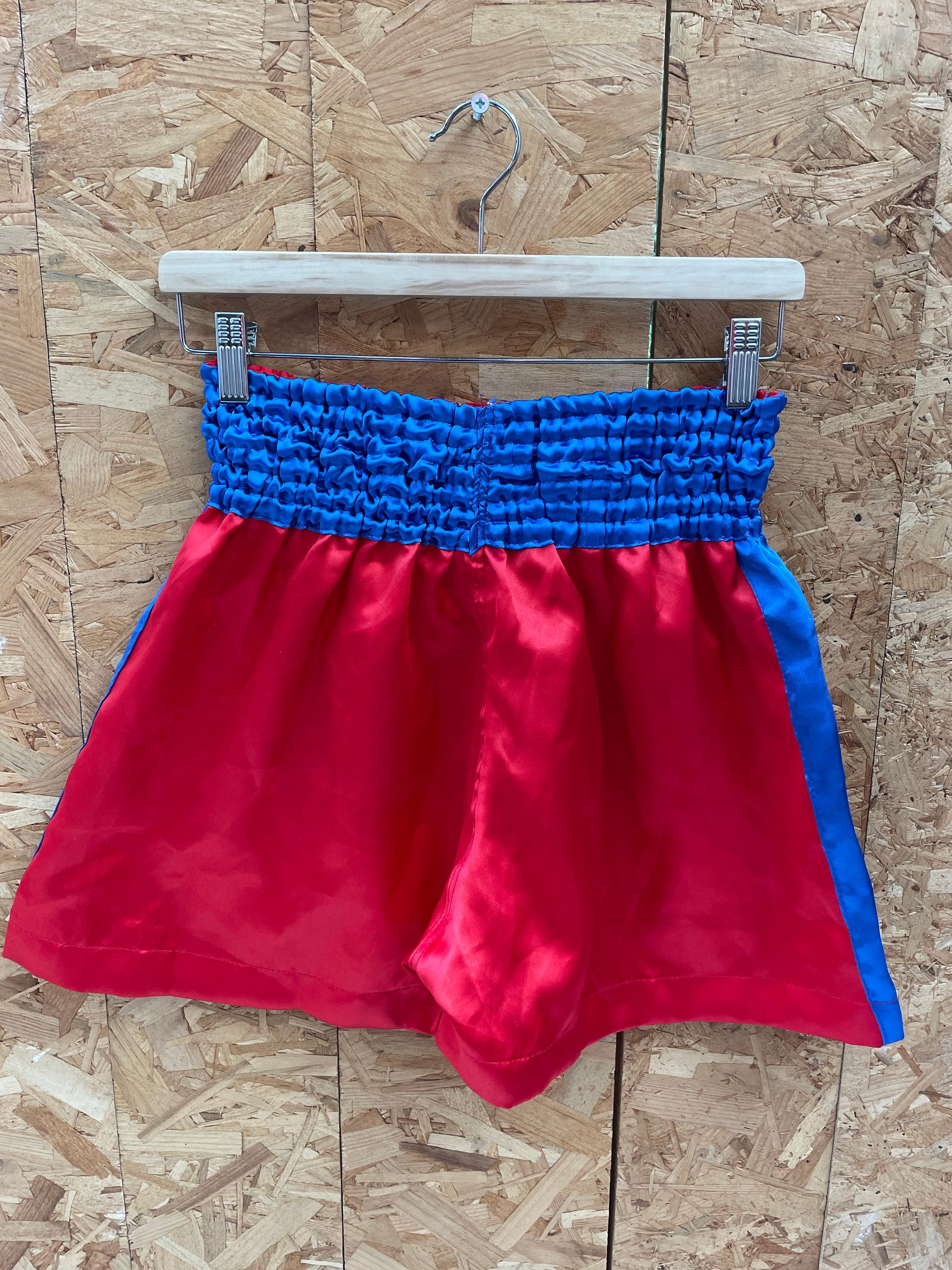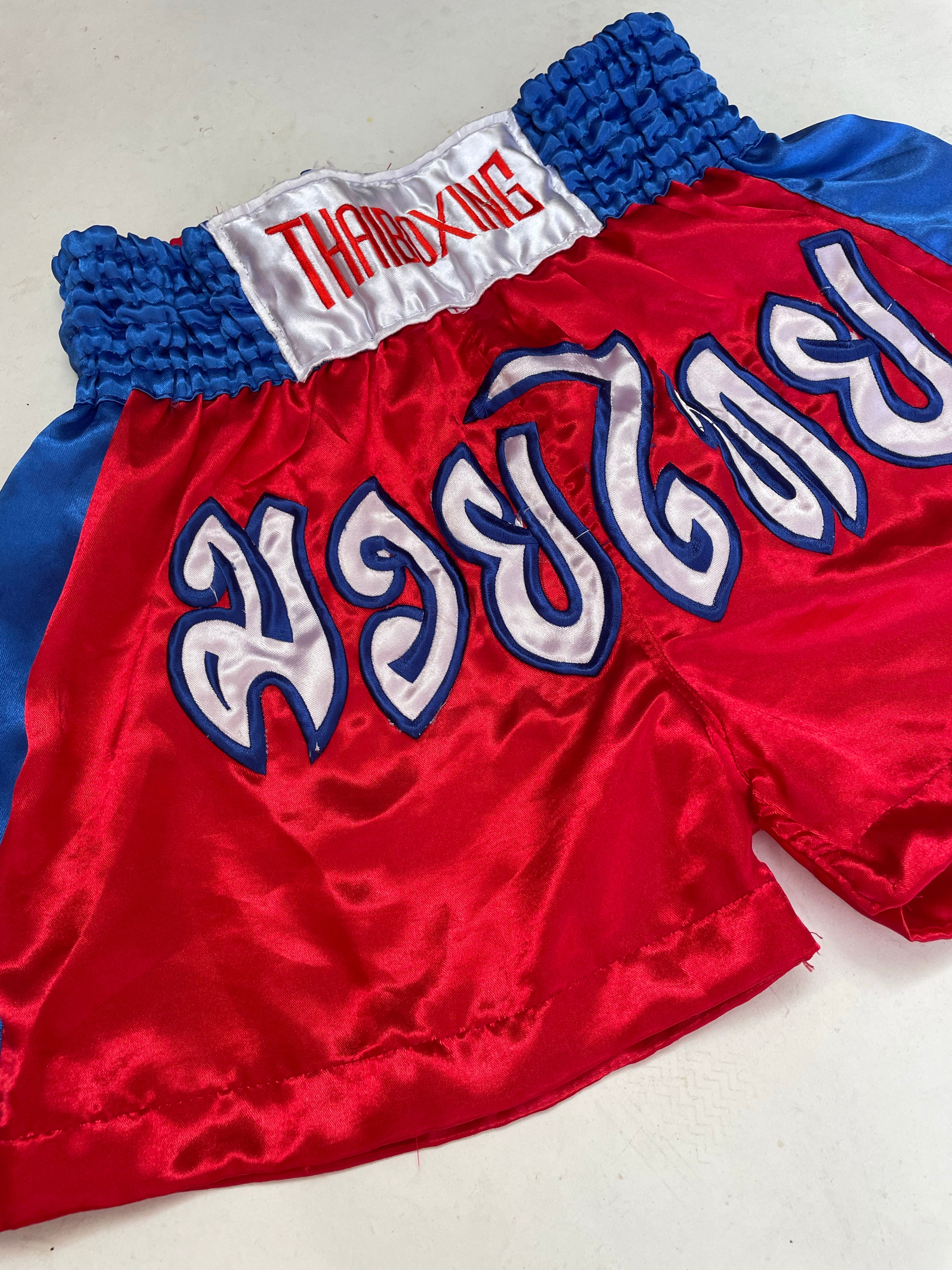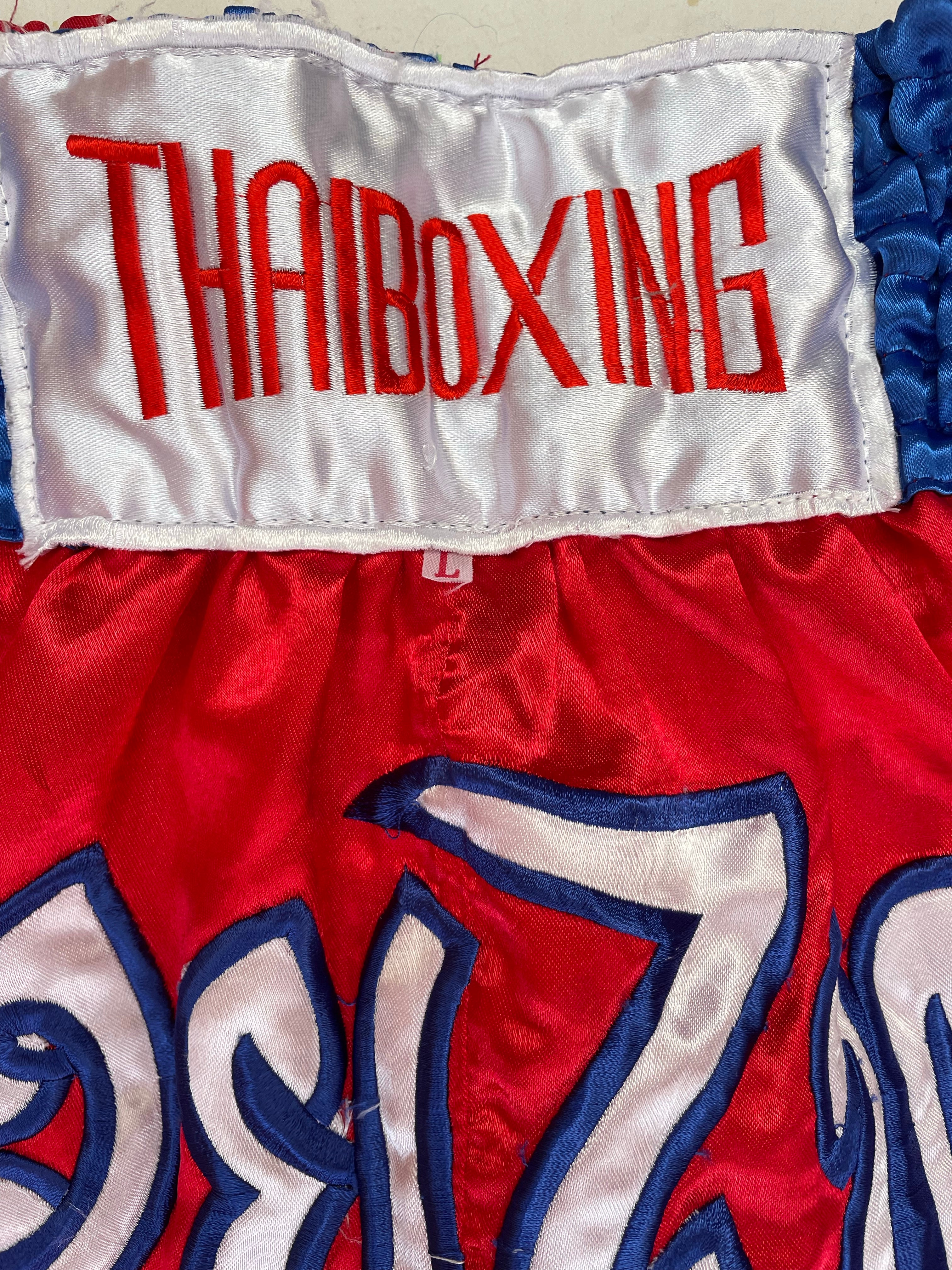 Authentic Thai Boxing muay thai shorts in red and blue. Size L. Great for training or sparring. Features embroidered design. Pre-owned, good condition.