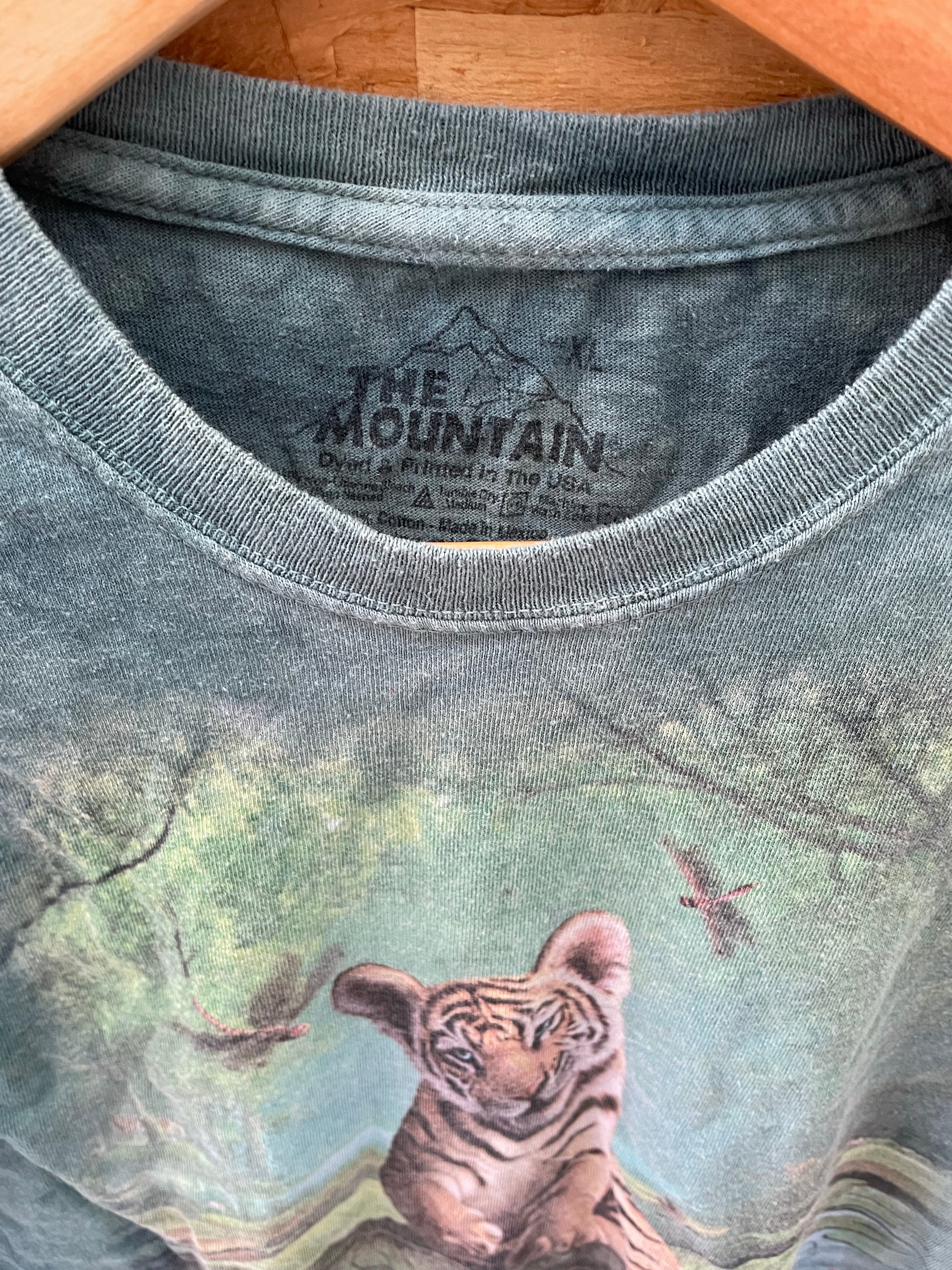 The Mountain Men's size M green t-shirt features a beautiful tiger cub design. It's a short sleeve crew neck tee in a tie-dye style. Pre-owned, good condition. Youth XL measures as an adult S Color: Green.