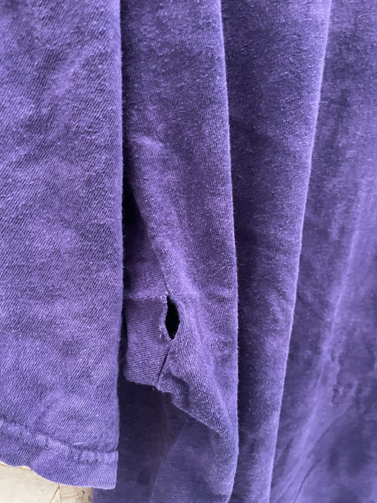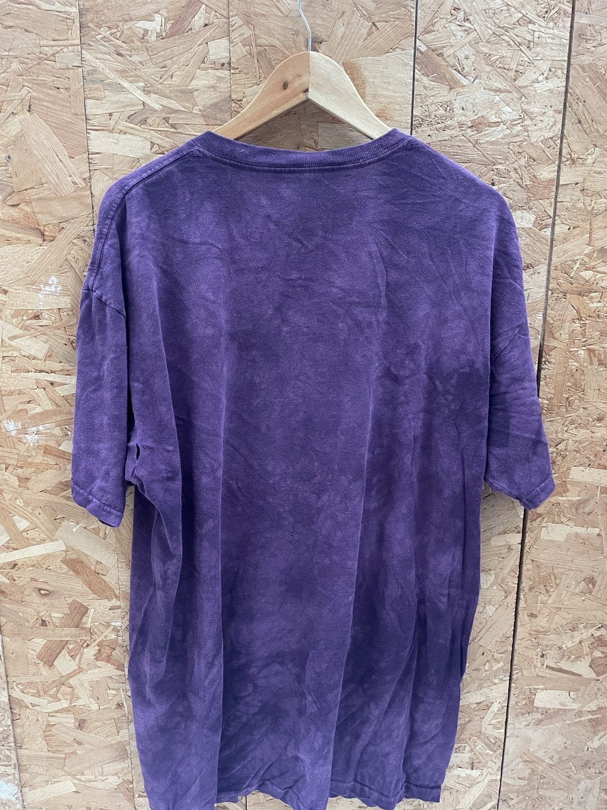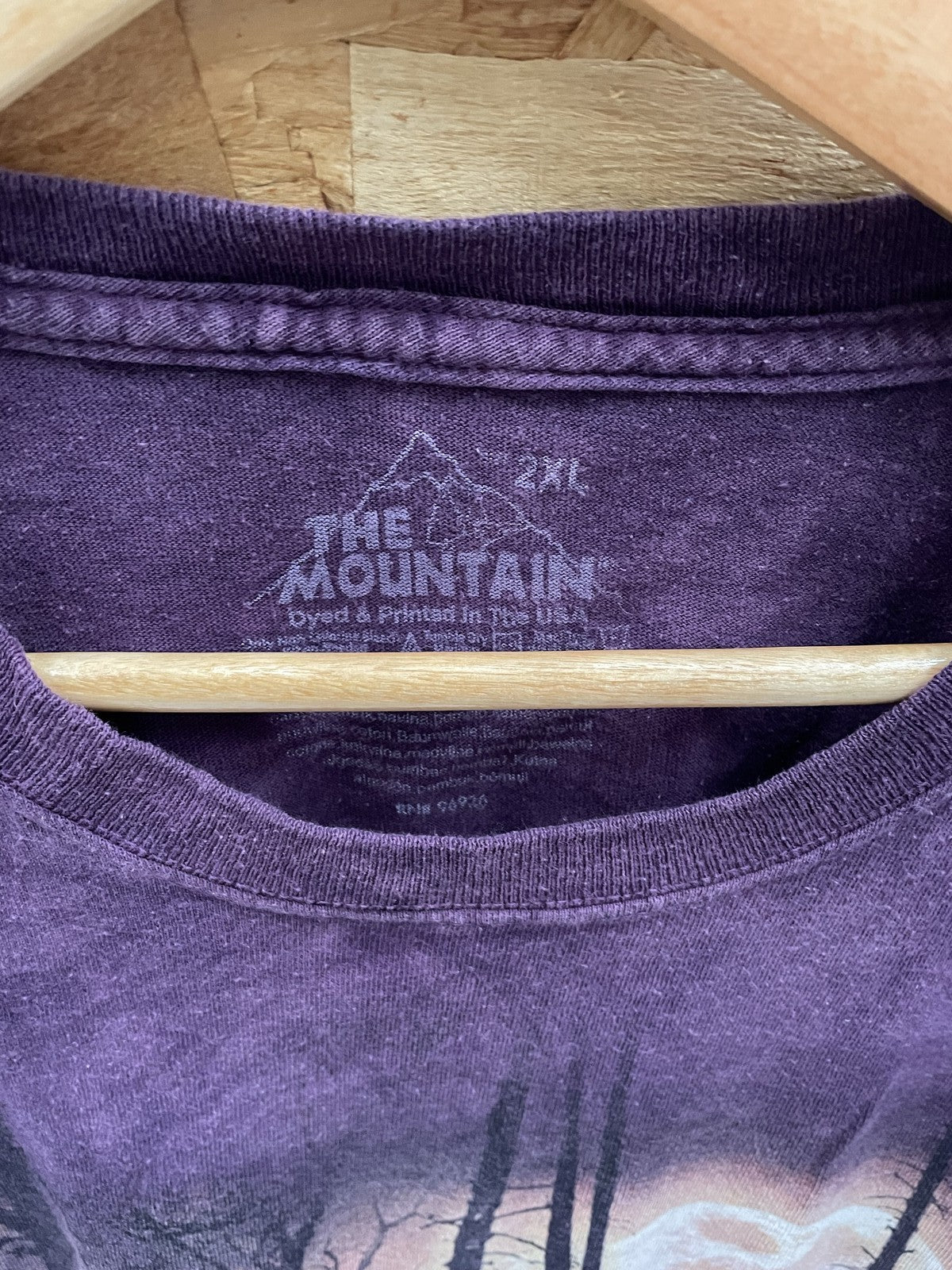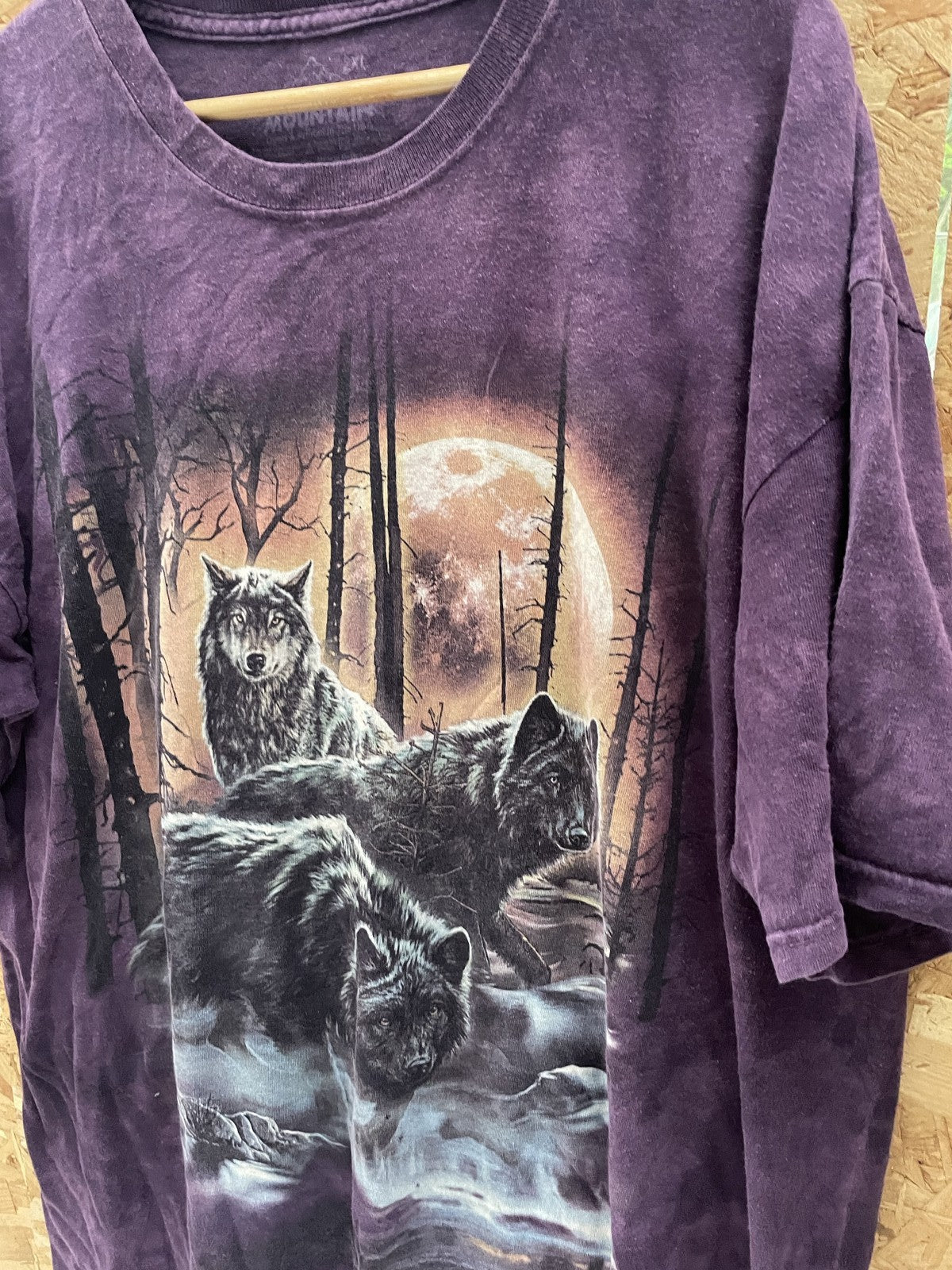This "The Mountain" tie-dye t-shirt features a striking wolf pack graphic under a full moon. Made with a comfortable cotton blend, it has a unique purple tie-dye pattern. Perfect for nature and animal lovers.