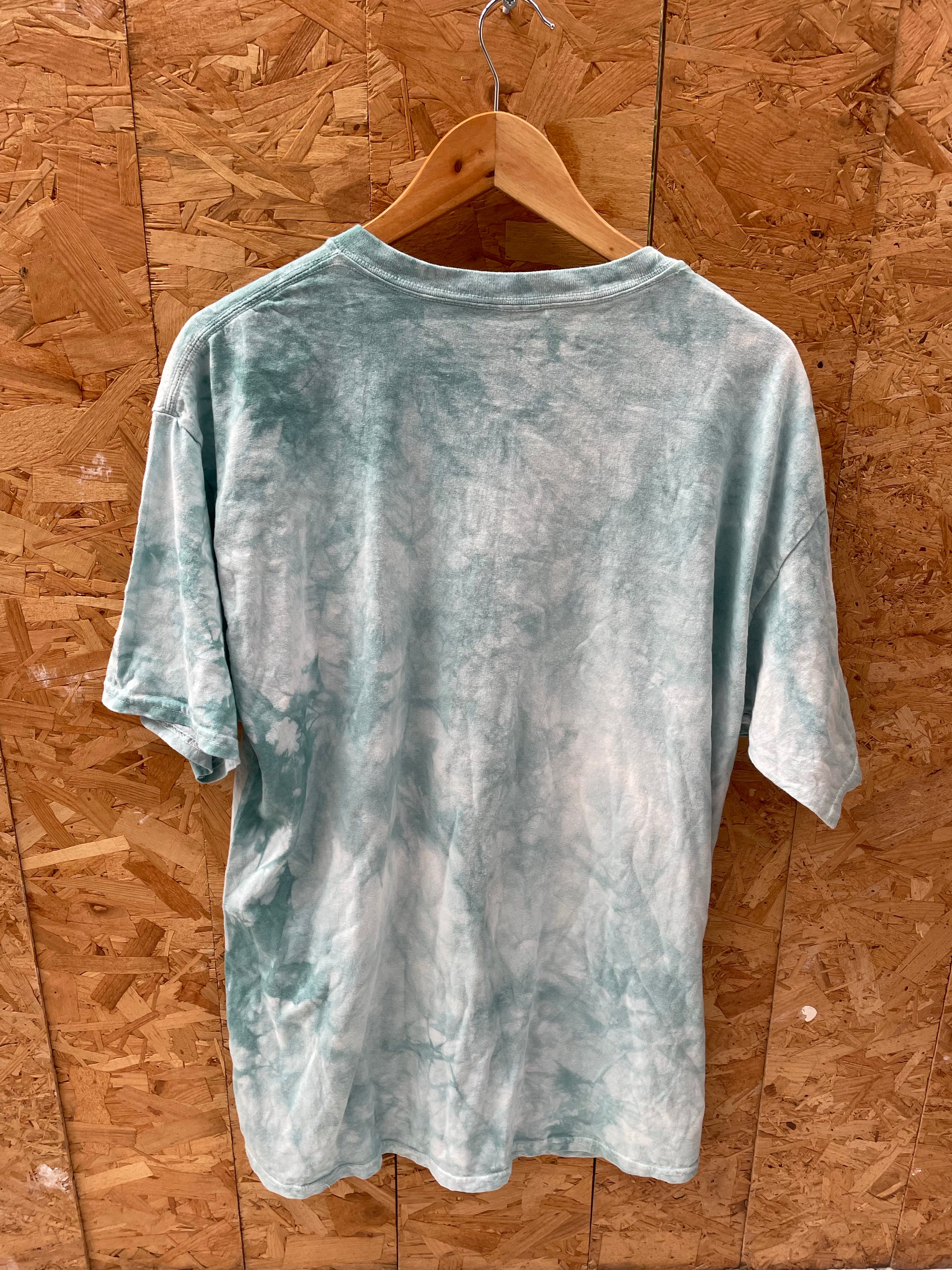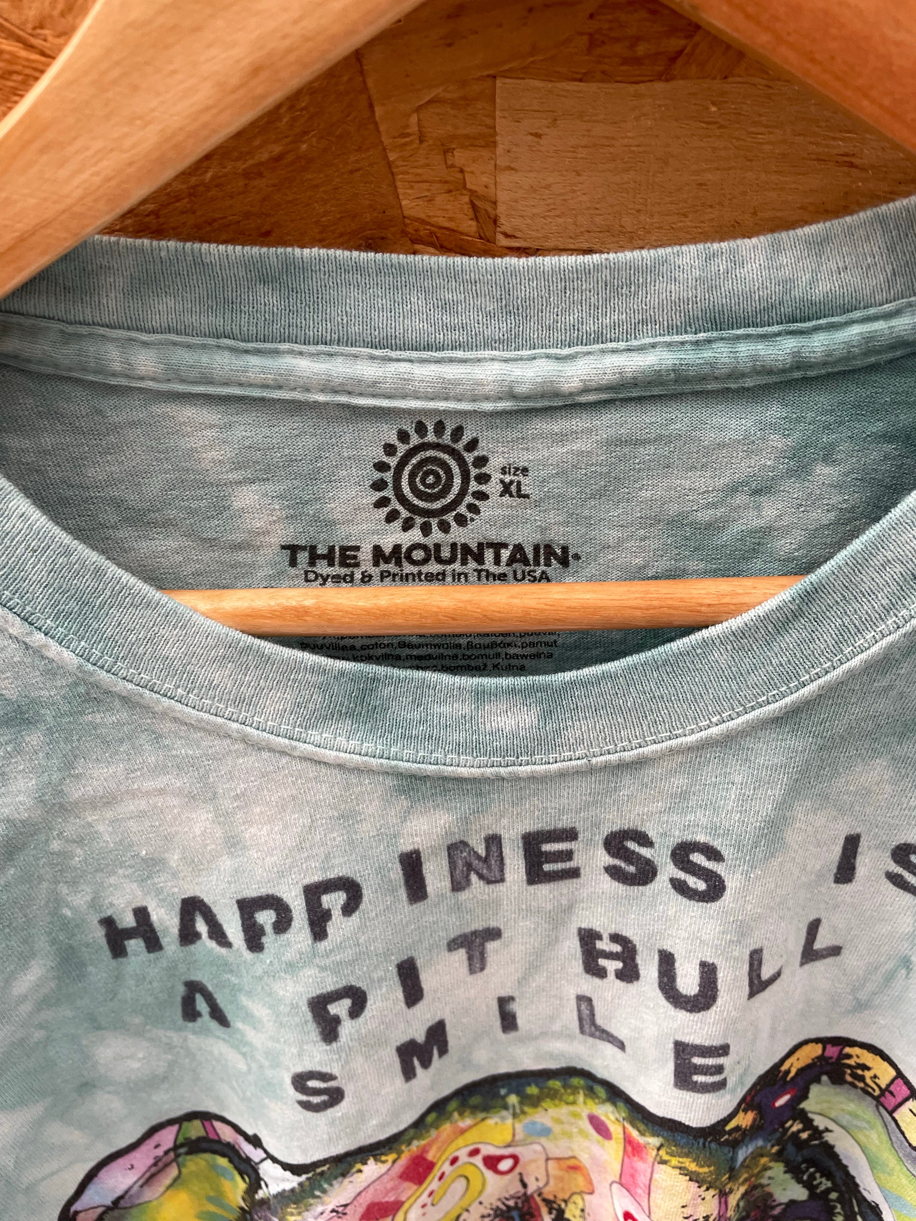 The Mountain brand tie-dye t-shirt, size XL. Features a colorful pitbull graphic with the text "Happiness is a Pitbull Smile". Soft, comfortable teal tie-dye fabric. Excellent condition. Color: Teal.