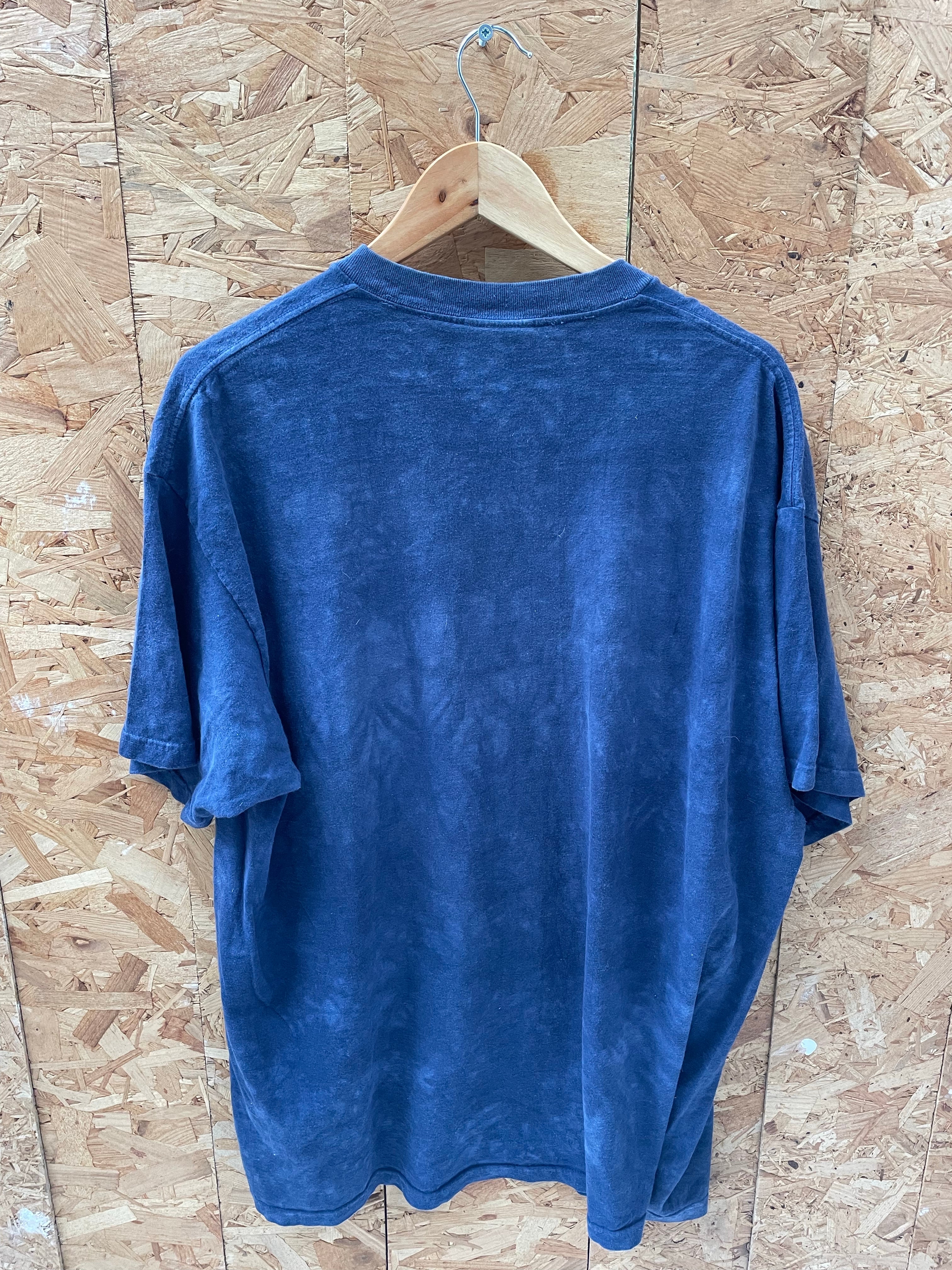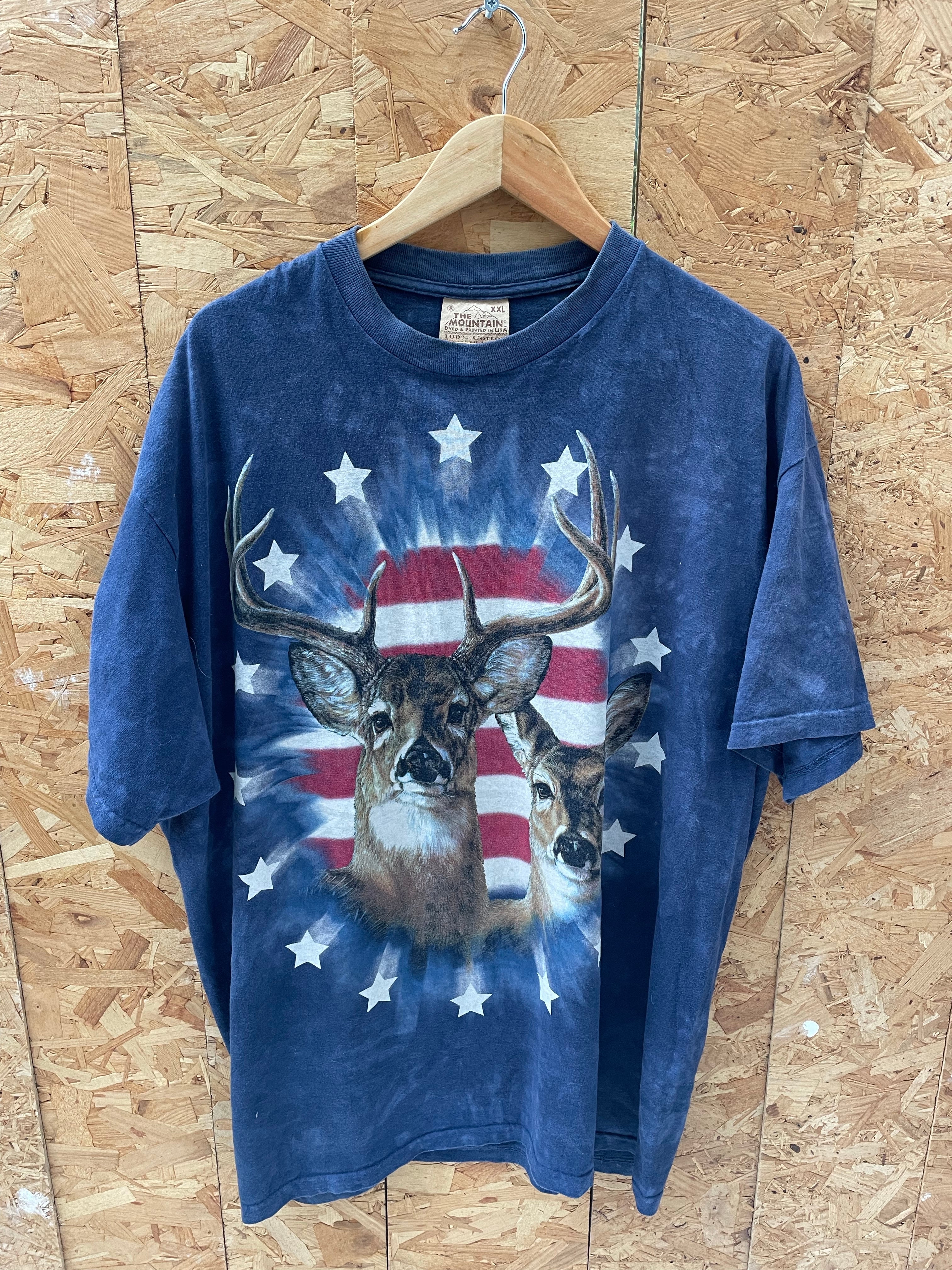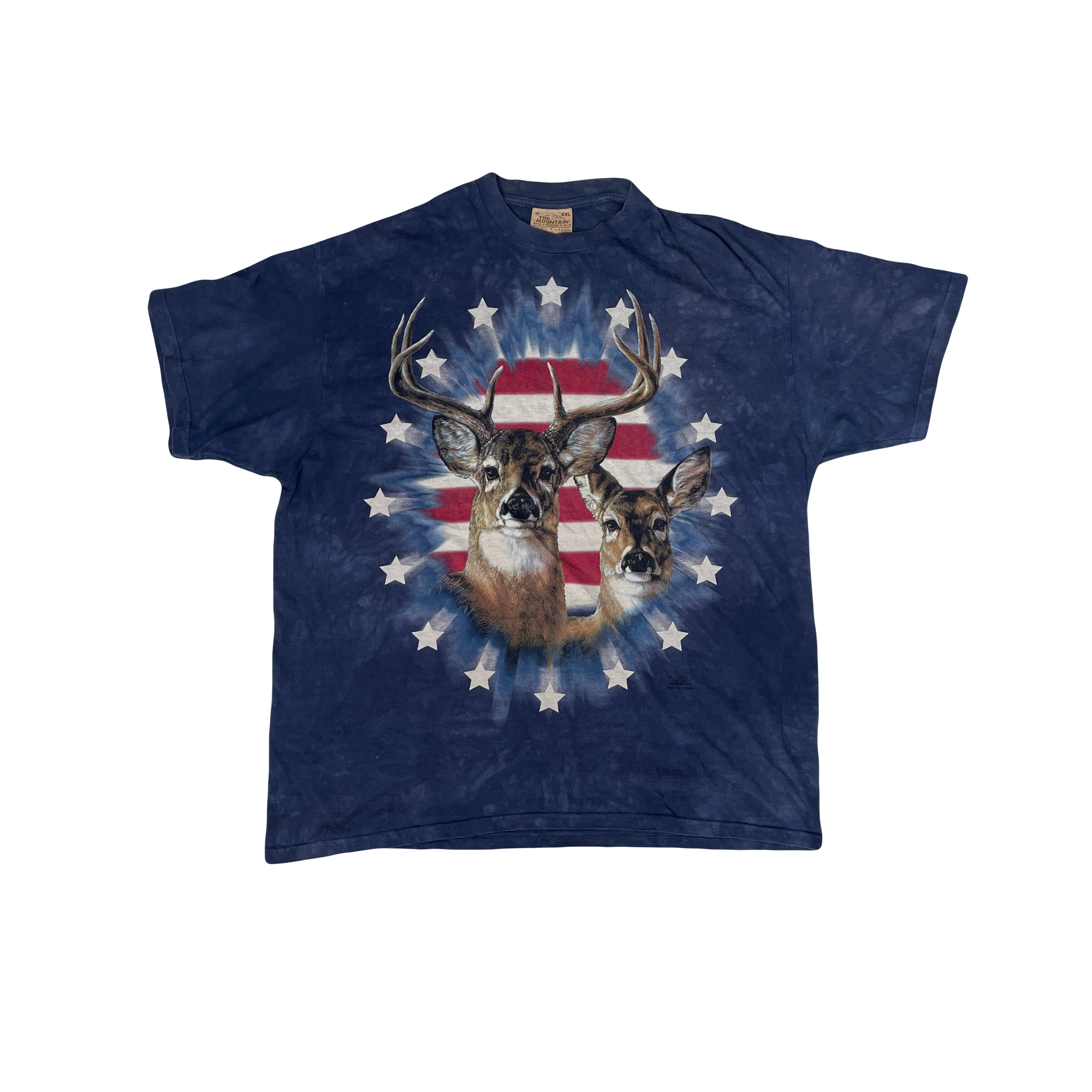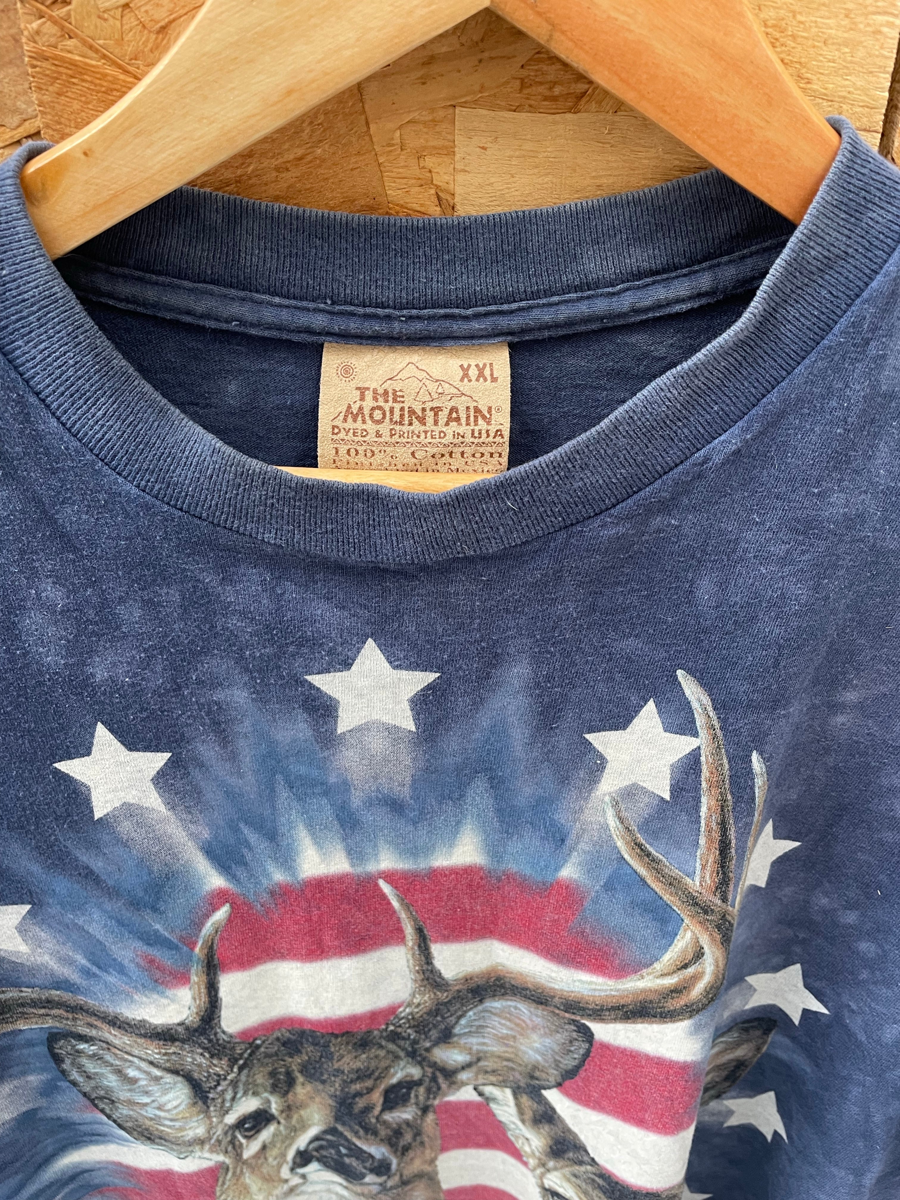 Vintage The Mountain t-shirt, size XXL. Features a unique design of two deer with an American flag backdrop. Dark blue tie-dye style. Great condition for its age. Color: Dark Blue.