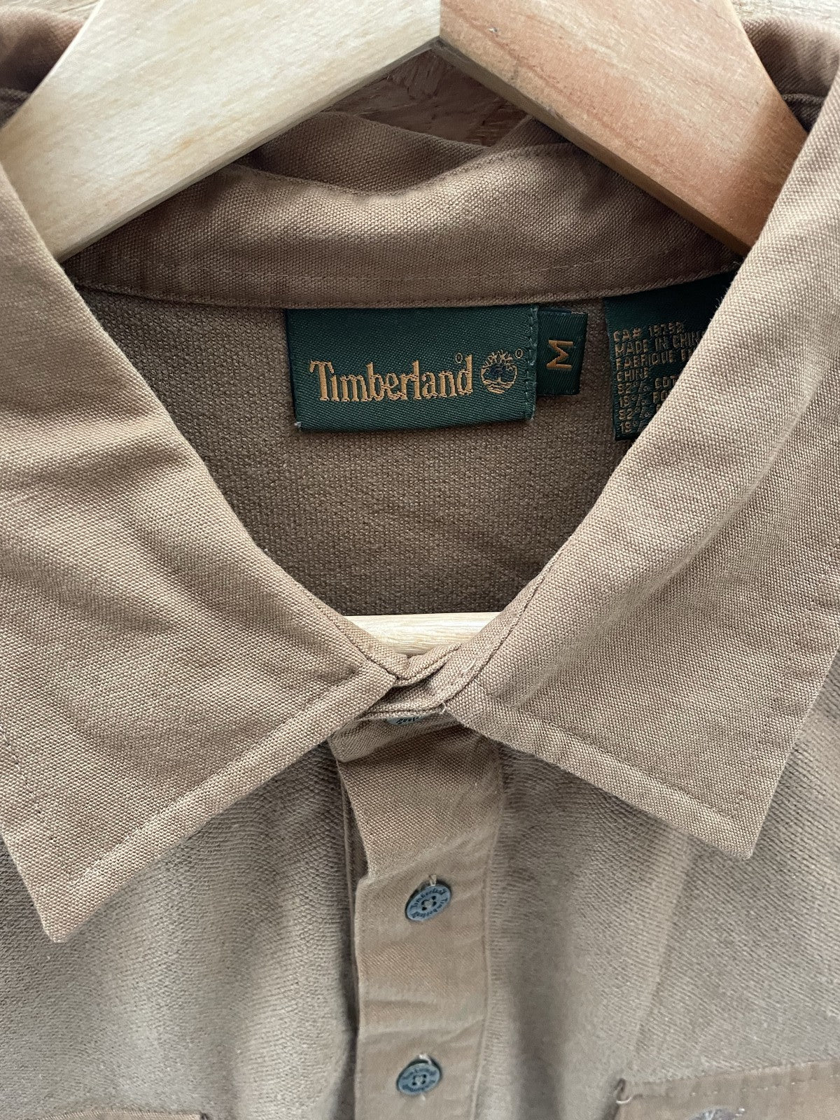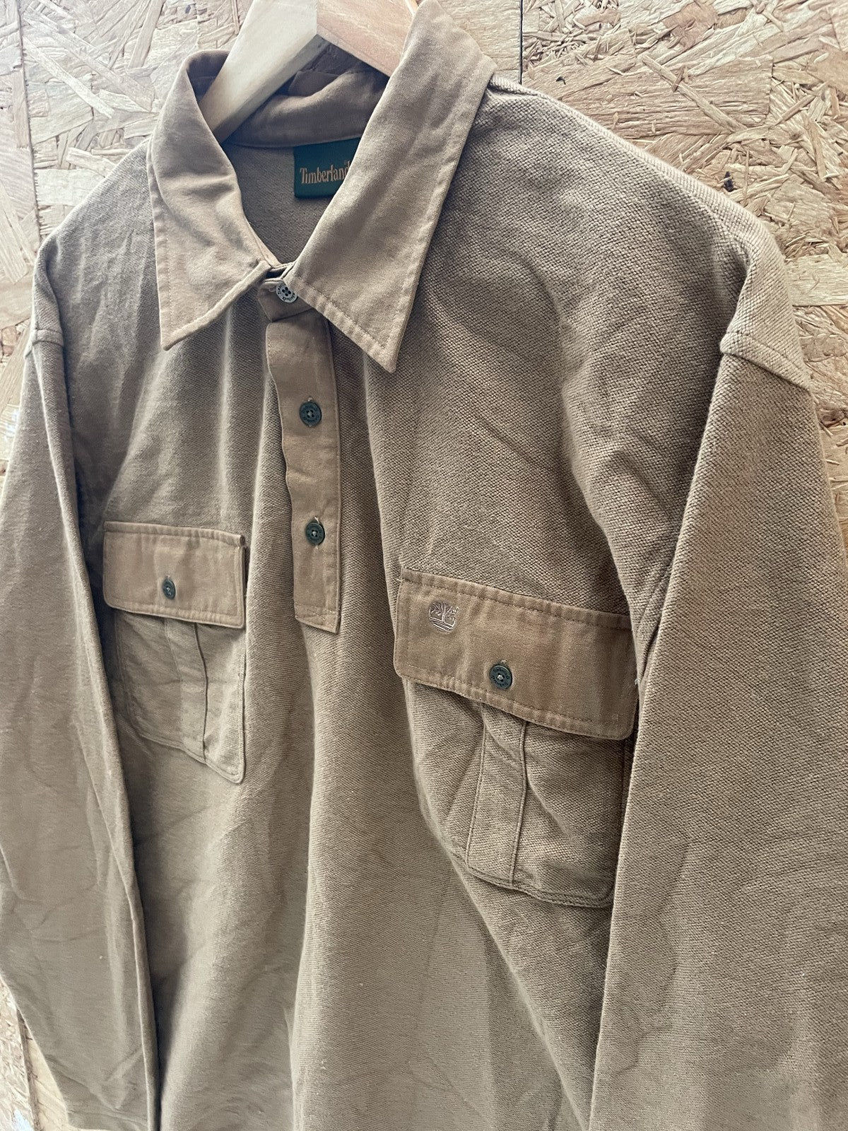 Timberland men's long sleeve polo shirt in a rich brown color. Features a classic collar, button placket, and two chest pockets with button closures. Perfect for casual wear. Size M fits oversized as XL