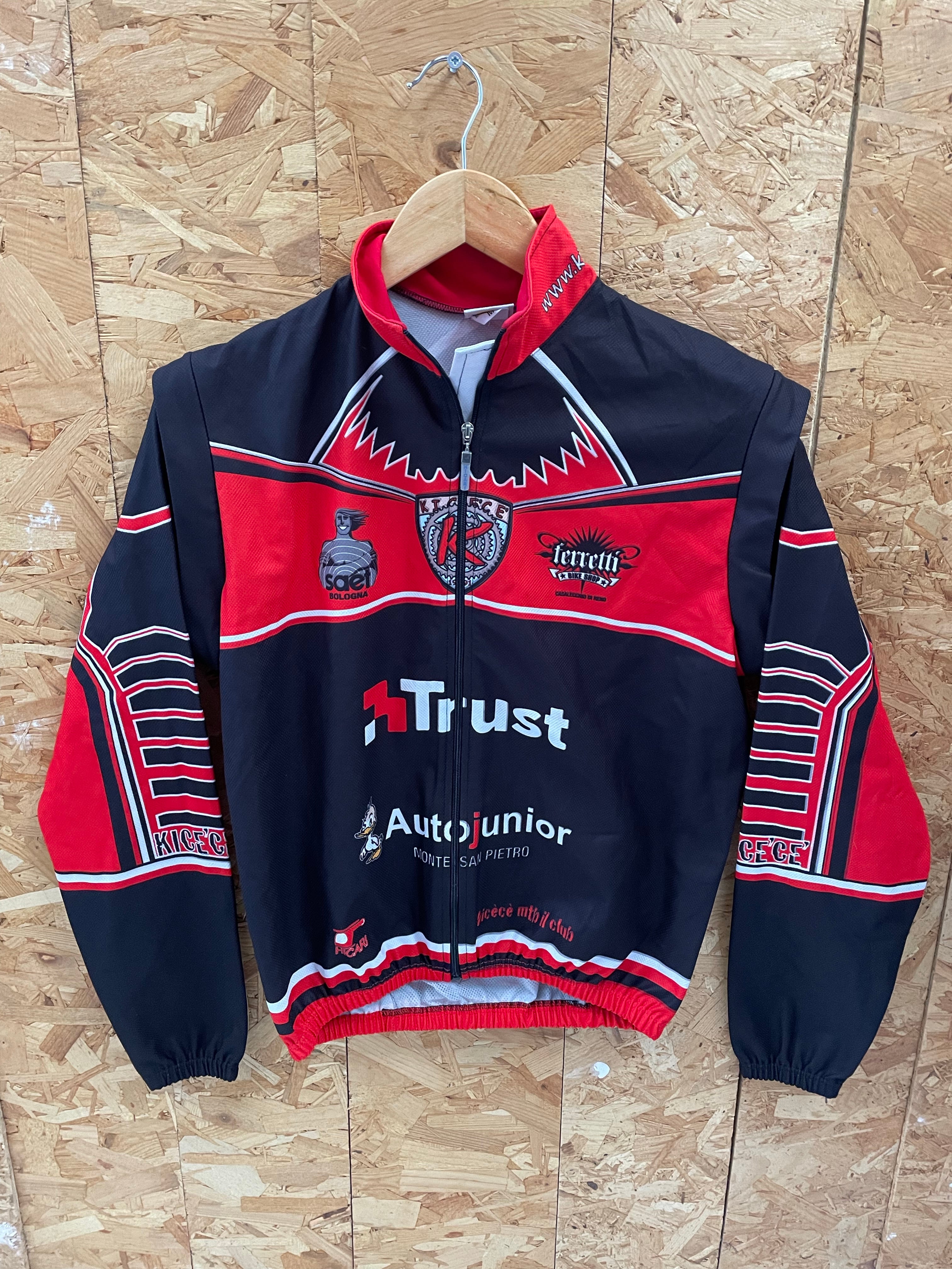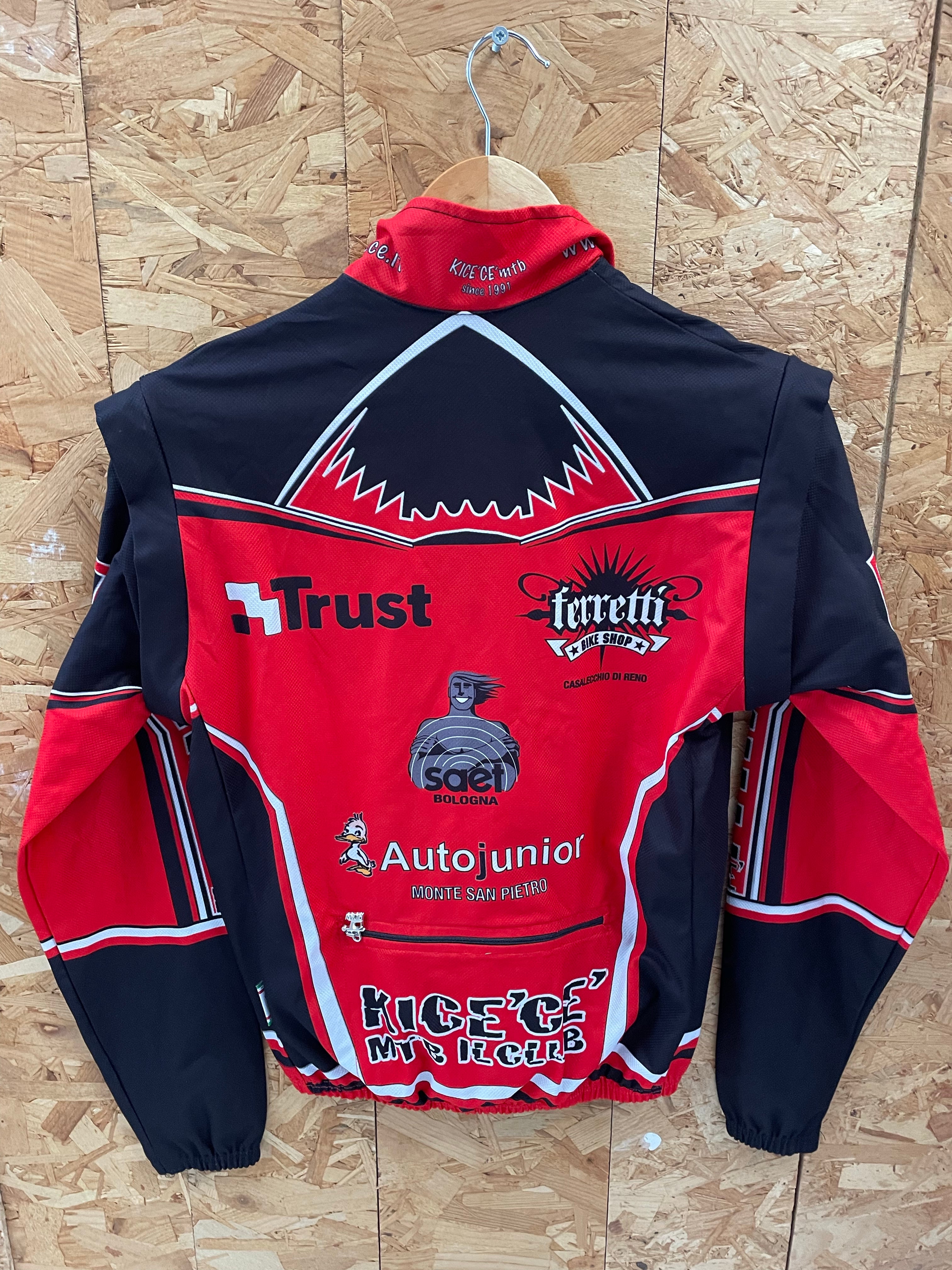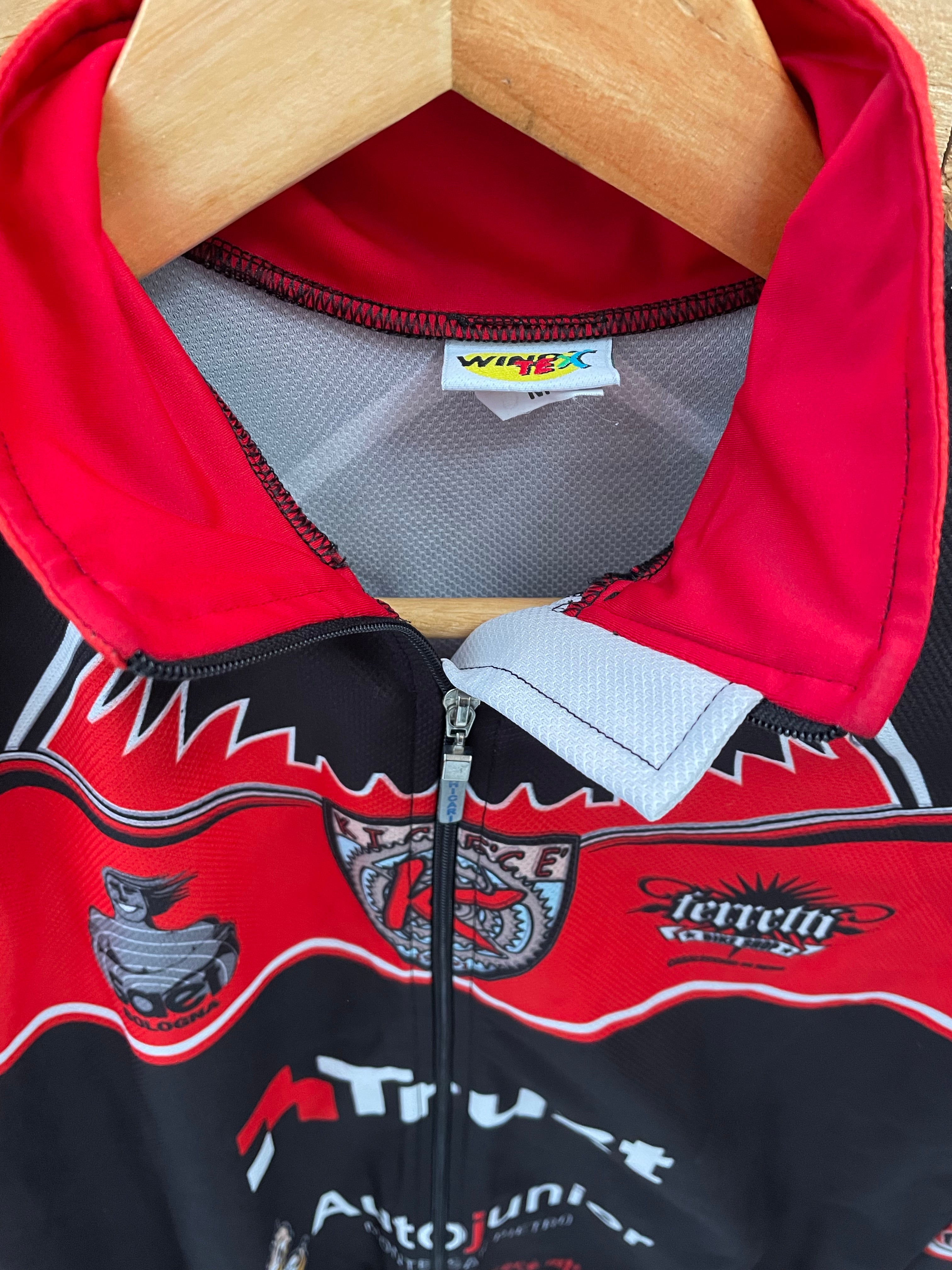 Vintage WindTex cycling jacket in red and black. Features a full zip front, long sleeves, and a sporty design with various sponsor logos. Perfect for cycling enthusiasts or as a retro sportswear piece. No visible signs of wear. Color: Red/Black. Size: M