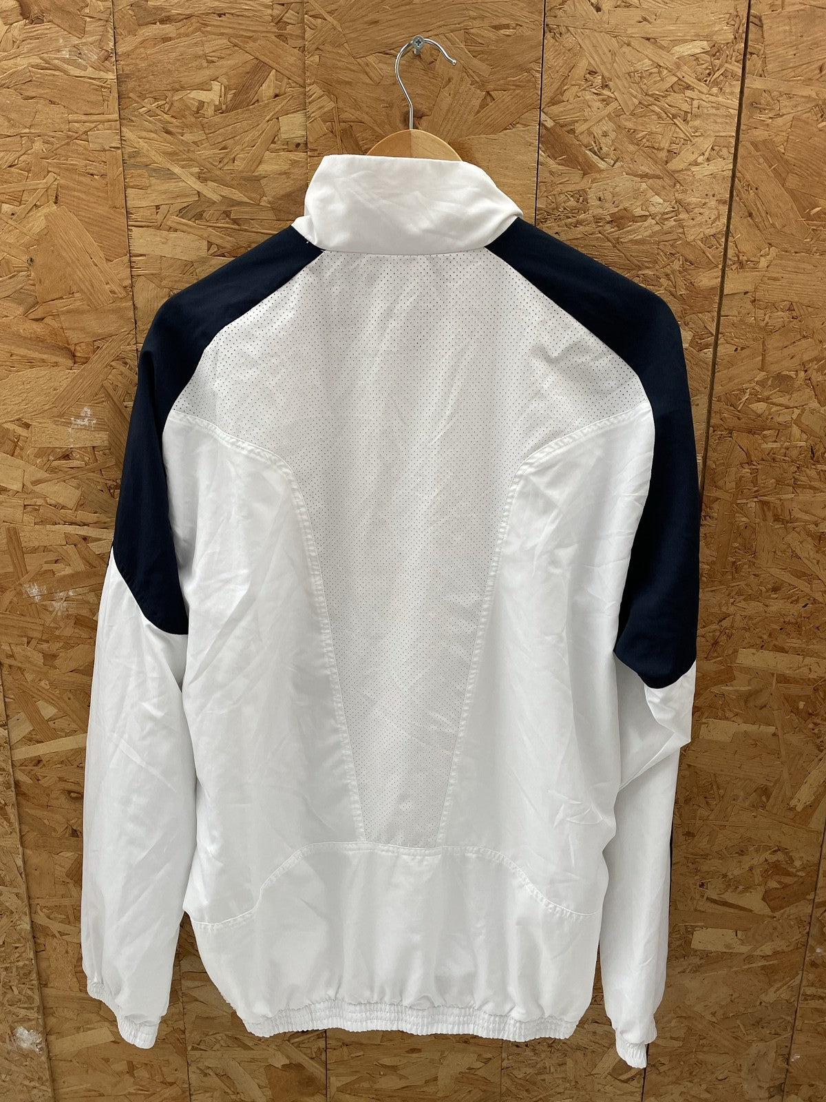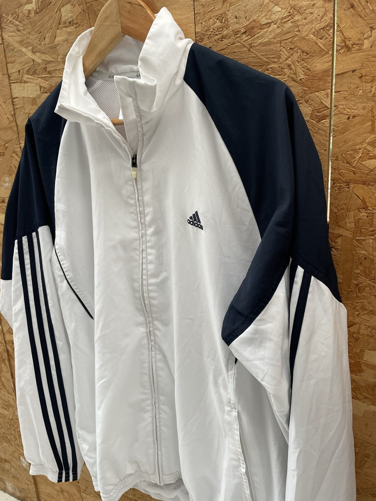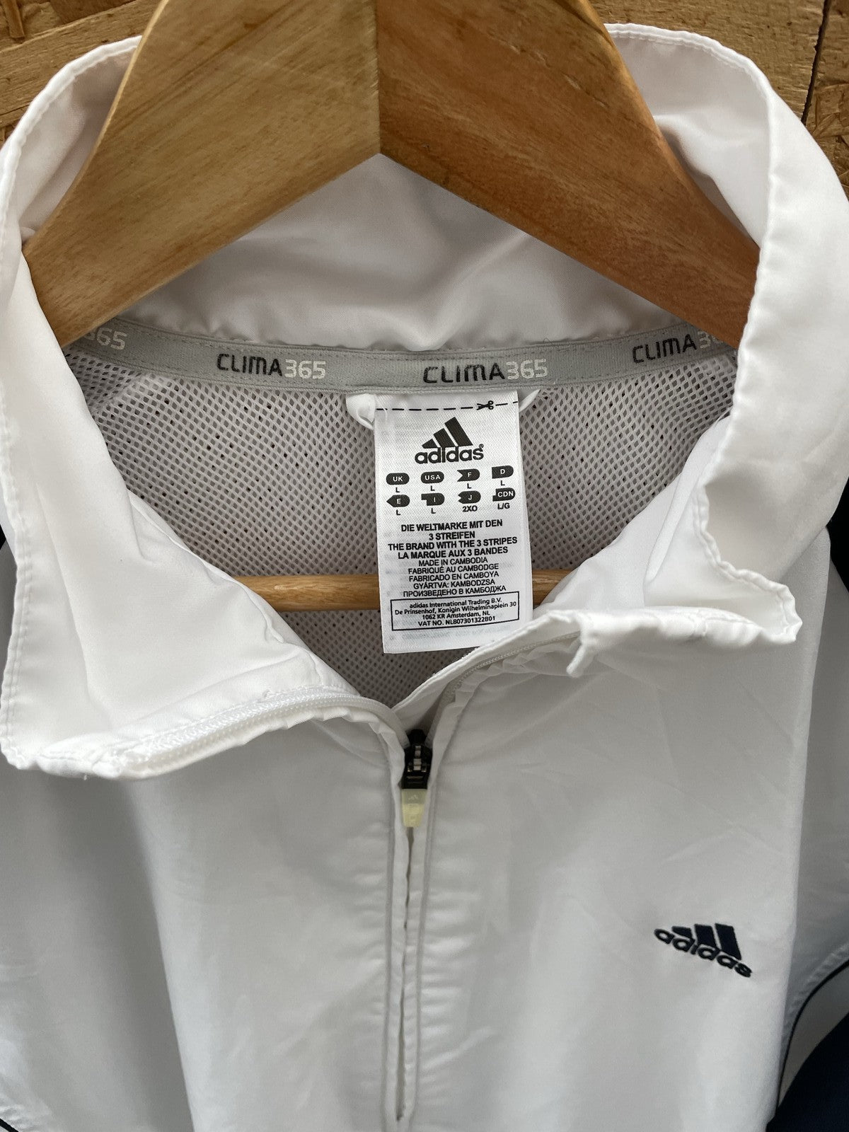 Vintage Adidas Clima365 track jacket. Features a white body with navy blue accents and the iconic three stripes on the sleeves. Lightweight and breathable, perfect for athletic or casual wear. Excellent condition,