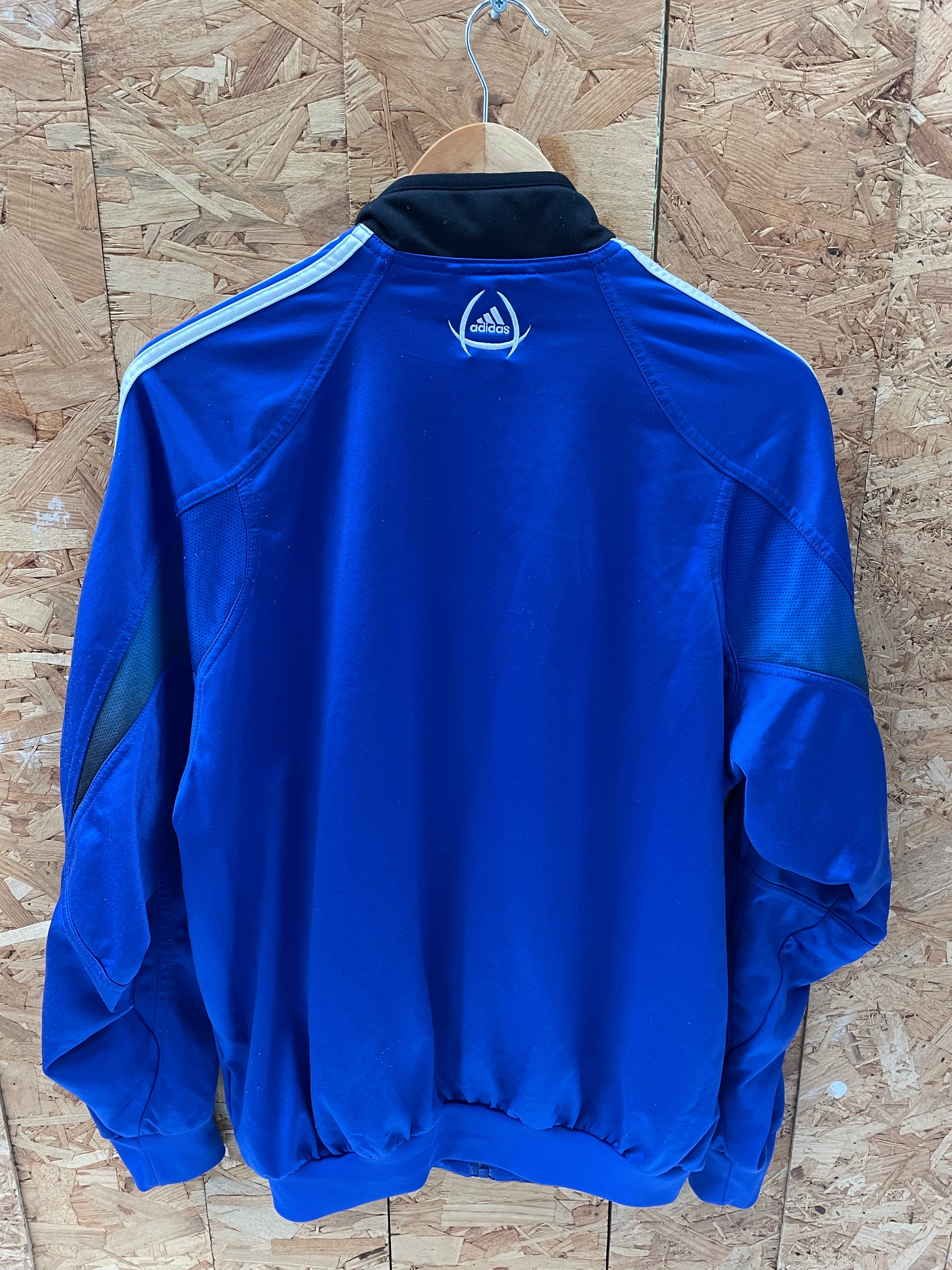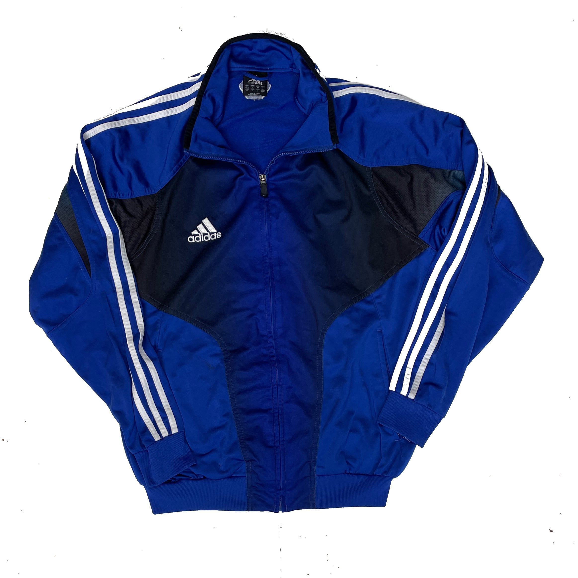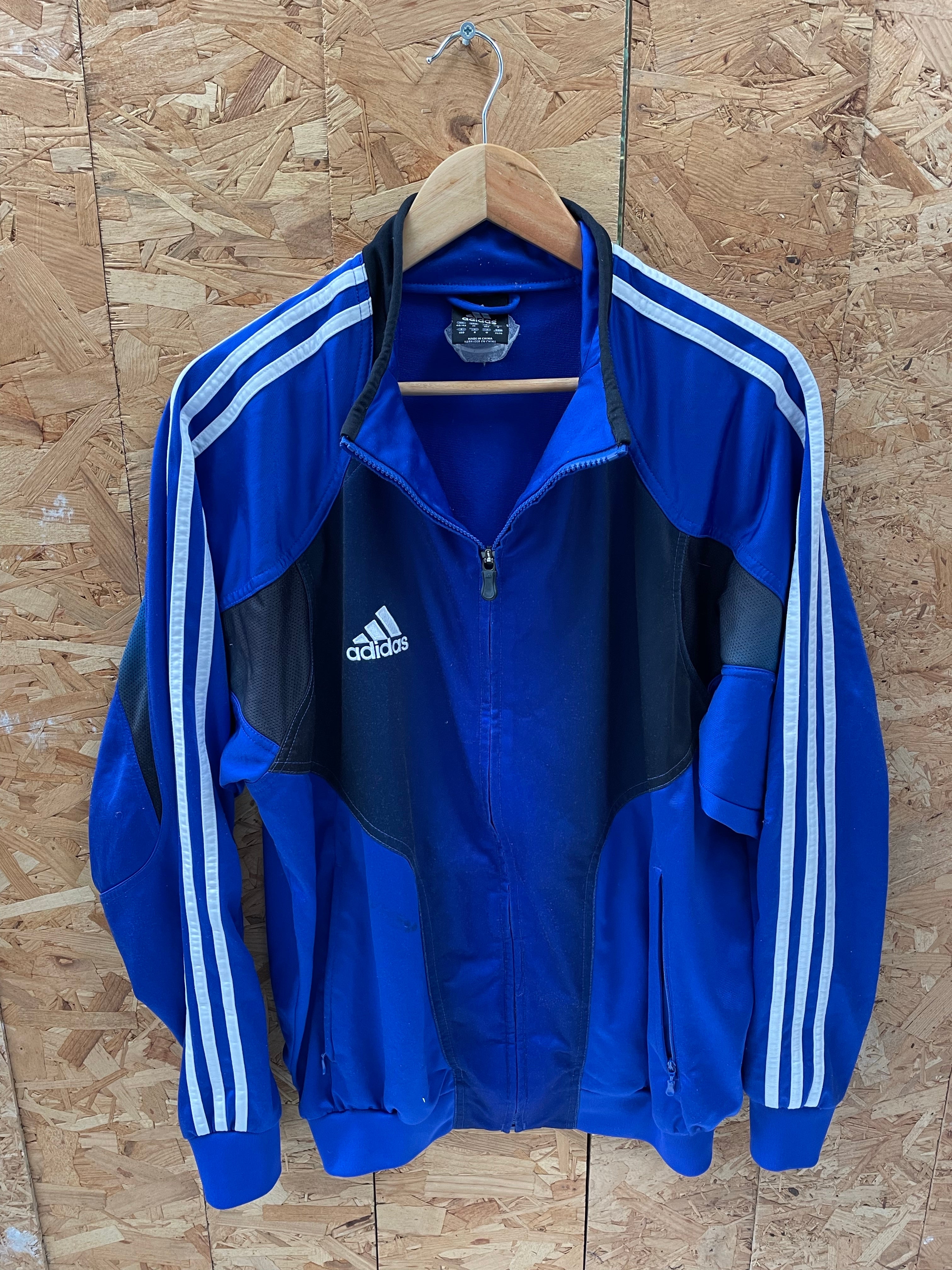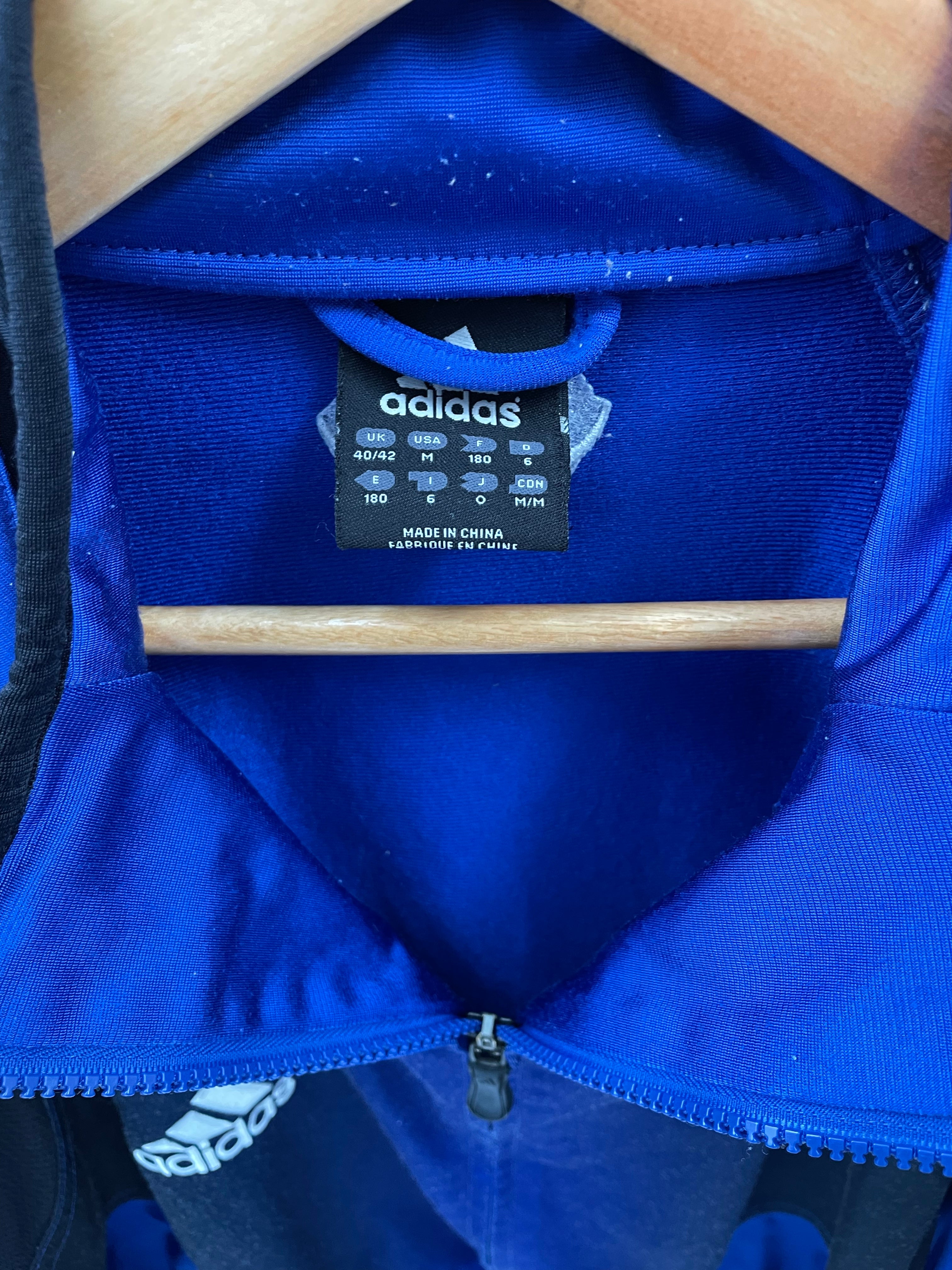 Adidas men's track jacket, size M, blue with white stripes and black accents. Full zip closure. Good condition. Classic Adidas style. Color: Blue.