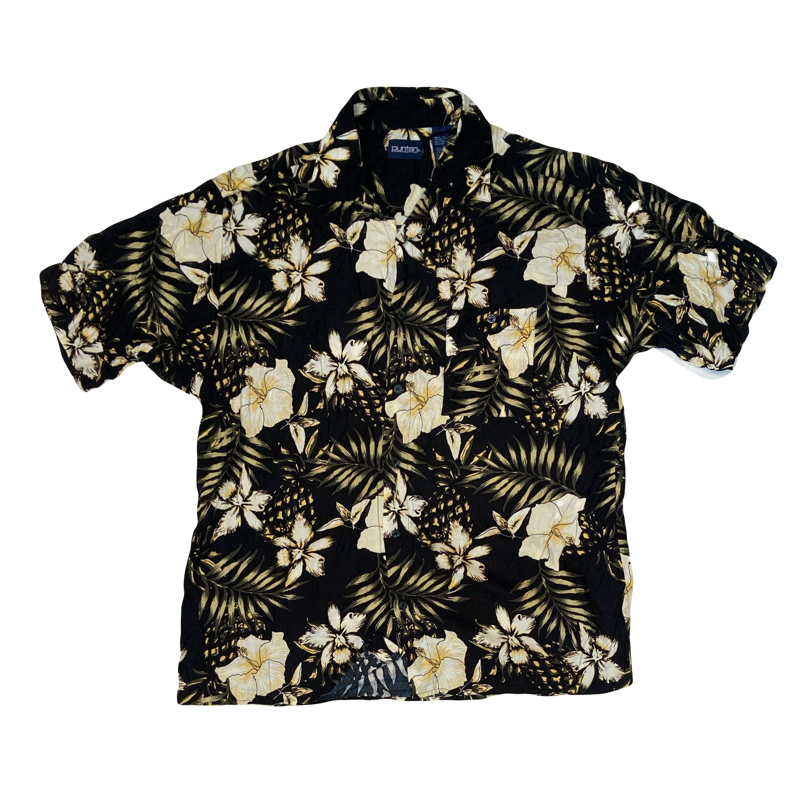 Vintage Y2K black magnolia hibiscus pattern rayon Hawaiian shirt size large by Puritan