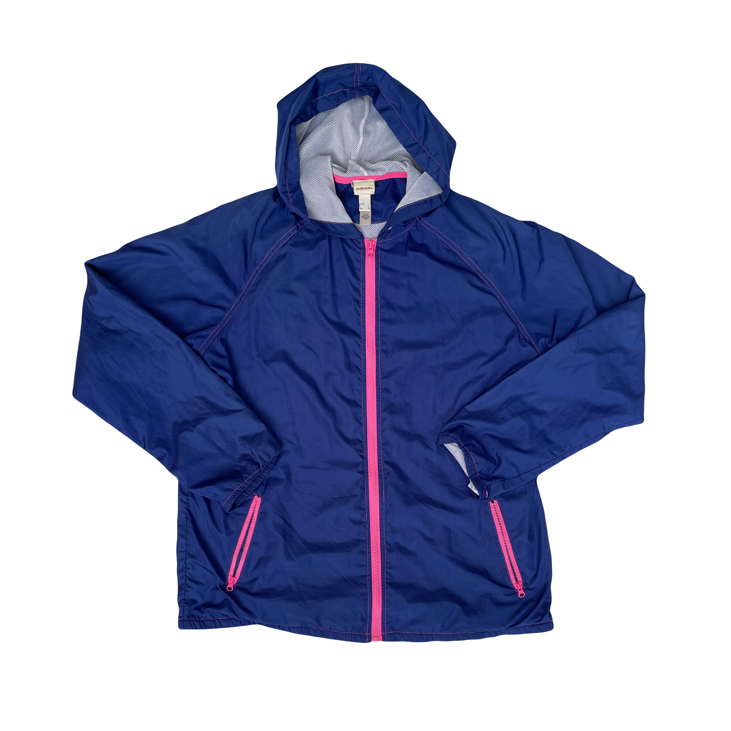 Diesel women's hooded windbreaker jacket. Size L. Blue with pink accents and graphic print on the back. Zip front closure. drawstring missing from hood. Good condition.
