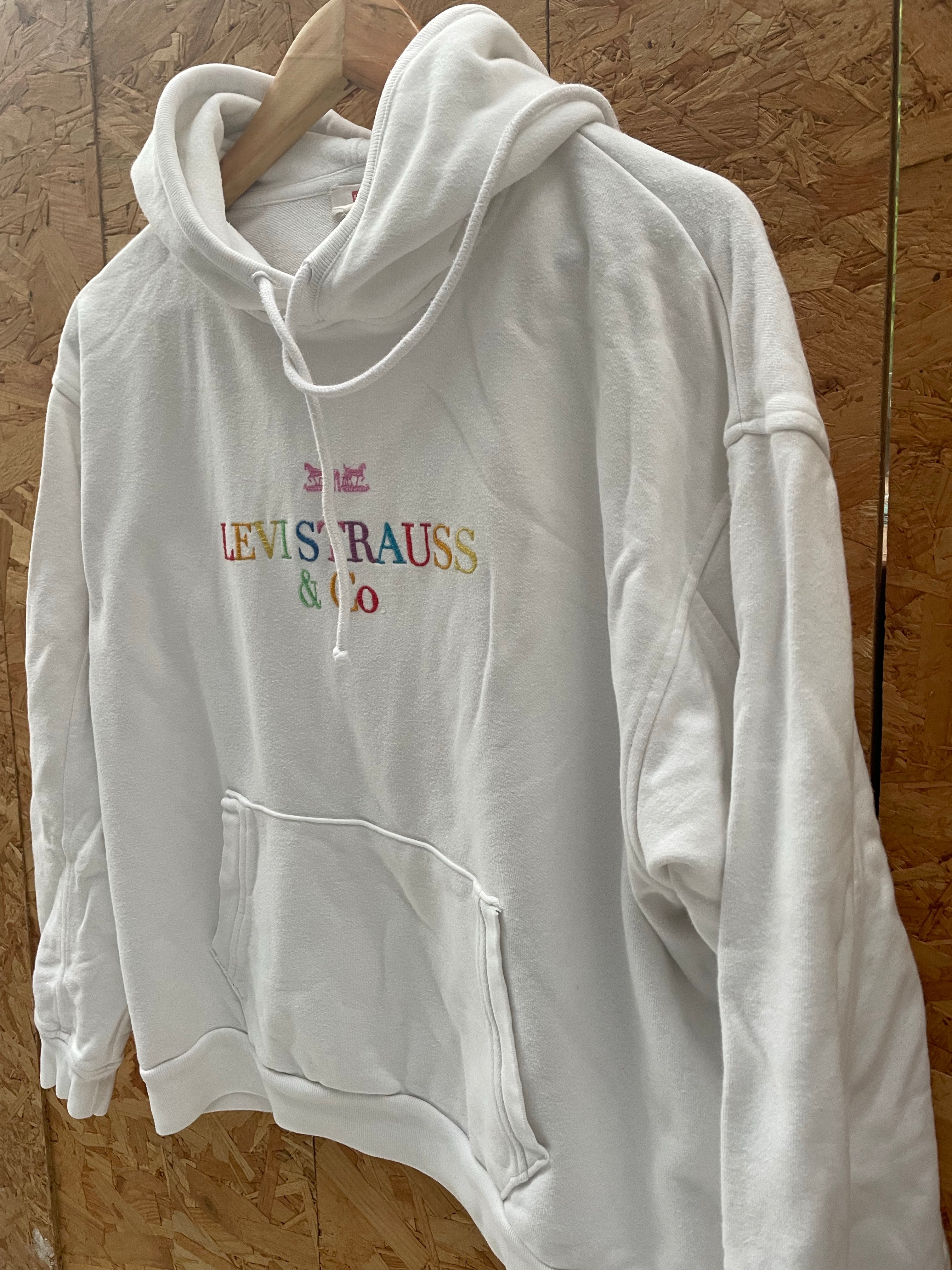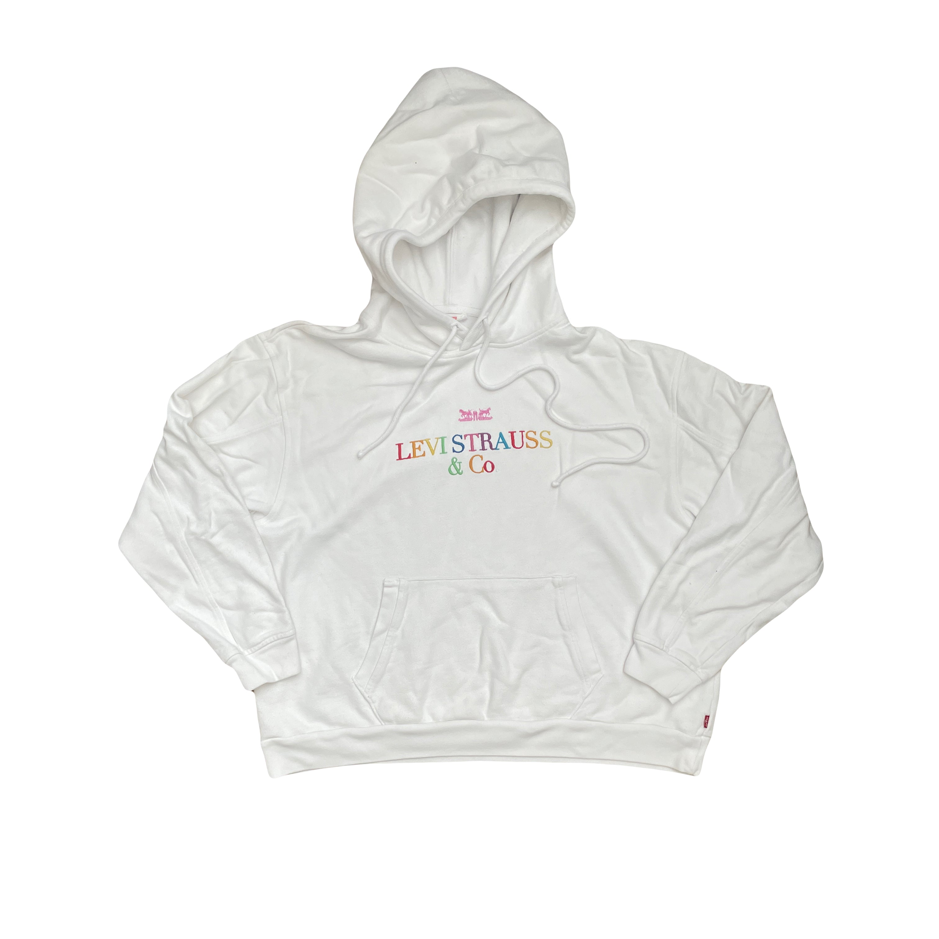 This Levi Strauss & Co. hoodie sweatshirt is white with a colorful rainbow embroidered logo graphic. It features a drawstring hood and a front kangaroo pocket. Perfect for casual wear. slouchy boxy wide fit.